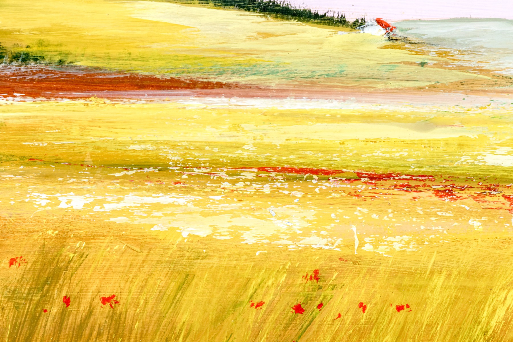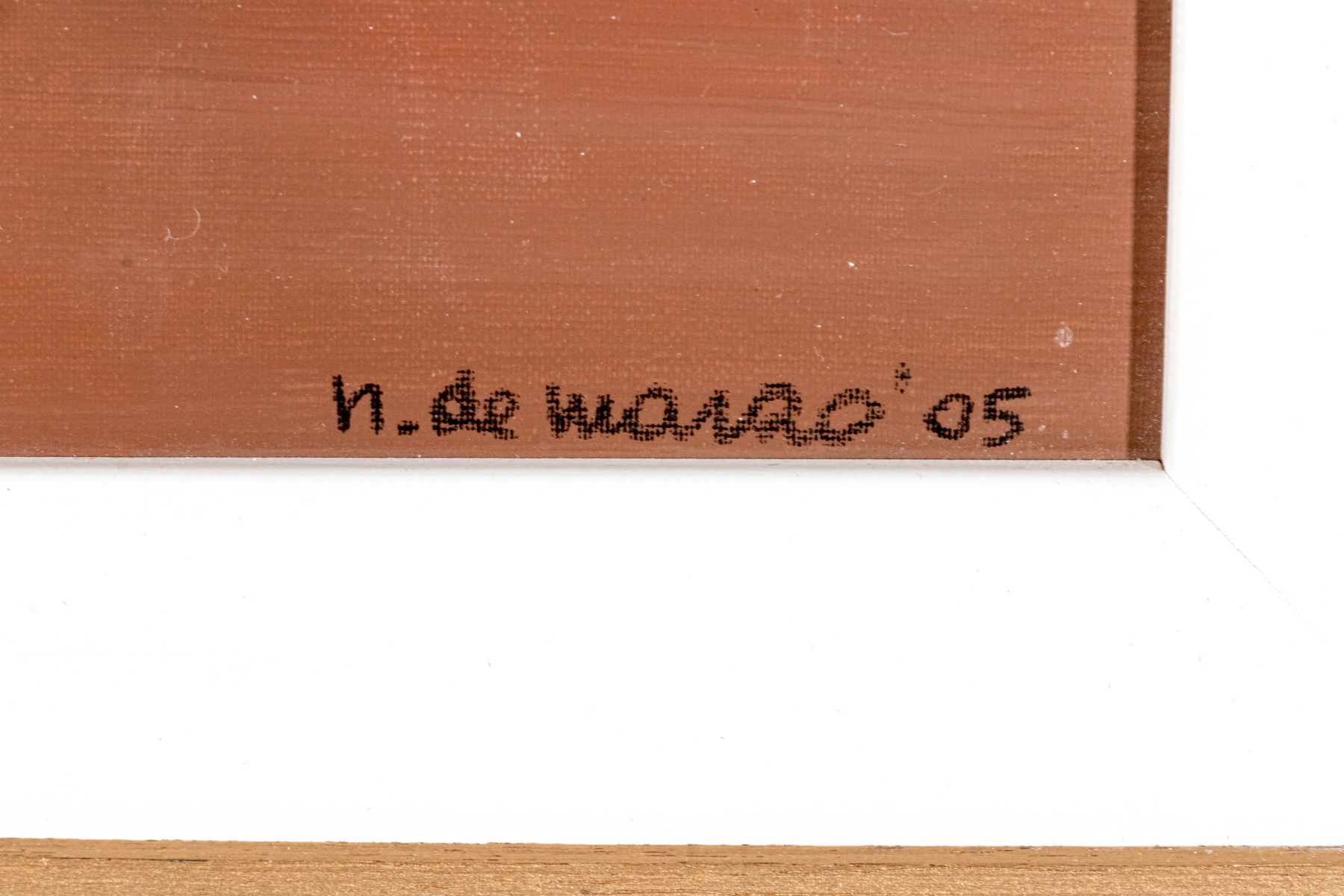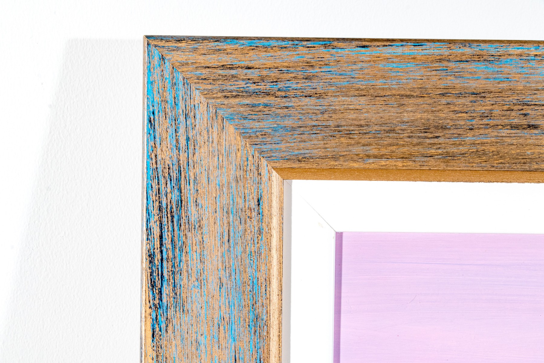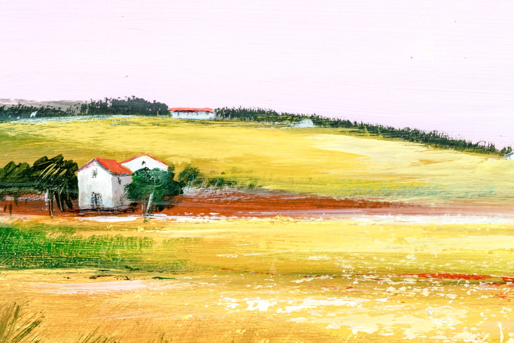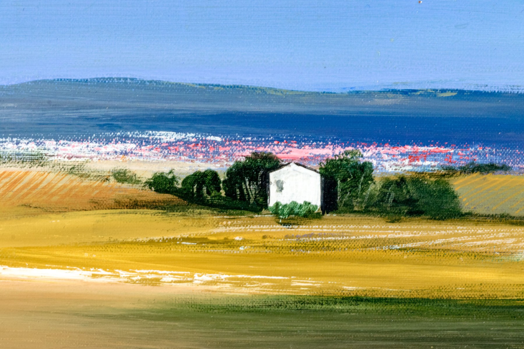 A duo of Italian oil paintings depicting calming pastoral landscapes with rural homesteads along golden fields, one titled "Periferia" on the verso. Both signed appearing "n. de marzo." and dated 2004 and 2005. Displayed matted without glass in matching wood frames with rustic teal blue stripped paint finishes.