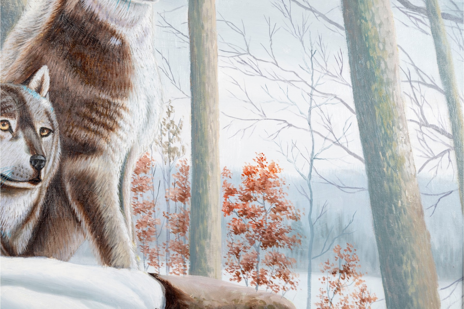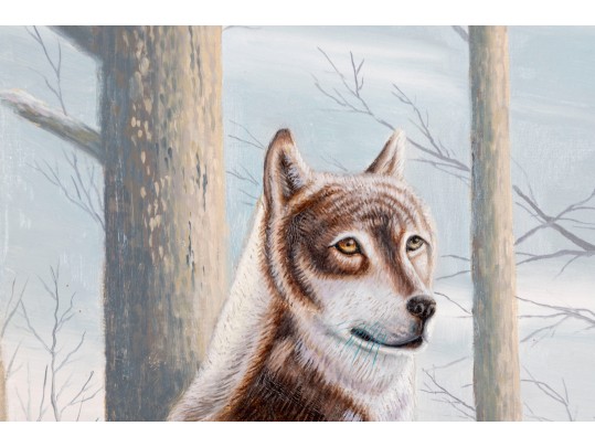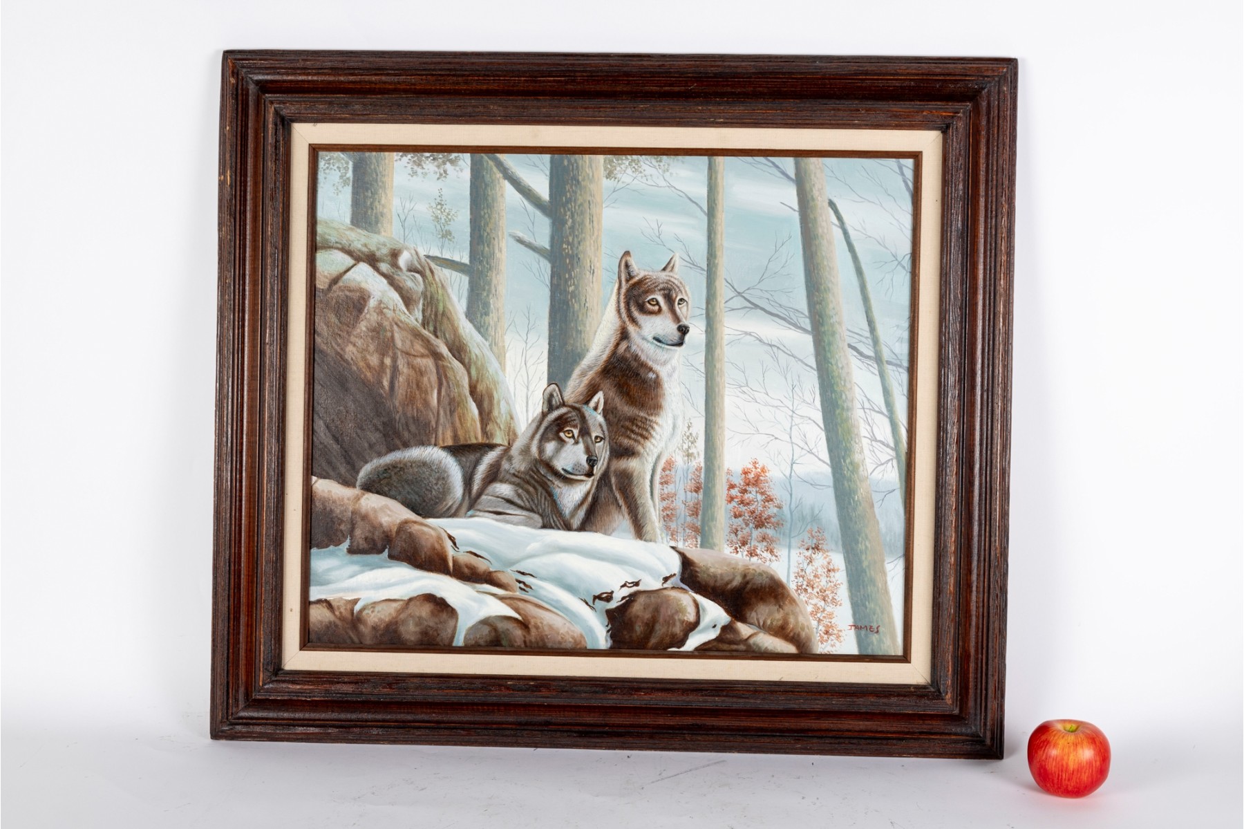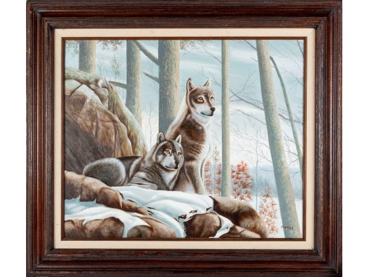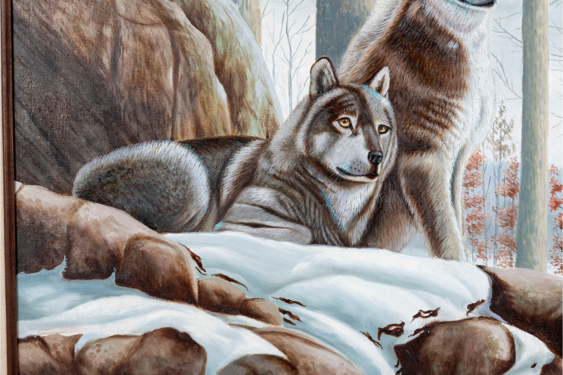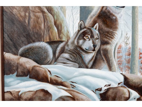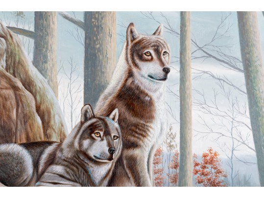 A wonderful oil painting on canvas Kevin T. Daniel (American [MN], 1951-2022) "Pine Ridge" depicting two wolves sitting on a rocky ledge covered with snow overlooking trees with vibrant orange foliage opening to a snowy field in the background. Signed "James" lower right.