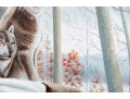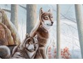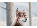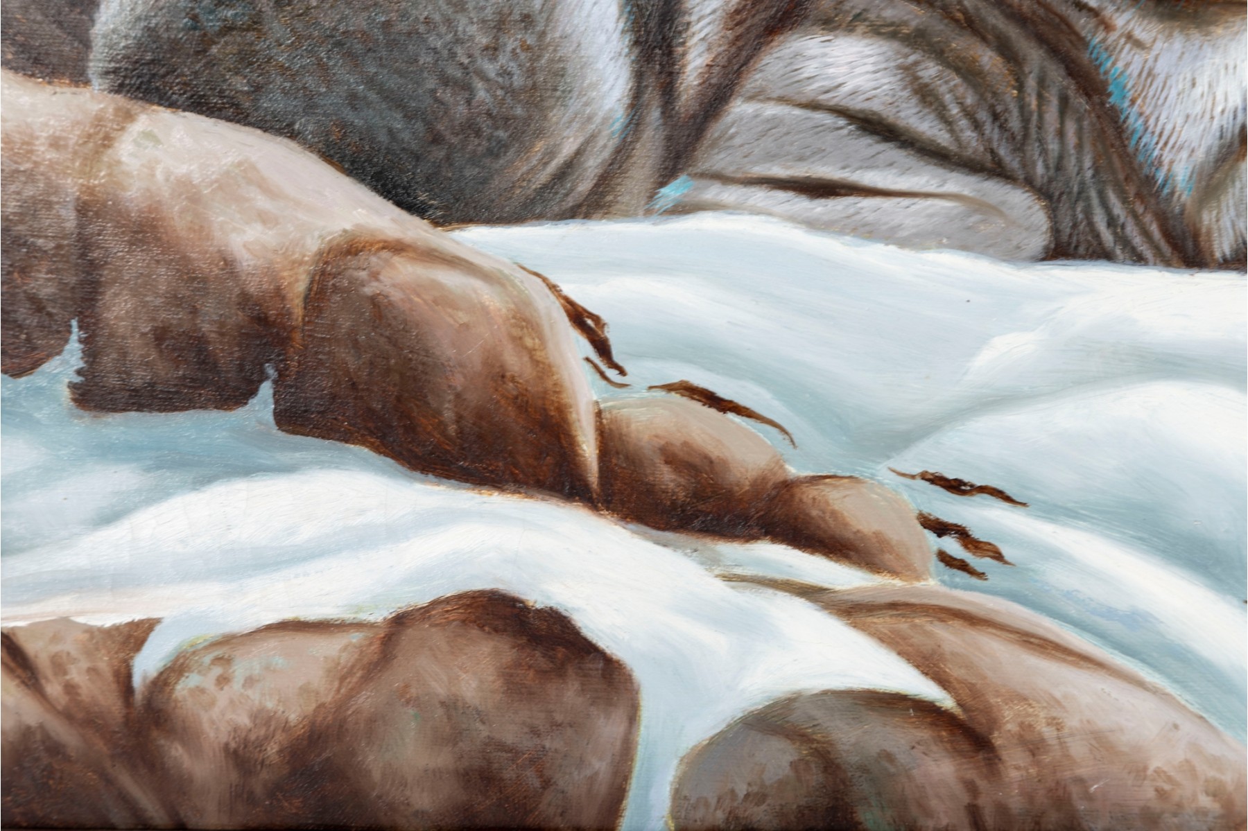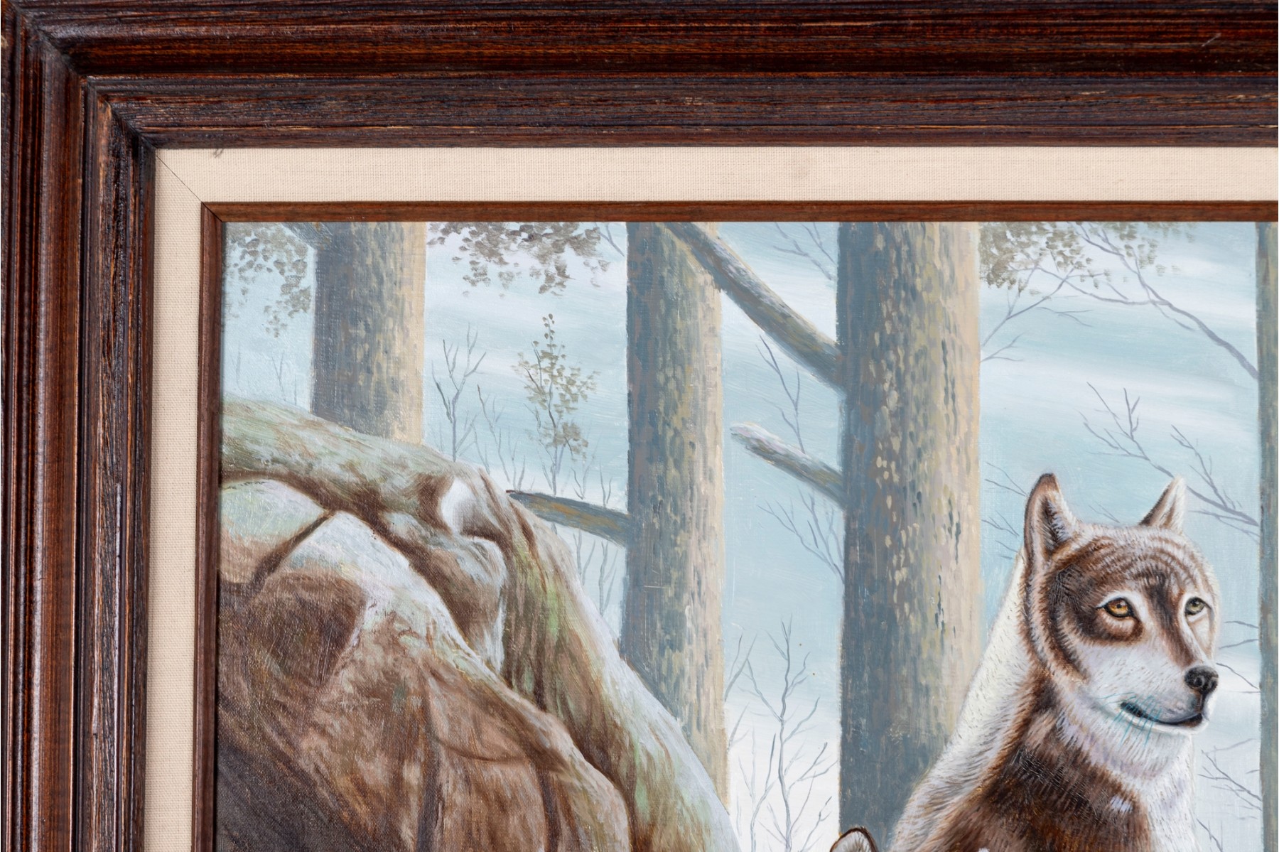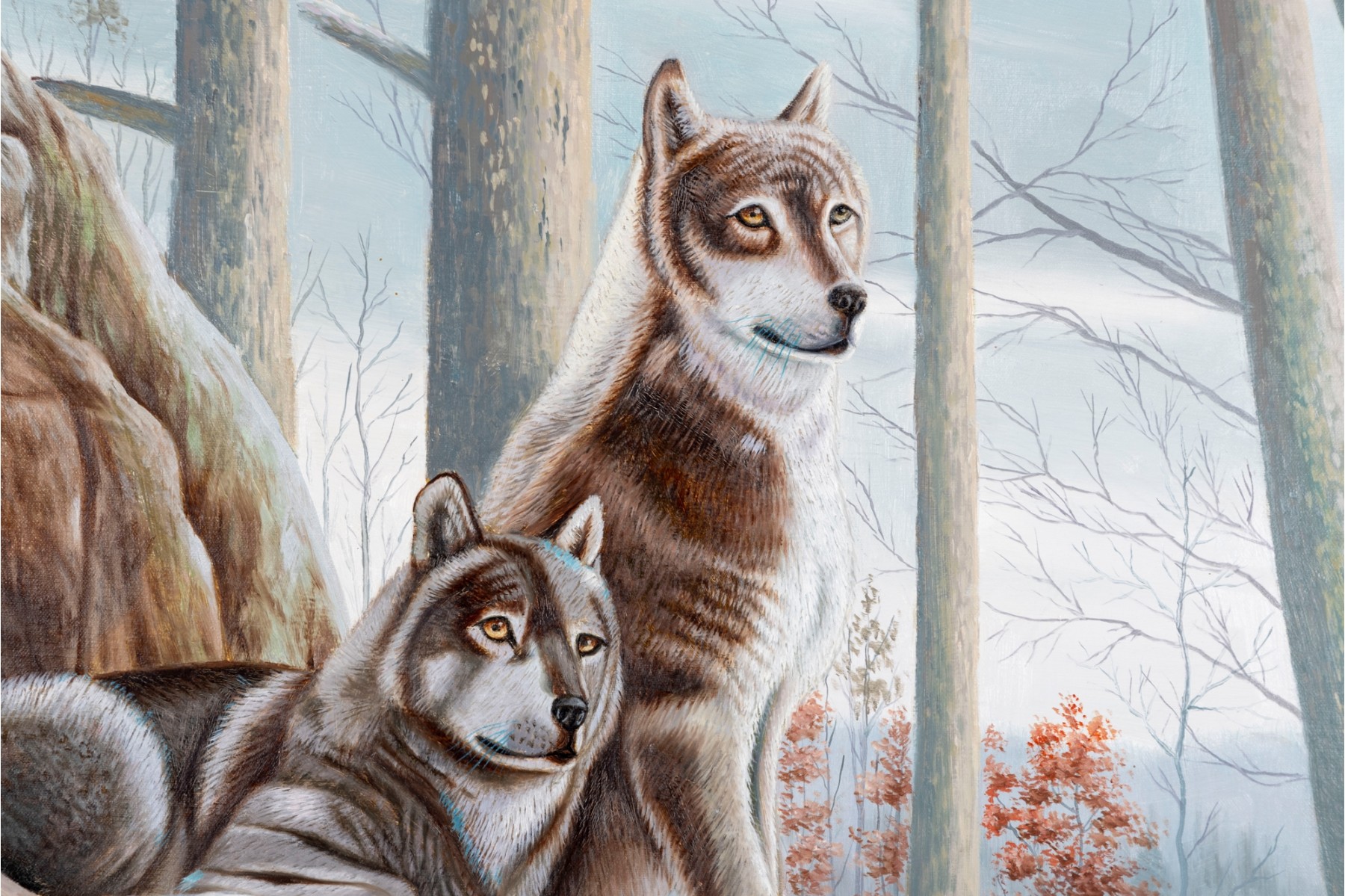 A wonderful oil painting on canvas Kevin T. Daniel (American [MN], 1951-2022) "Pine Ridge" depicting two wolves sitting on a rocky ledge covered with snow overlooking trees with vibrant orange foliage opening to a snowy field in the background. Signed "James" lower right.