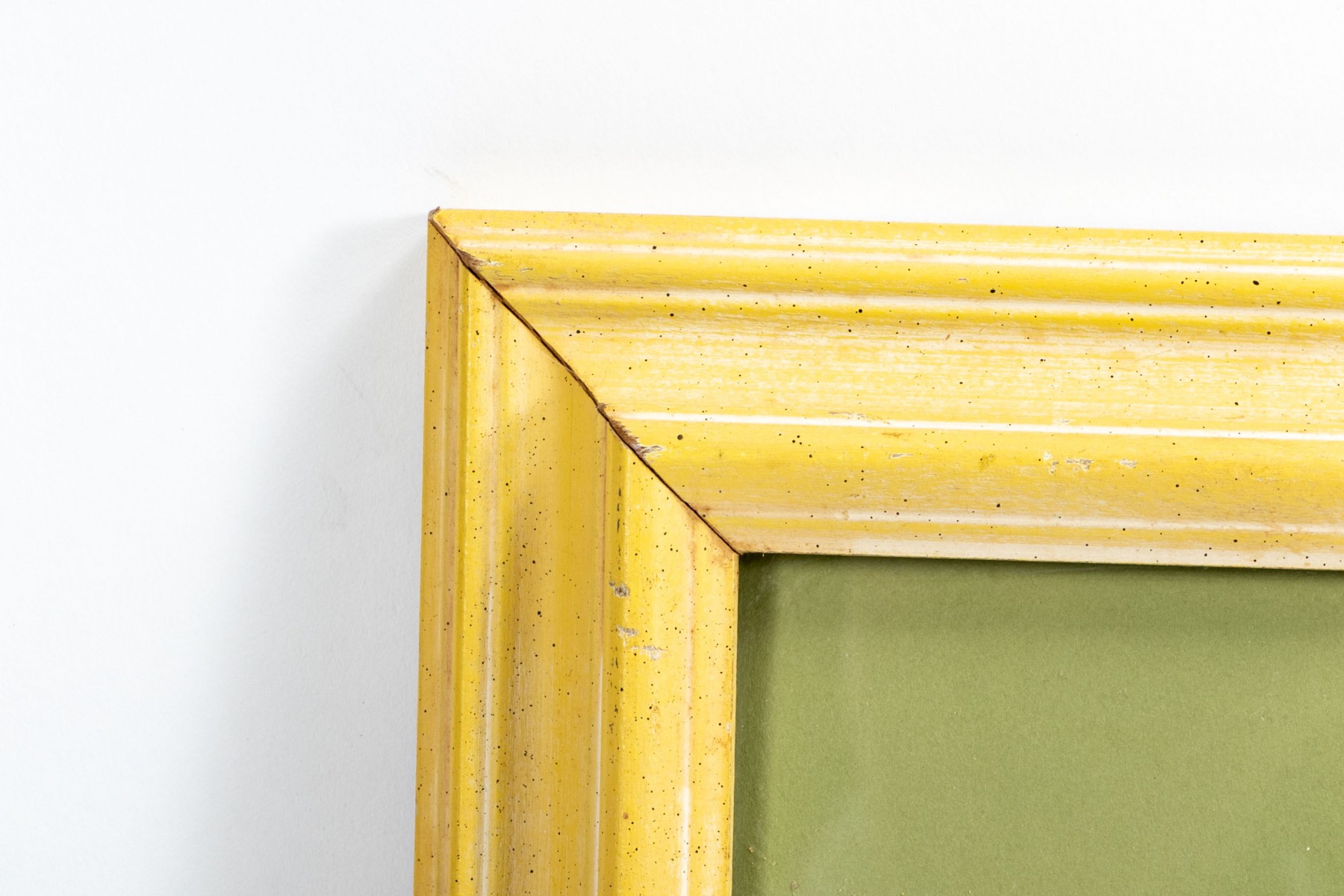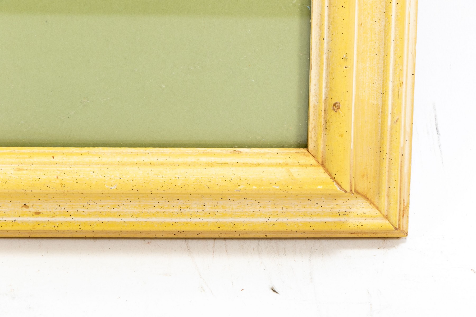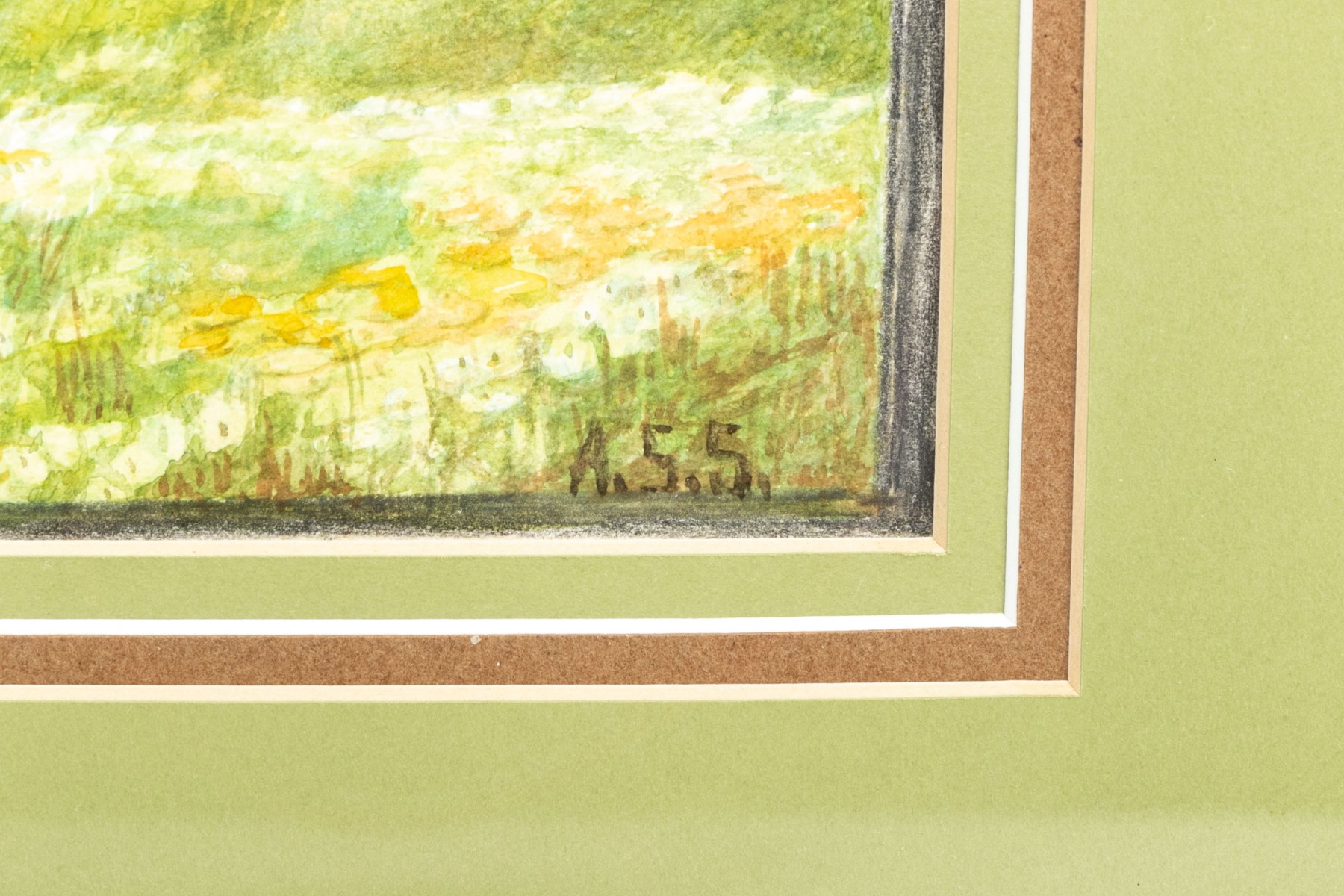 A landscape watercolor depicting rolling hills with trees with mountains in the distance. Signed 'A.S.S.' lower right and matted behind glass in a buttercup finish frame.