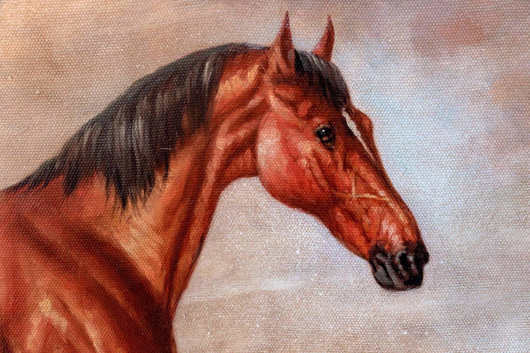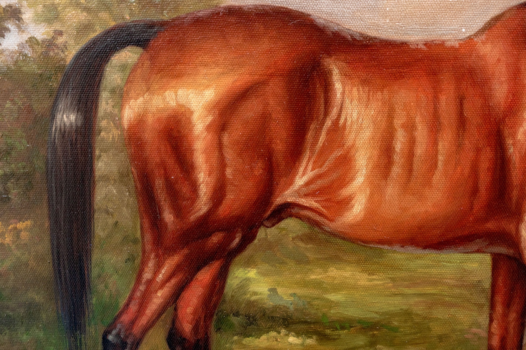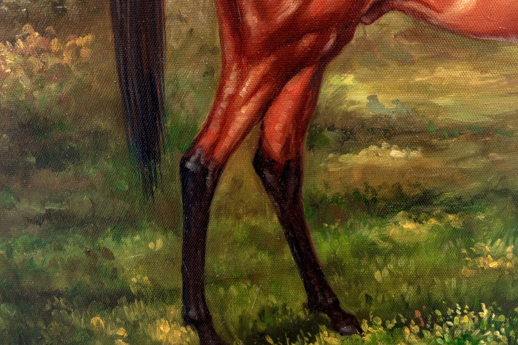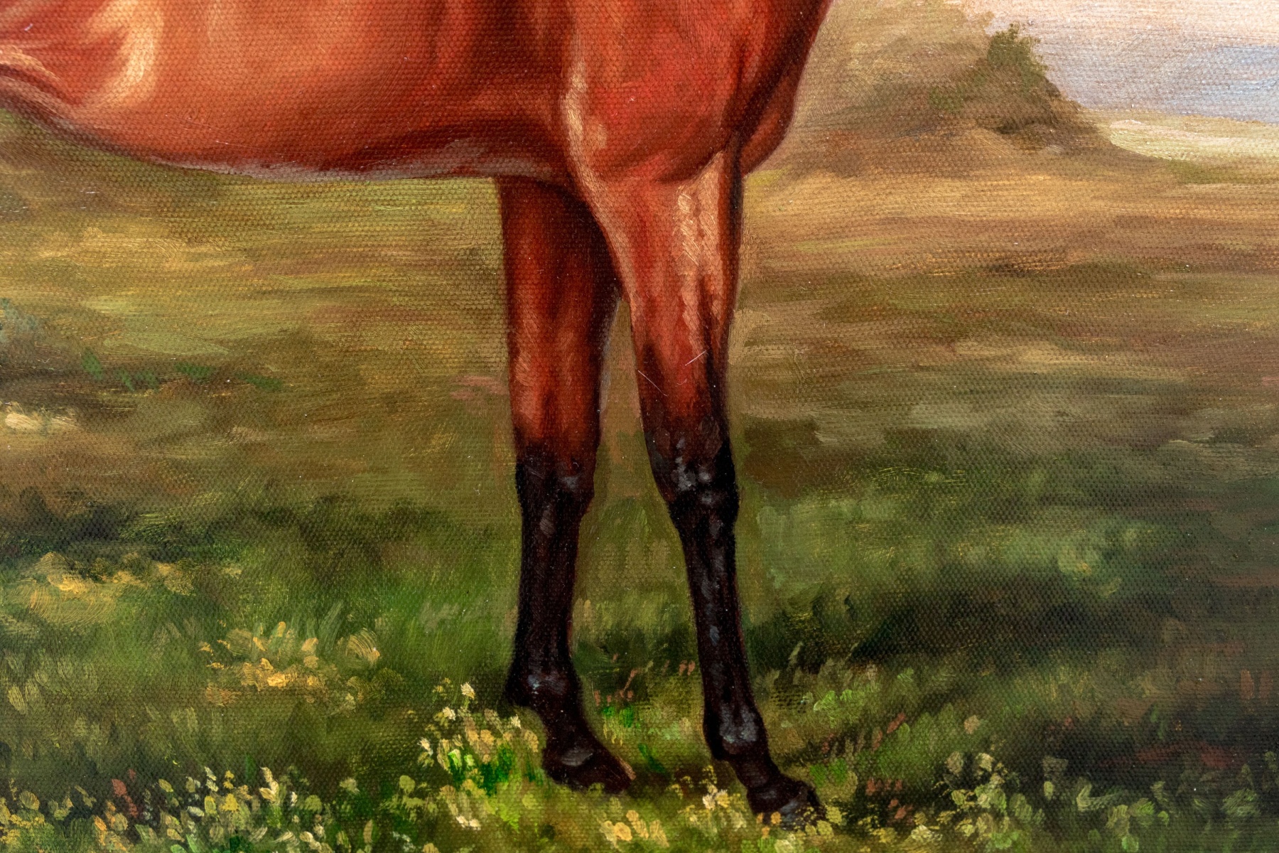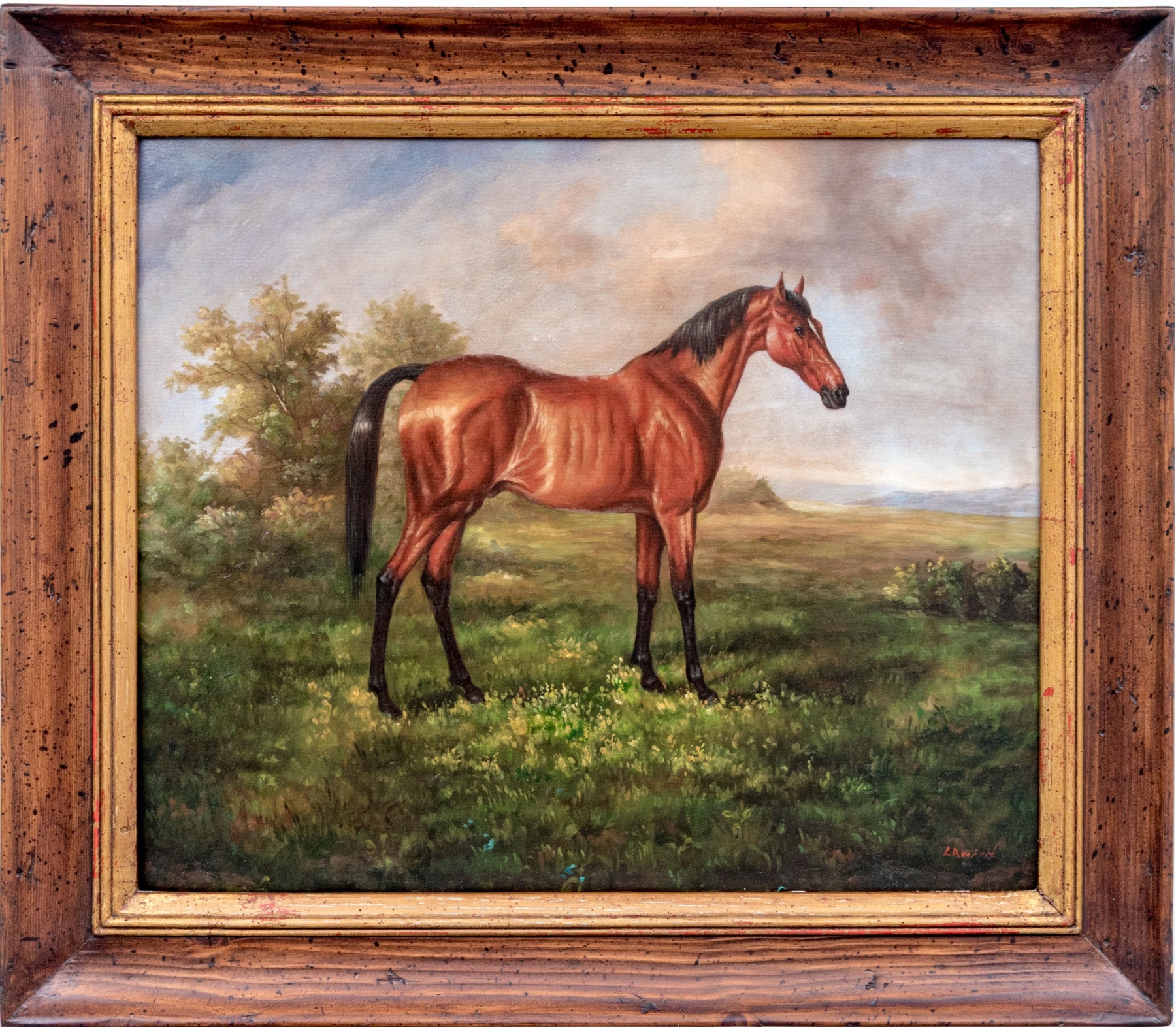 A finely rendered oil painting on canvas depicting a bay horse in profile standing in a lush, natural landscape. The traditional composition draws the eye to the horses impressive and vibrant red-brown coat and well maintained black hair, with great detail on the horse's muscles. Gesturally dappled pops of yellow and brown in the grass adds to the natural appeal, with tall brush along the mid-ground leading into pale blue mountains in the distance beneath a clouded sky. Signed Lawson lower right.