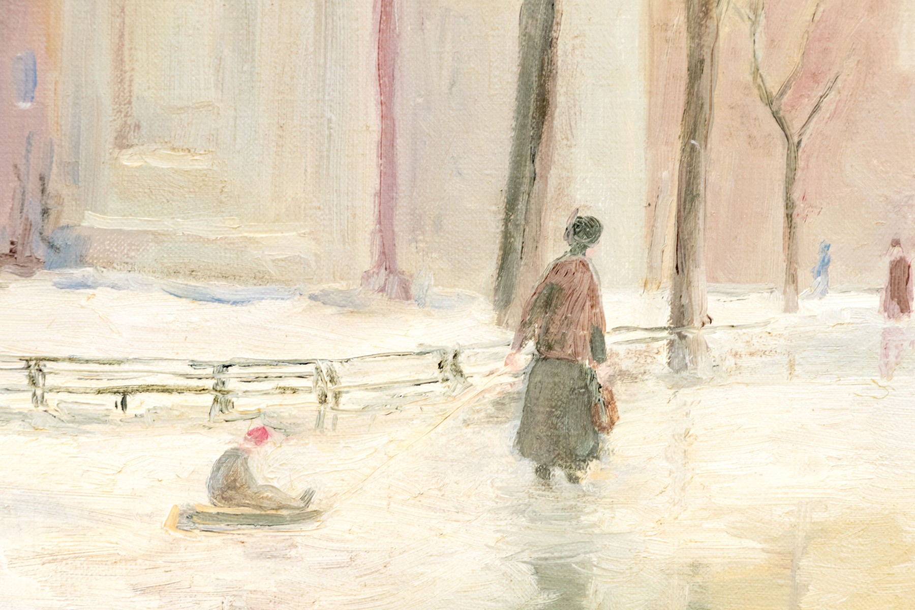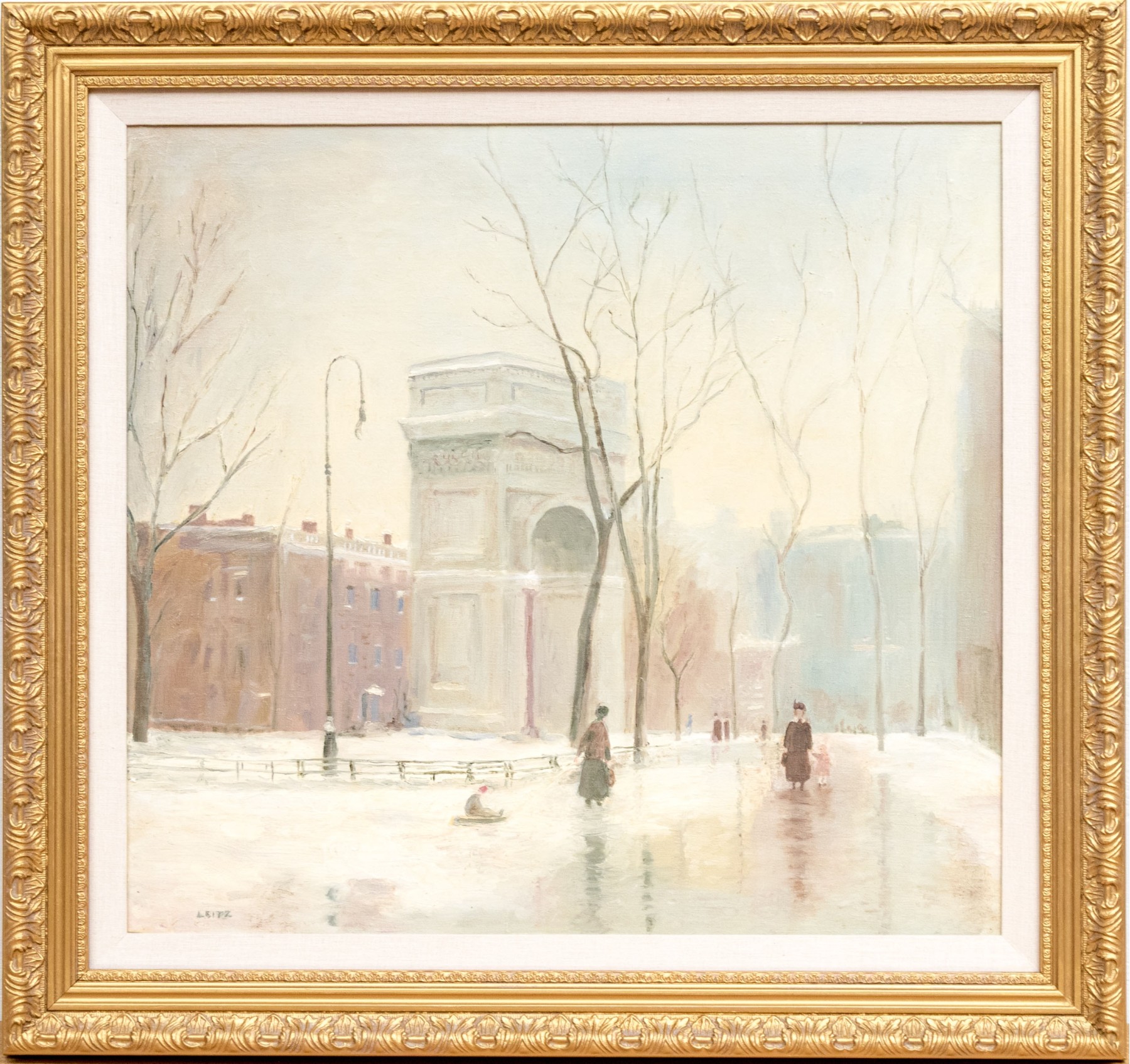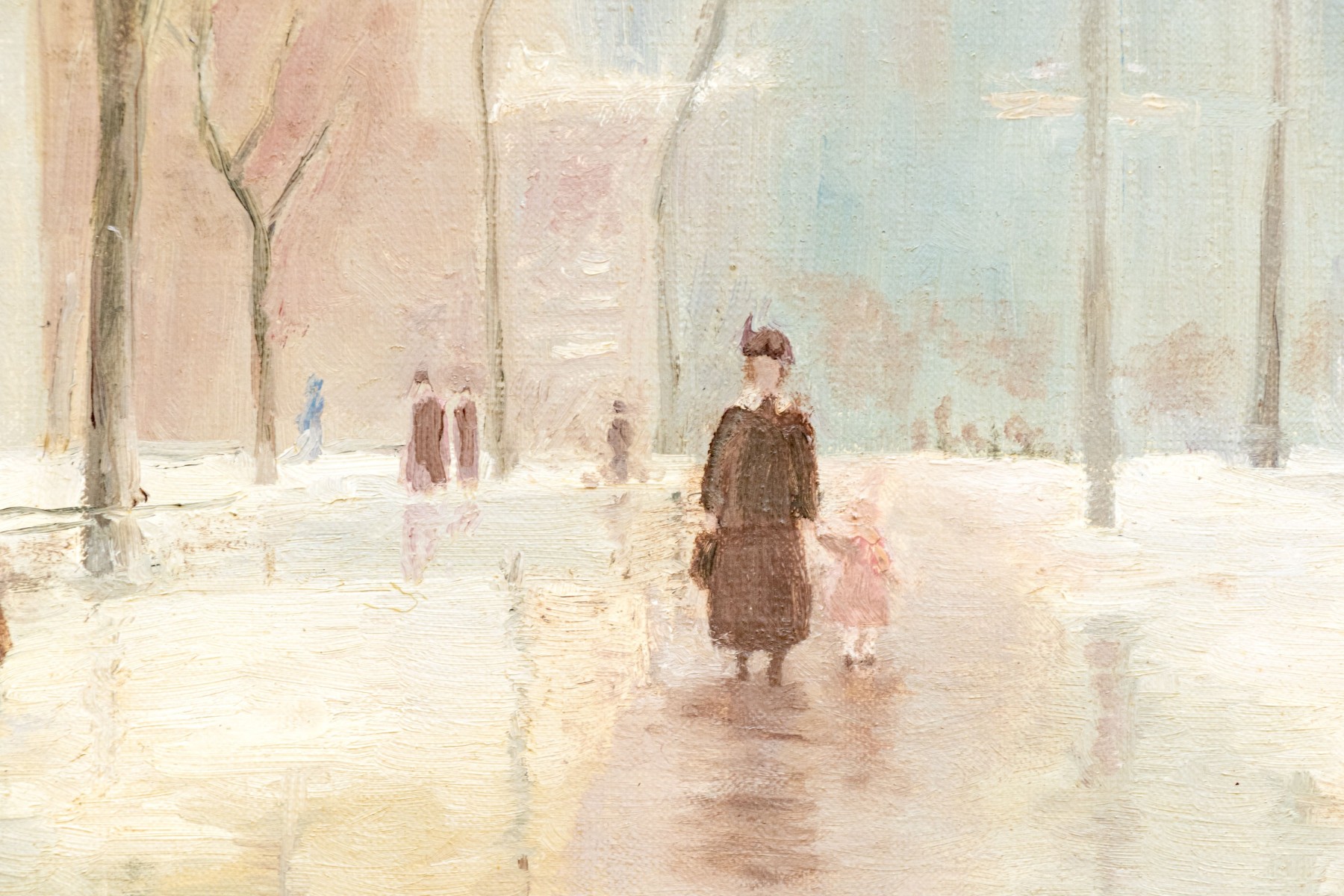 A gorgeous oil painting on canvas reproduction after Paul Cornoyer (American, 1864-1923) "Winter in Washington Square" depicting women with children, one on a sled, walking along a quiet street reflecting the surrounding scenery after rain or snow with a view of the Washington Square Arch in the mid-ground. Rendered with a delicate color palette creating a dreamy, calm morning atmosphere. Signed Leitz lower left.