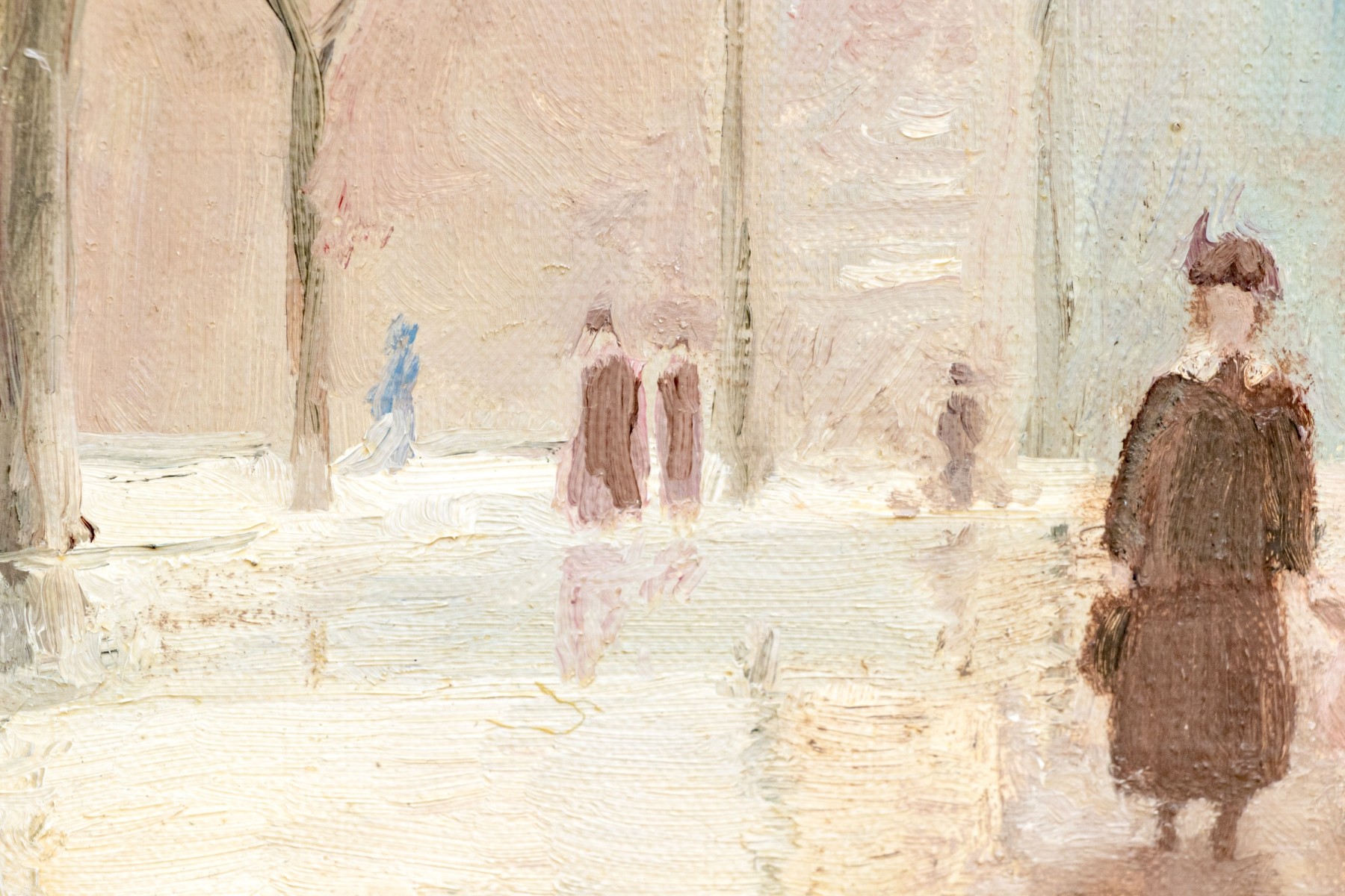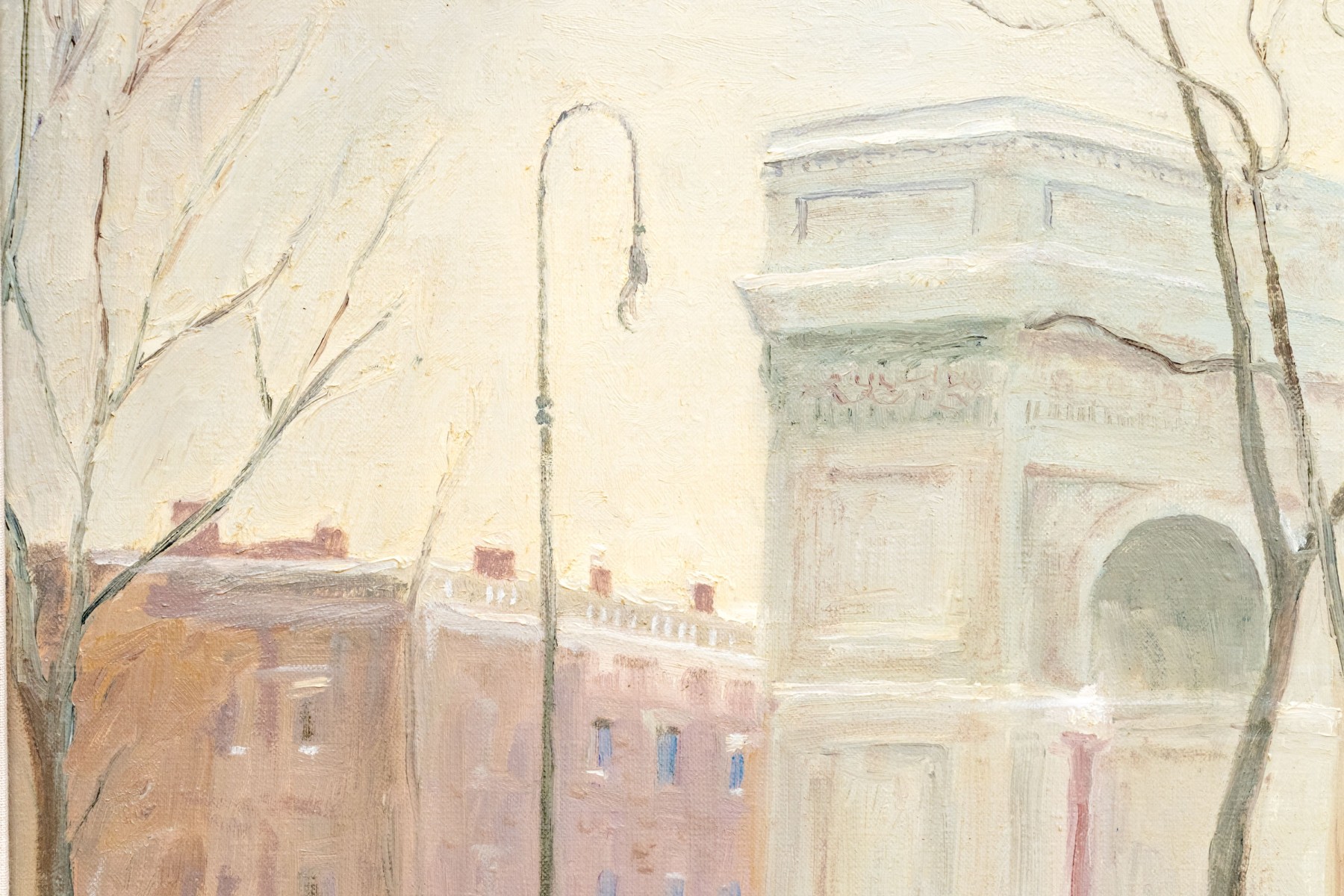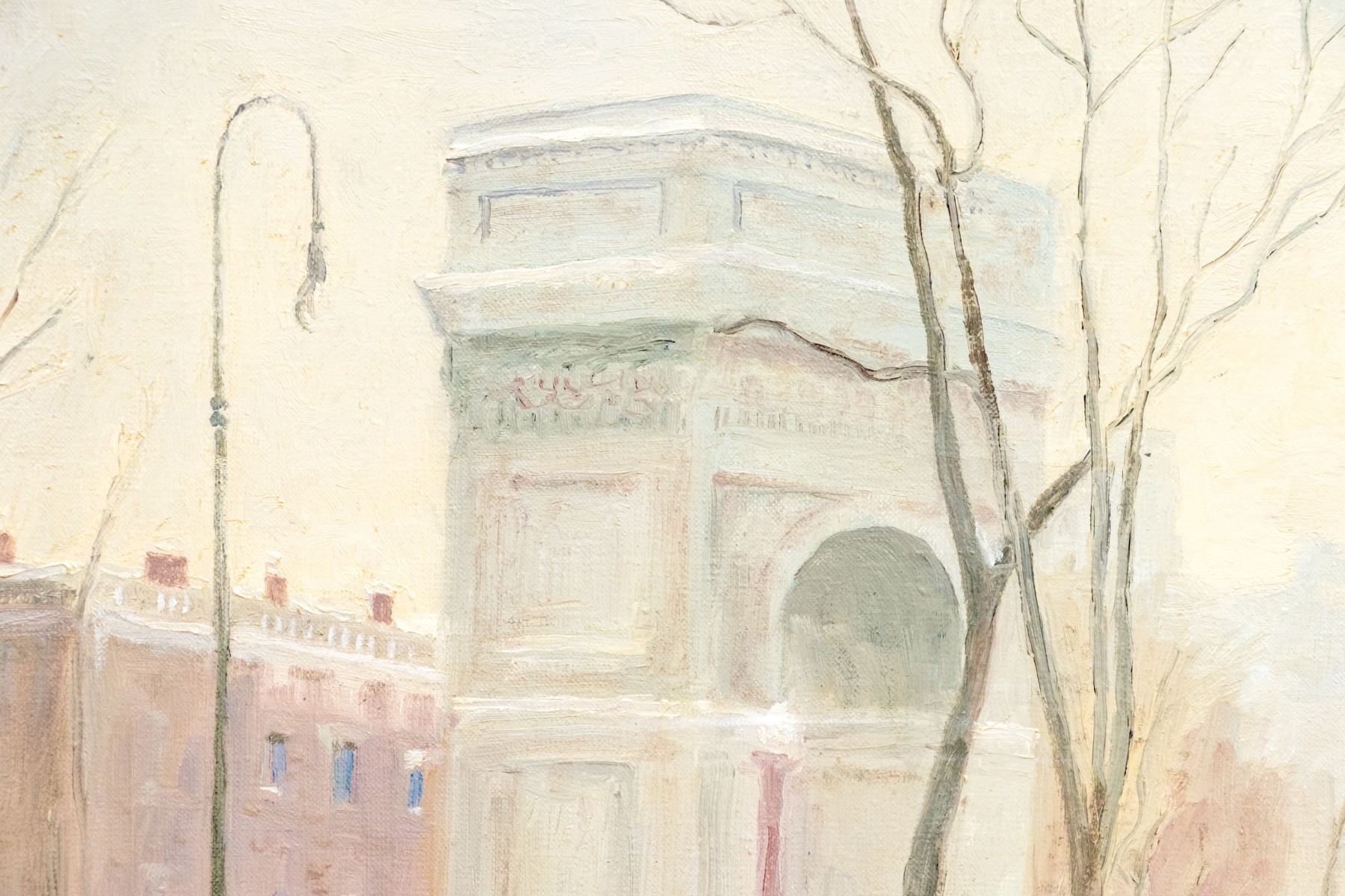 A gorgeous oil painting on canvas reproduction after Paul Cornoyer (American, 1864-1923) "Winter in Washington Square" depicting women with children, one on a sled, walking along a quiet street reflecting the surrounding scenery after rain or snow with a view of the Washington Square Arch in the mid-ground. Rendered with a delicate color palette creating a dreamy, calm morning atmosphere. Signed Leitz lower left.