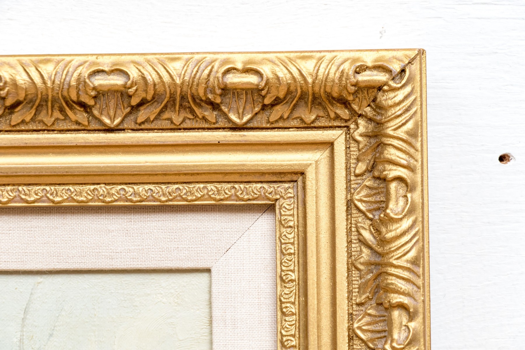 Displayed with a linen liner in a gilt frame well carved with foliate relief.