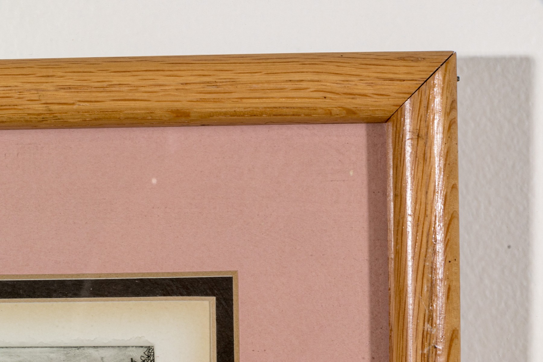 Presented matted with black interior trim, within a finished wood frame and glazed.