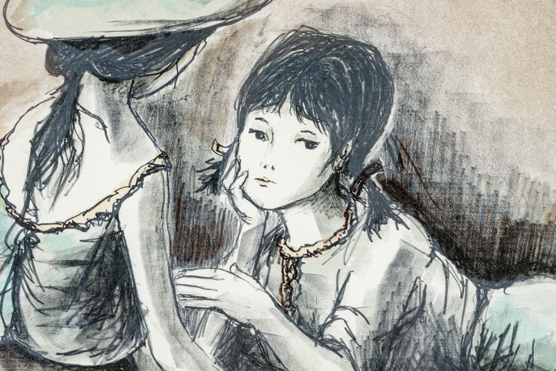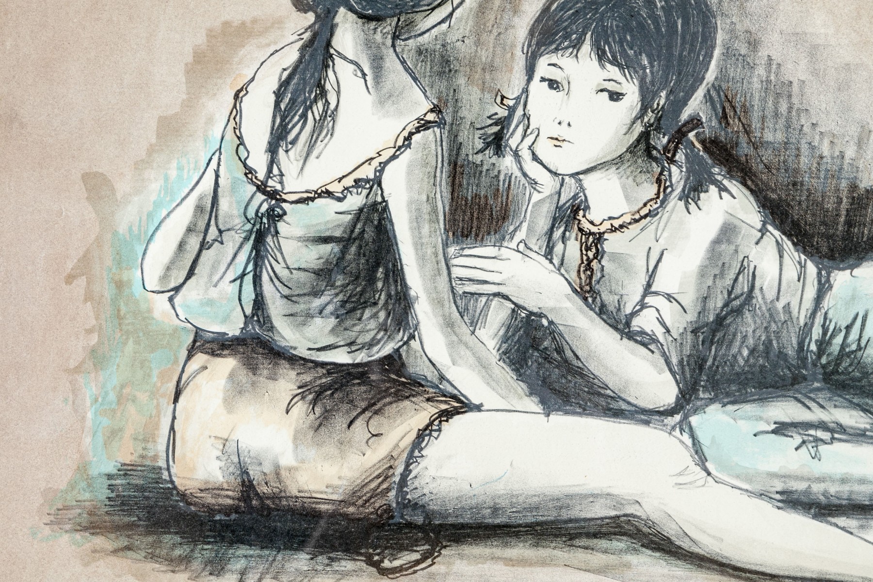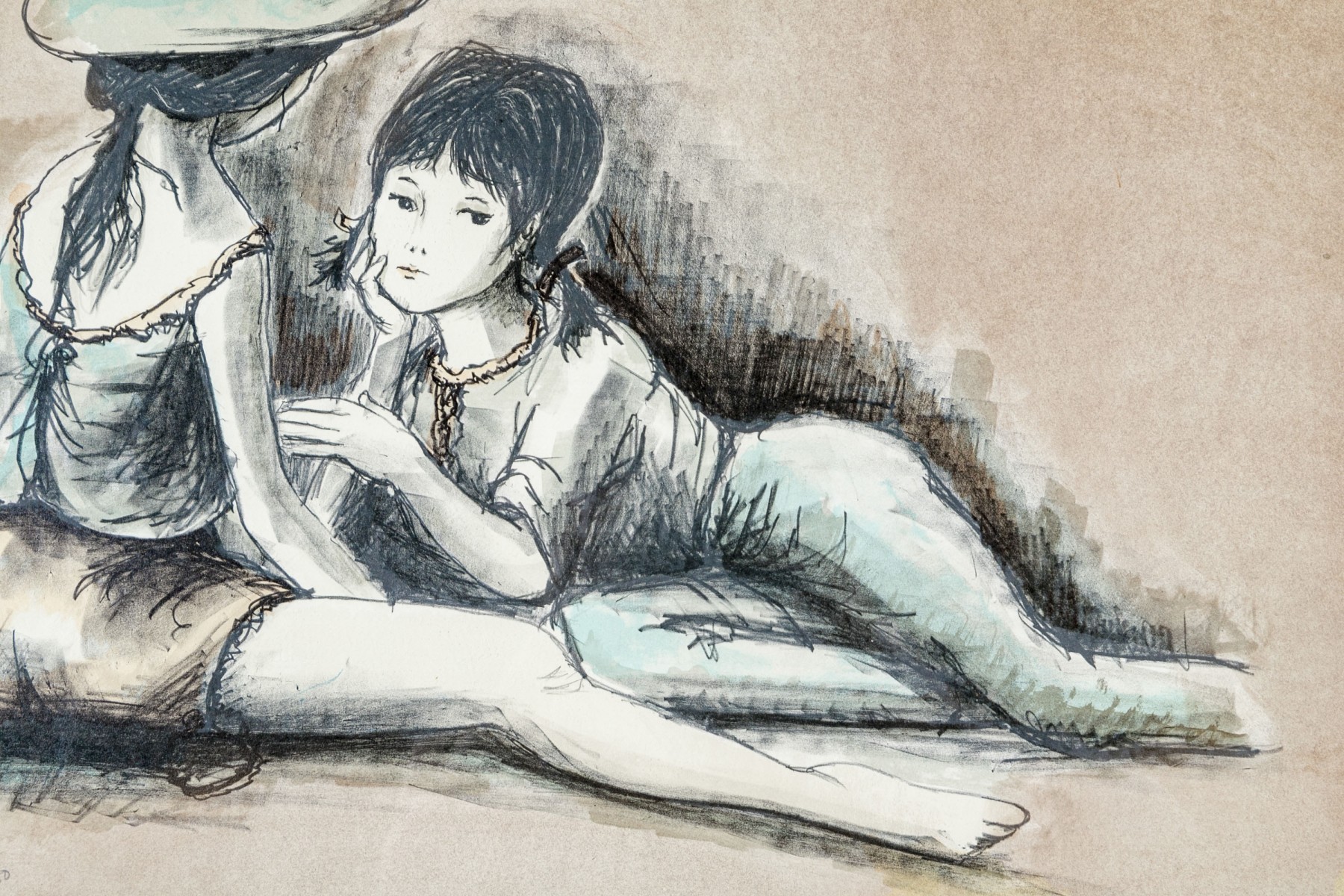 Print depicting two girls, one reclining on her elbow and the other sitting opposite.