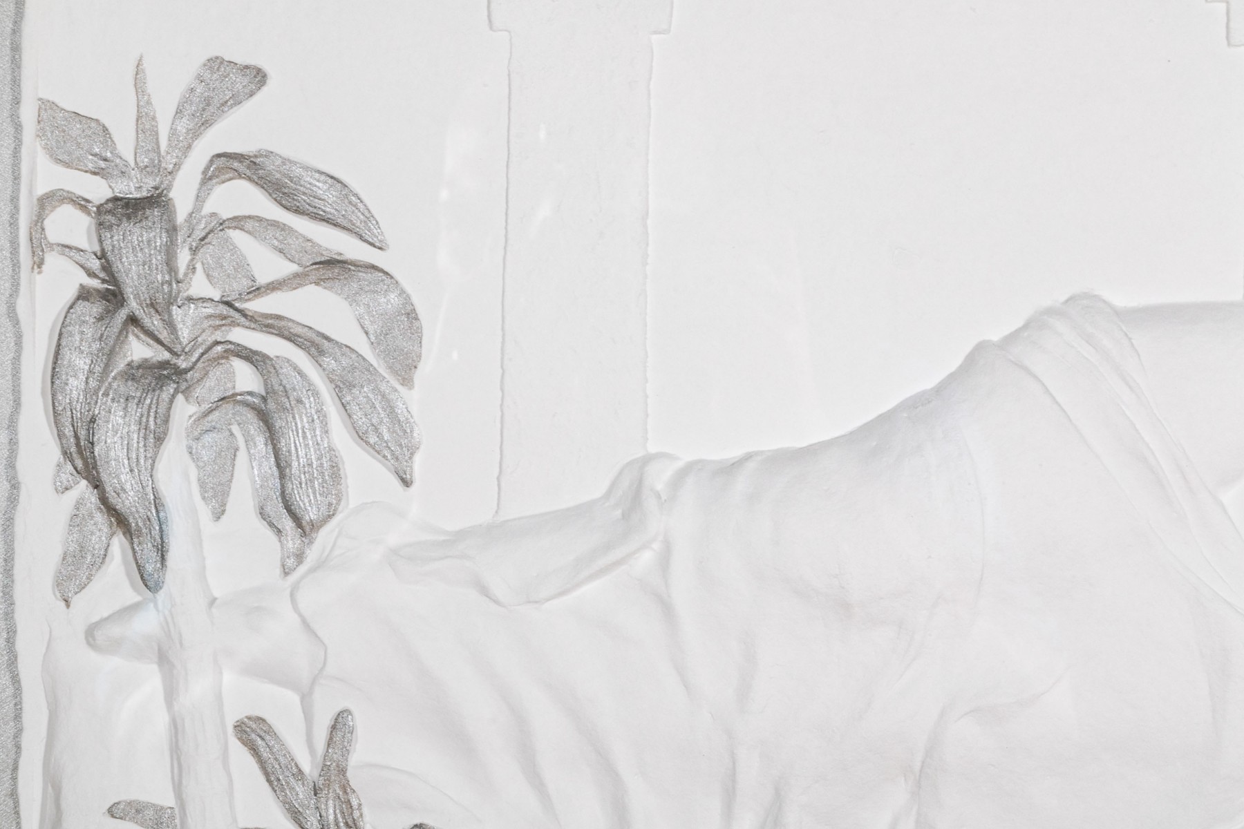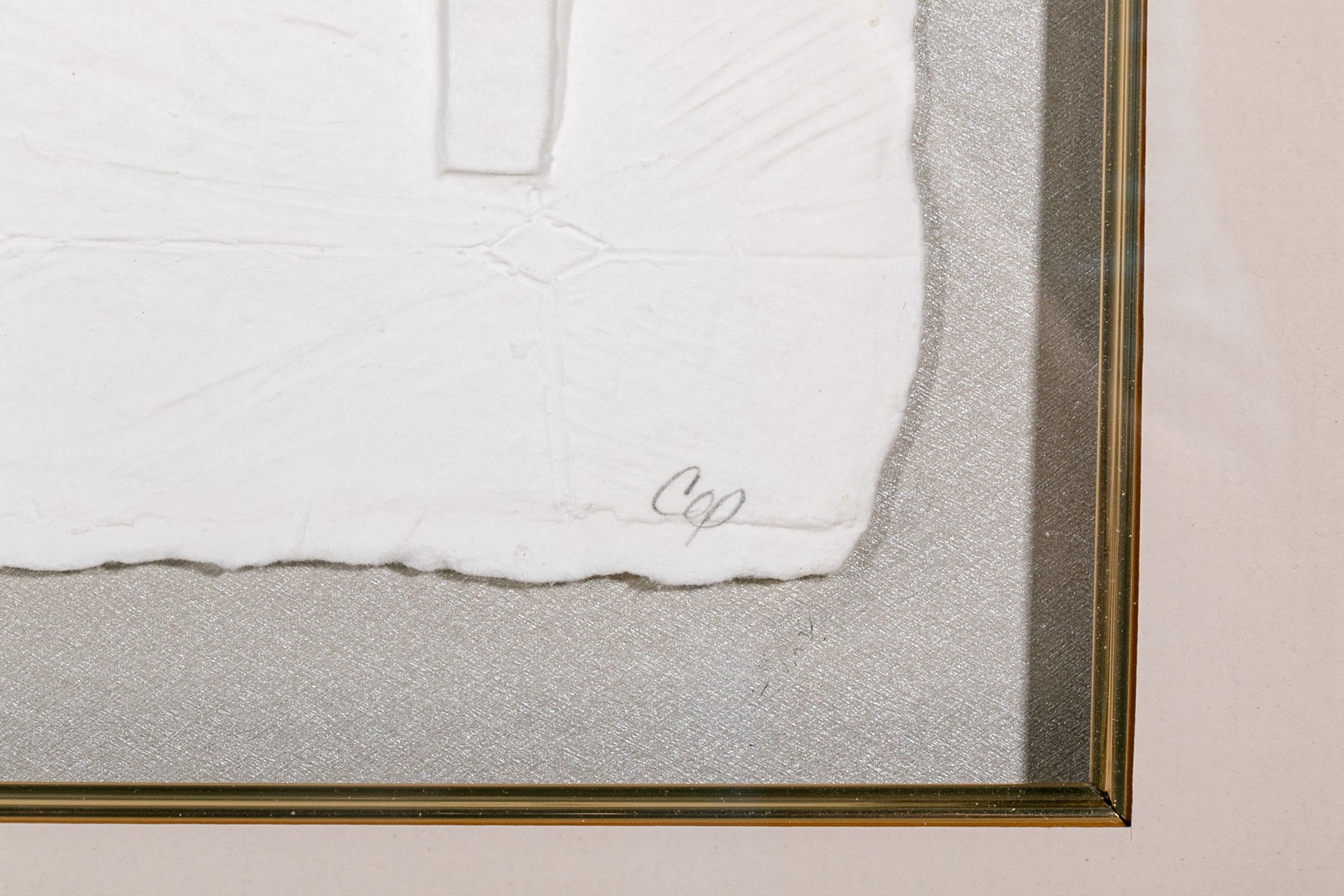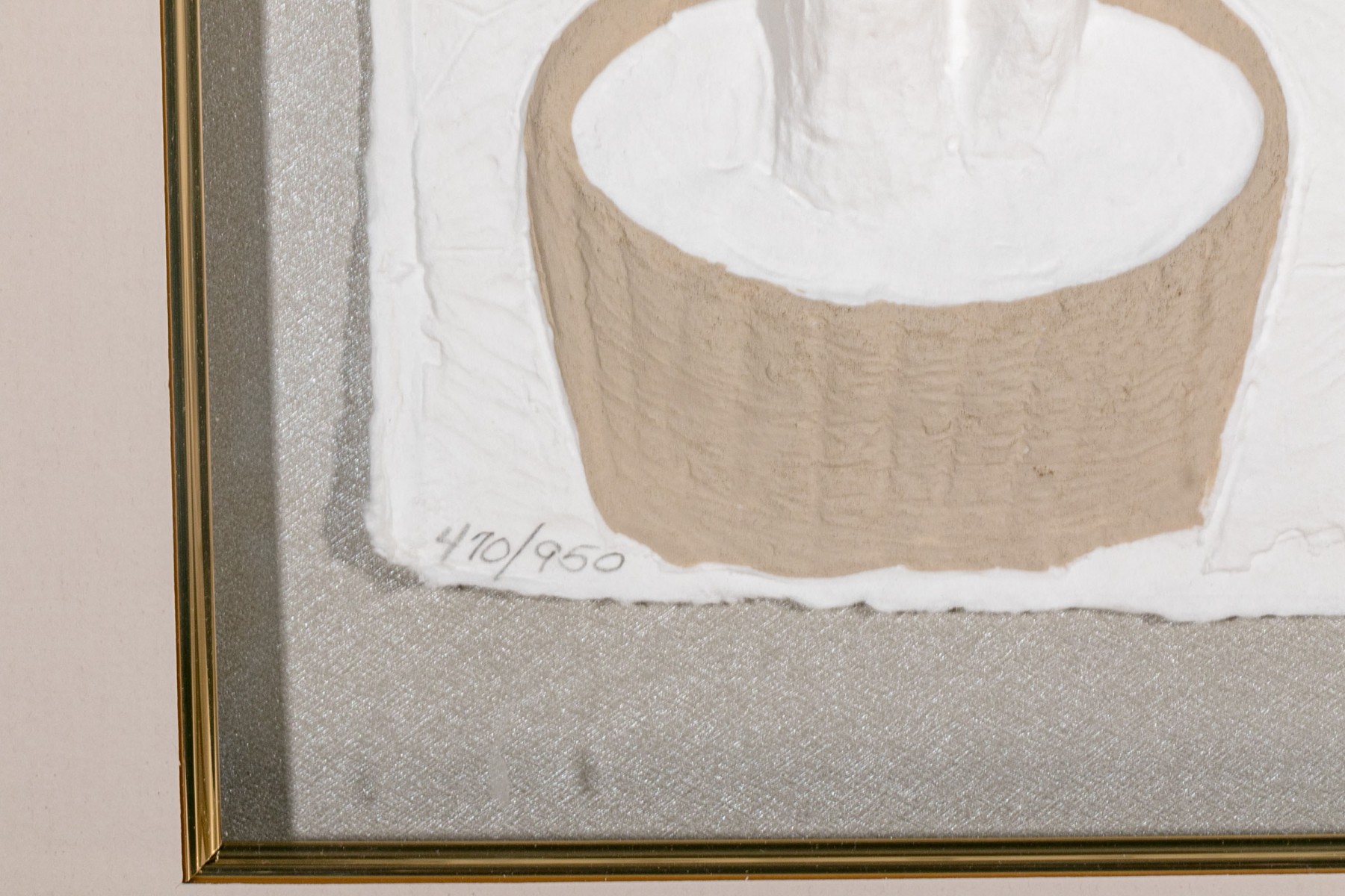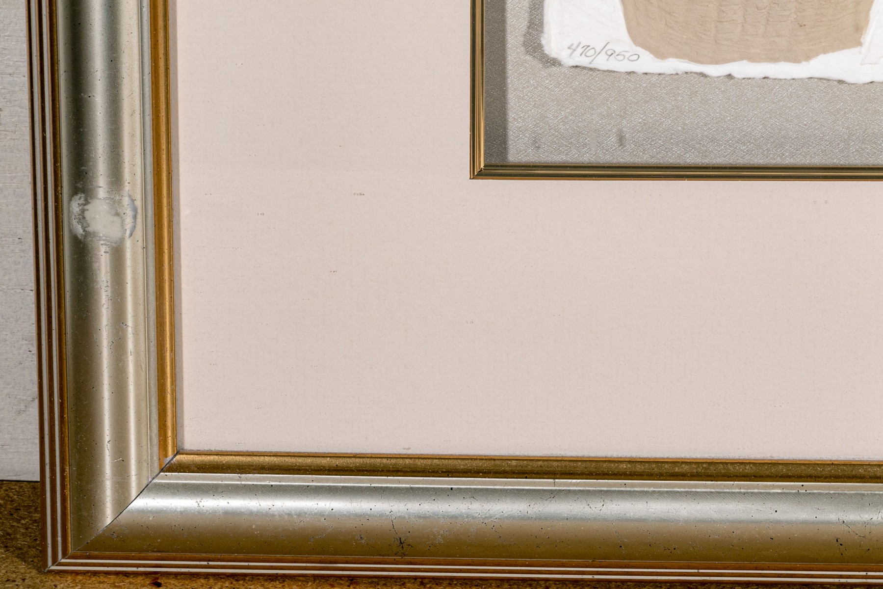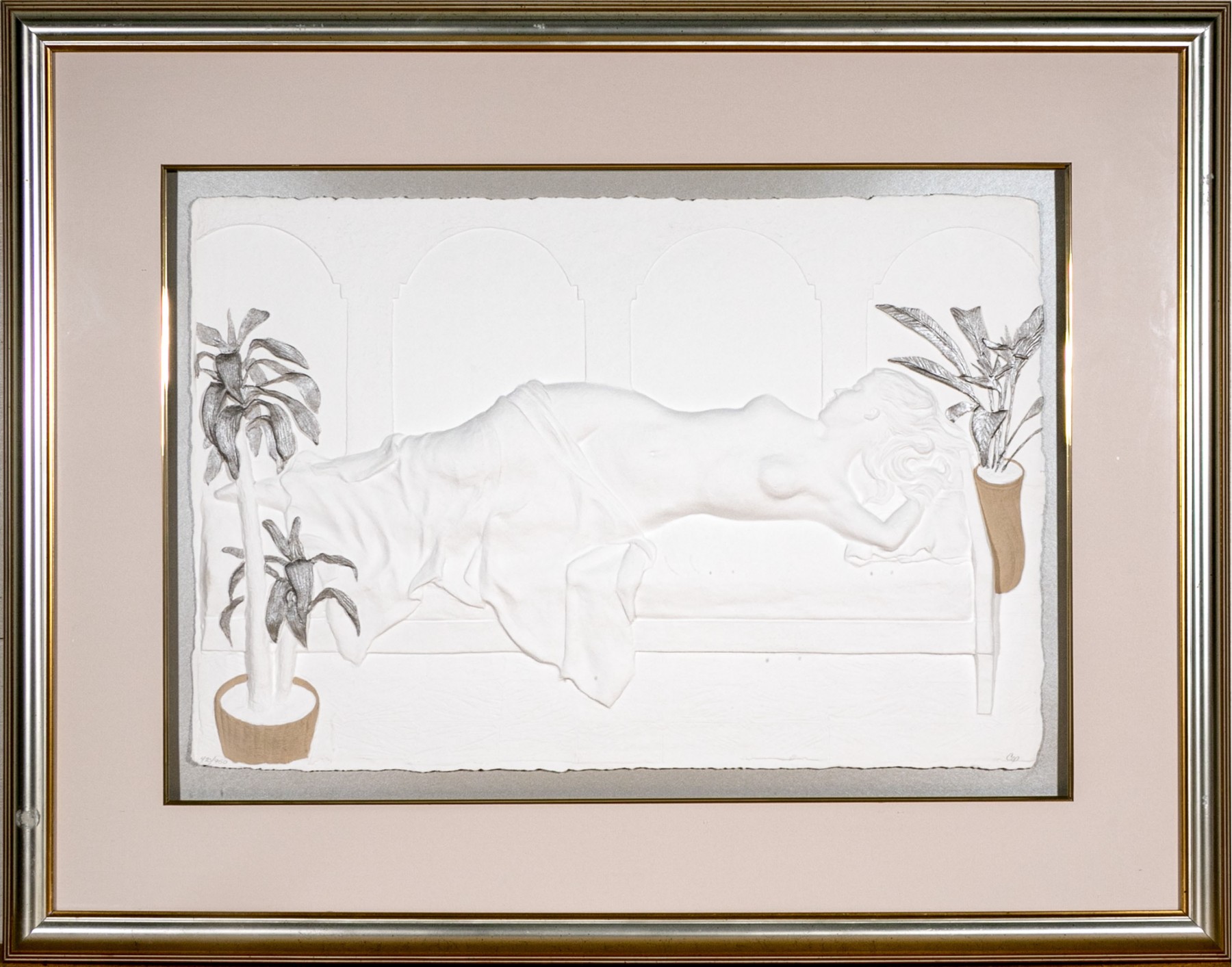 Monogrammed COP lower right, numbered 470/950 lower left. A draped female nude figure reclines on a bed framed by potted plants with silver gilt leaves in an arched setting. Mounted on a gray backing and presented in a silver gilt frame with glass.