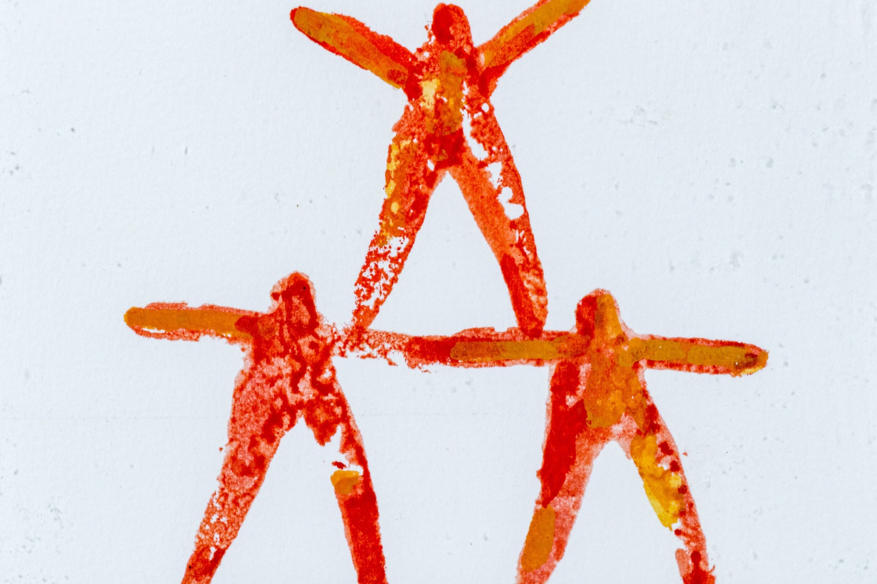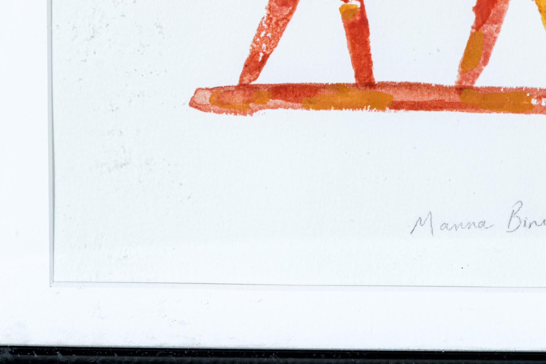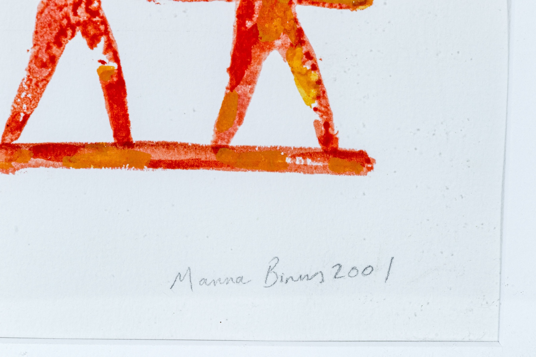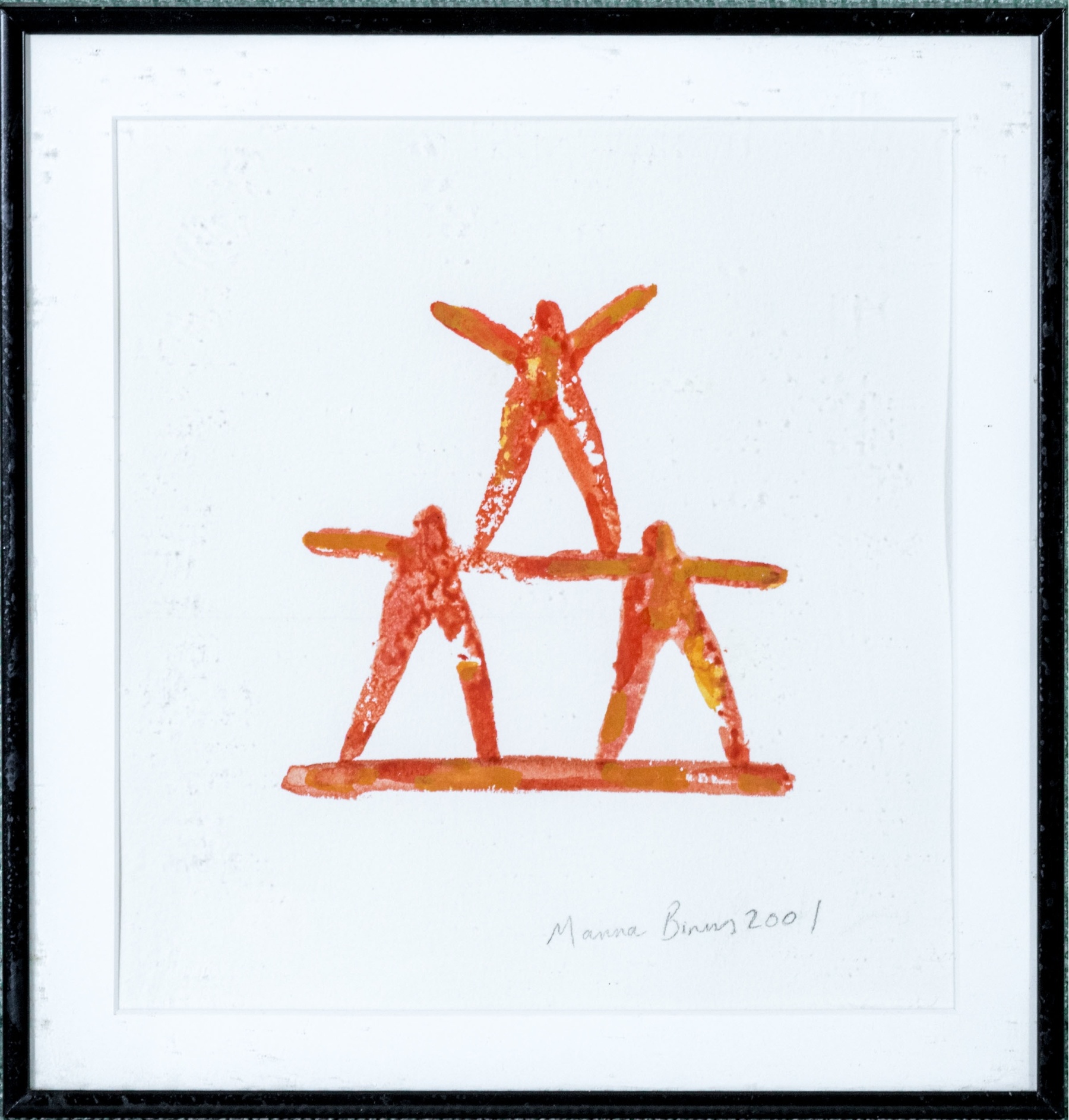 A striking abstract painting on paper depicting three star-like figures in red and ochre yellow posing in a handstand with one figure standing on the shoulders of the other two against a white ground. Pencil signed appearing Manna Binns and dated 2001 lower right.