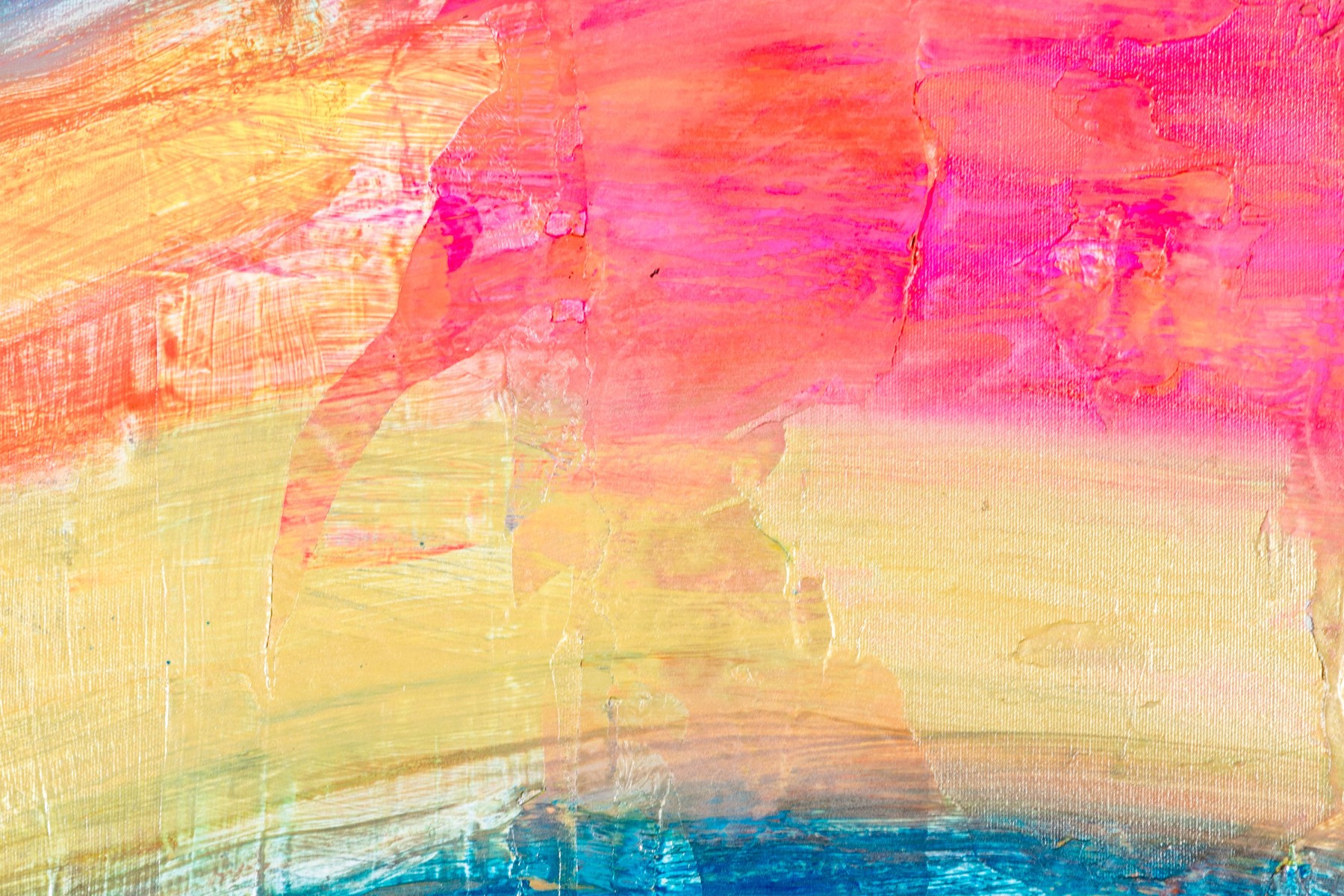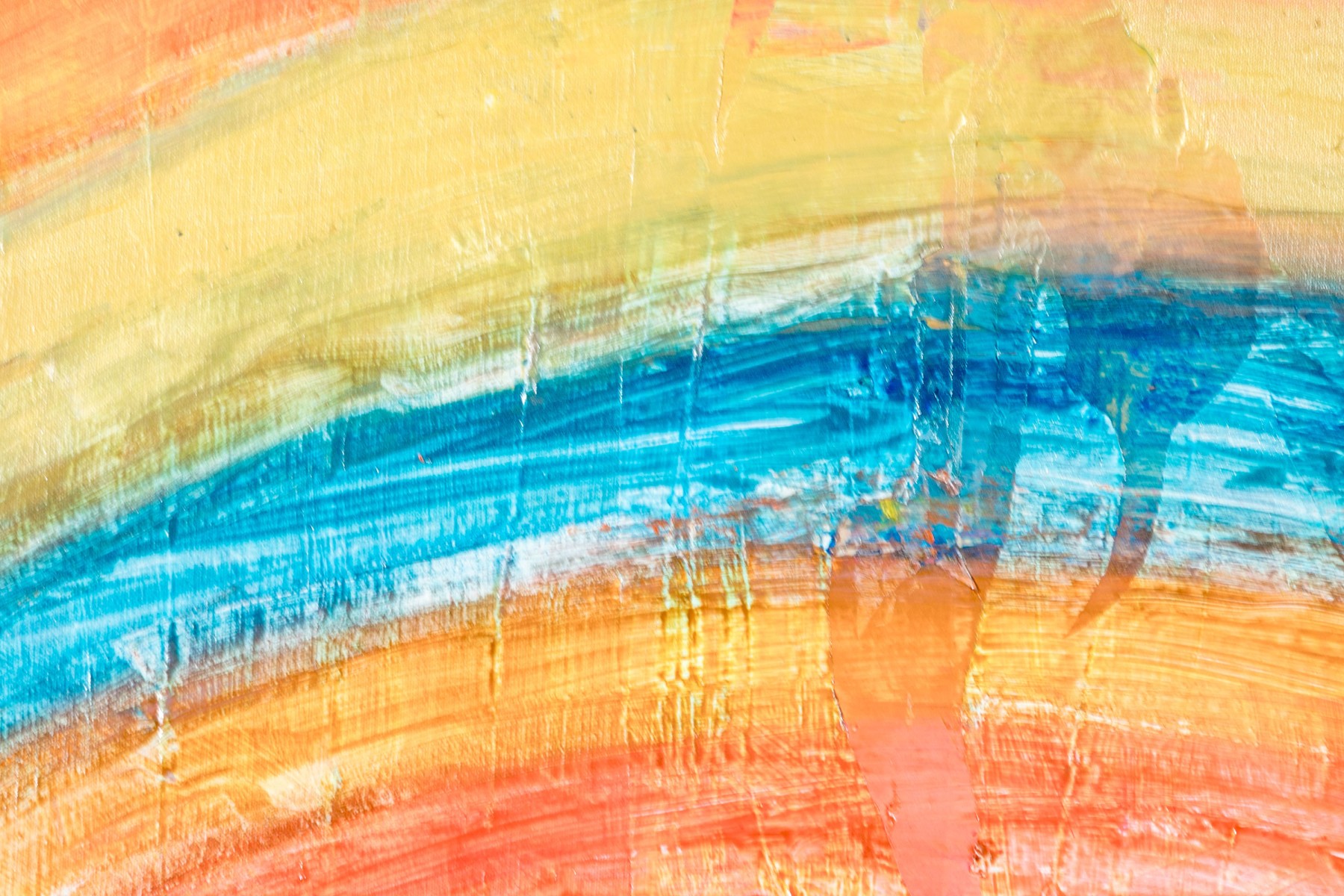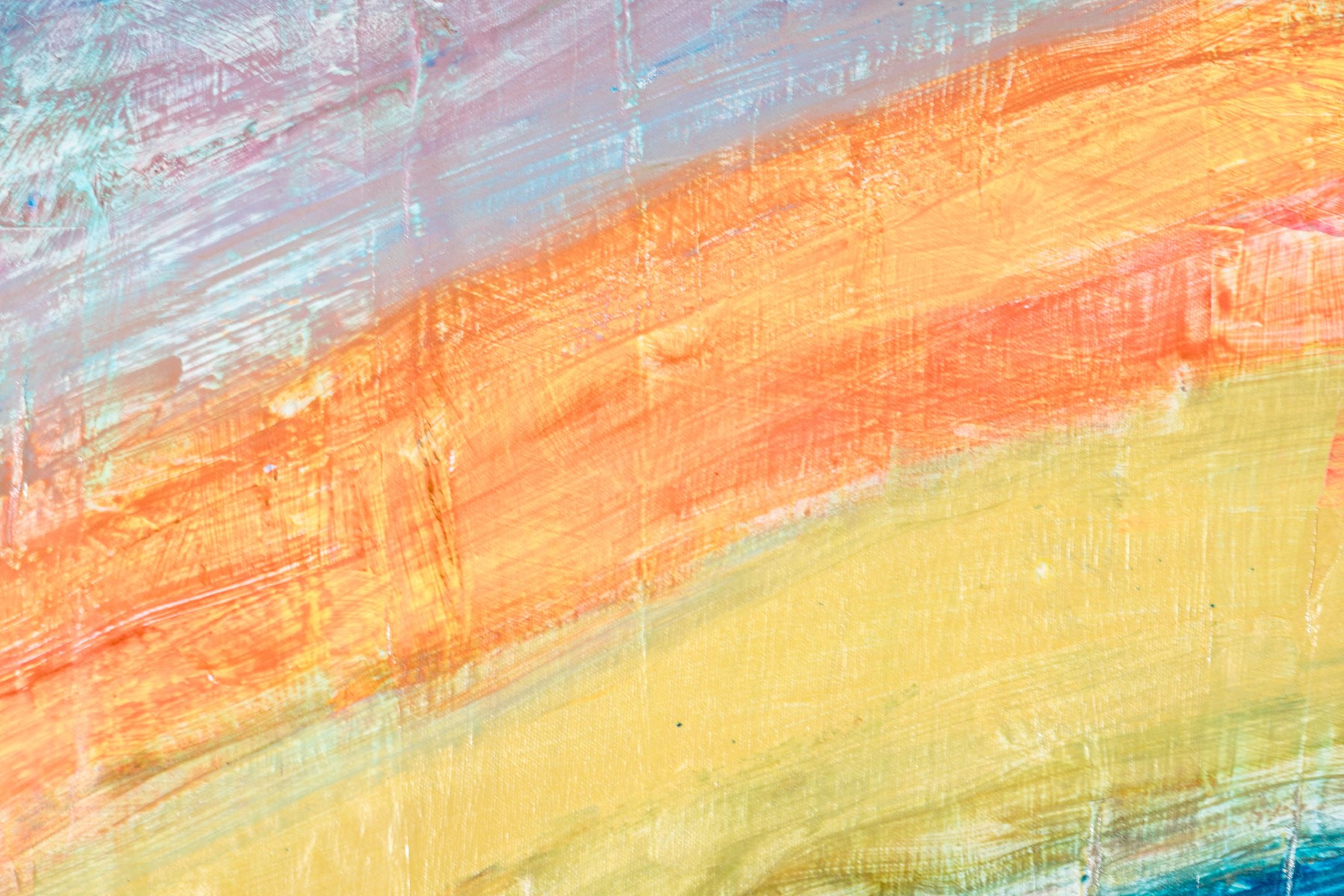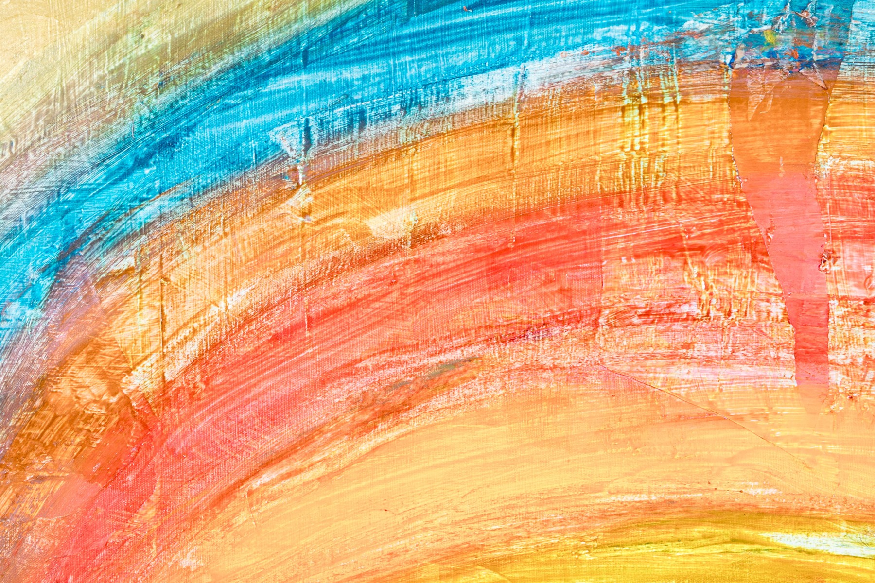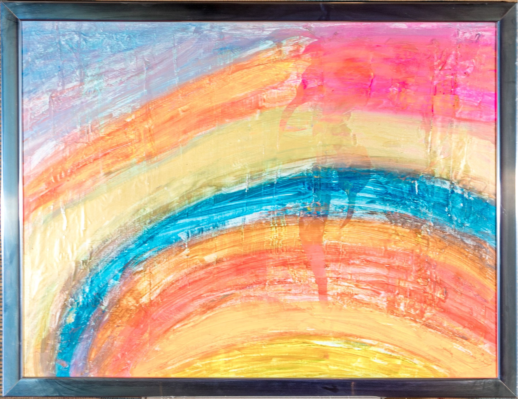 A colorful mixed media work on canvas depicting an arched rainbow effect.