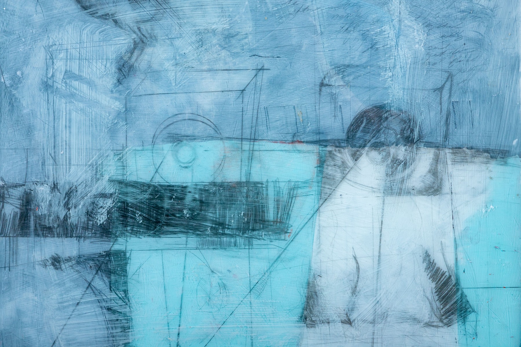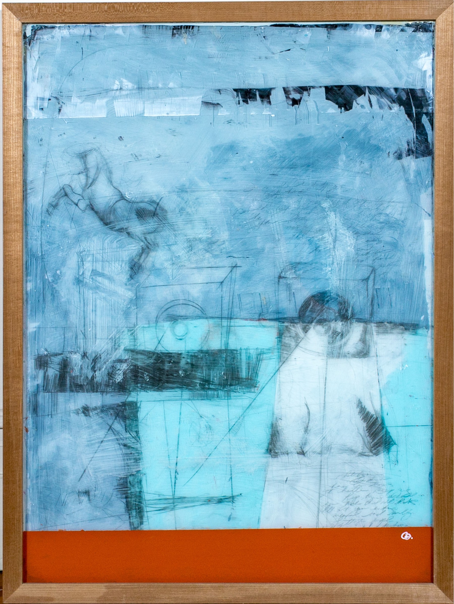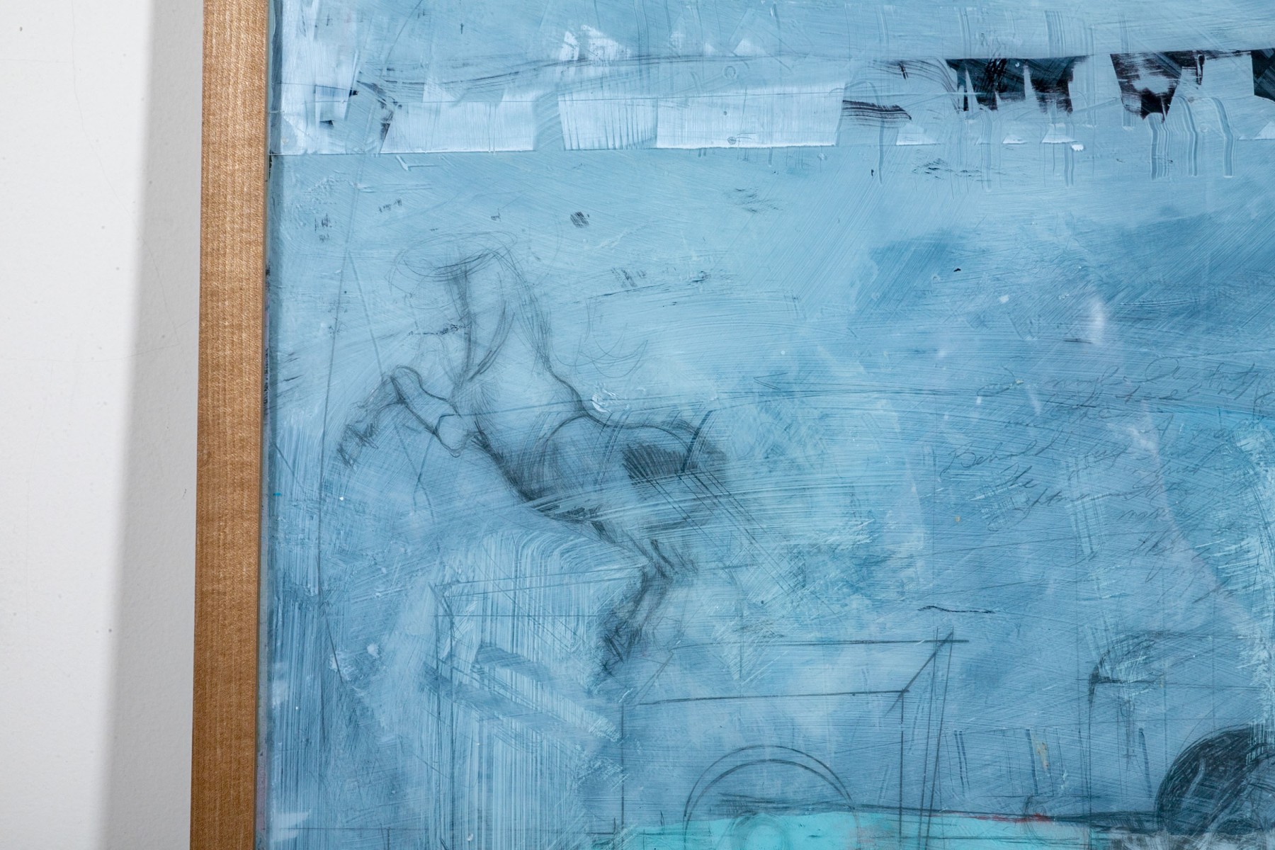 A wonderful mixed media on paper depicting an abstract arrangement of graphite speaker forms with a horse in profile against a white, blue, and black textural background.