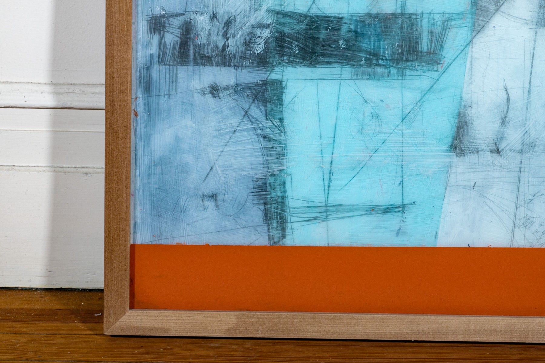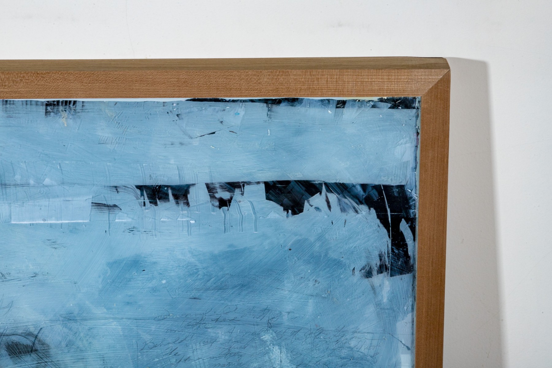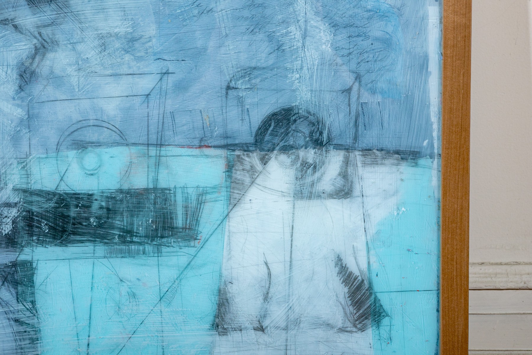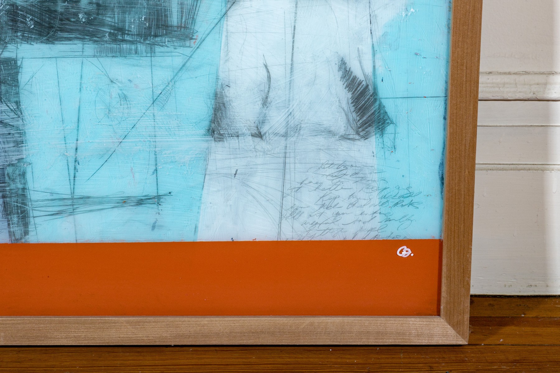 A wonderful mixed media on paper depicting an abstract arrangement of graphite speaker forms with a horse in profile against a white, blue, and black textural background.