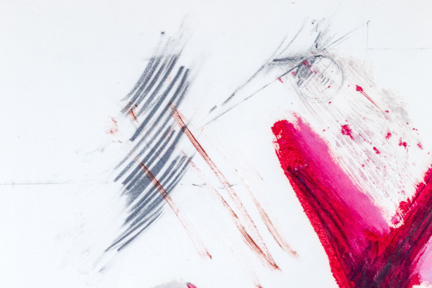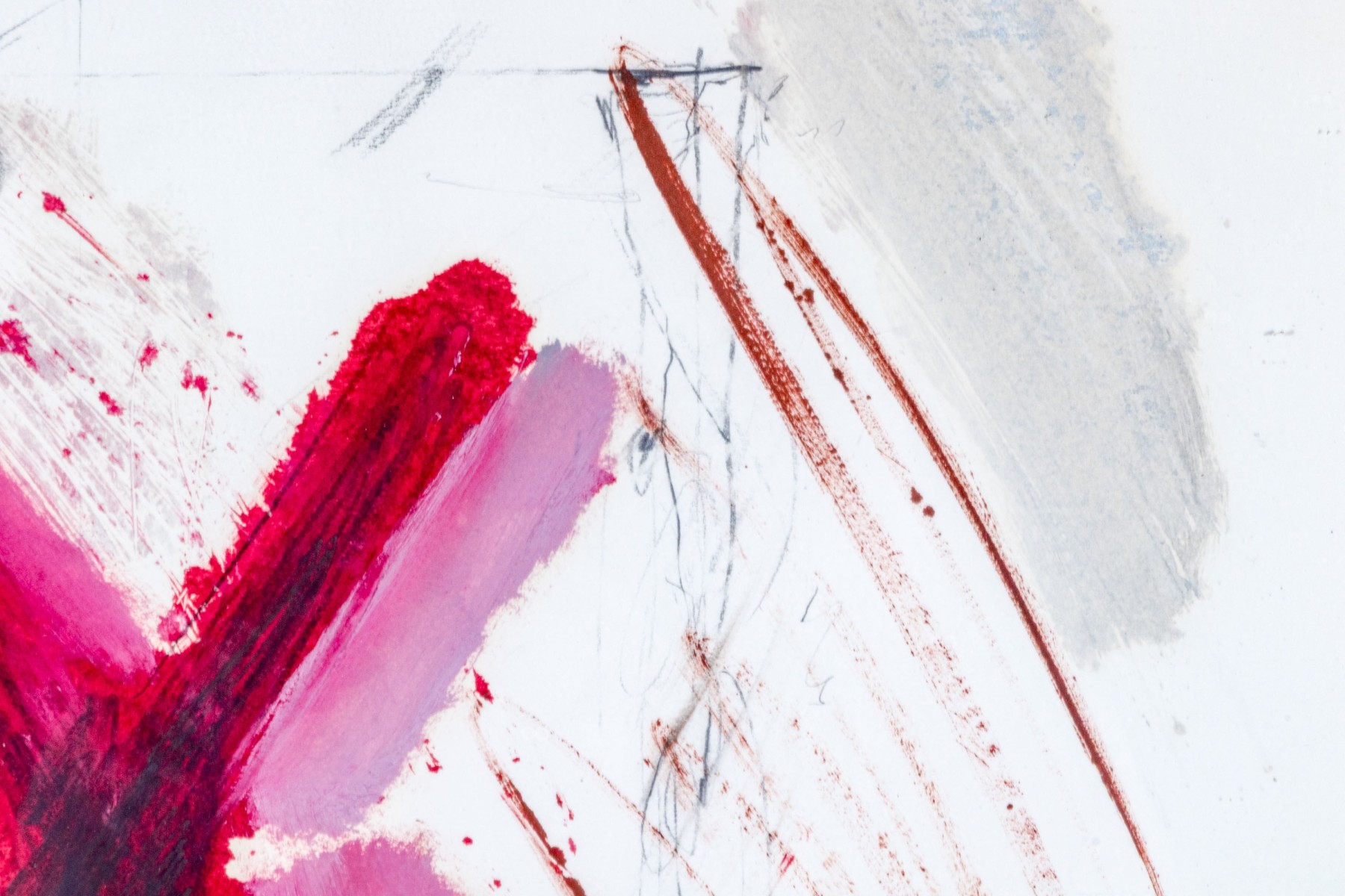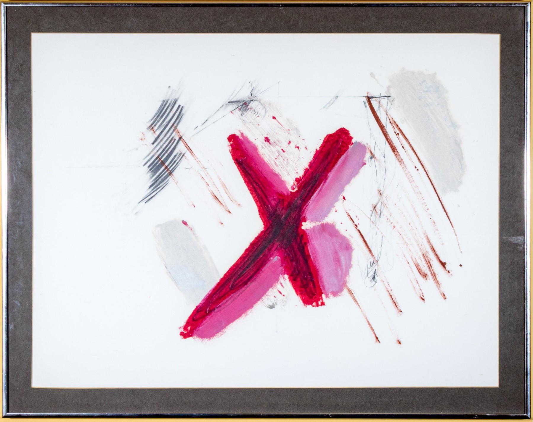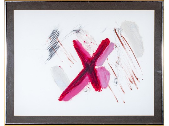 An eye-catching mixed media painting on paper depicting a red and pink X at the center of a white field textured with gray, black, and rust brown gestural strokes. Signed lower right quadrant.