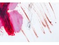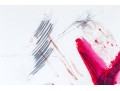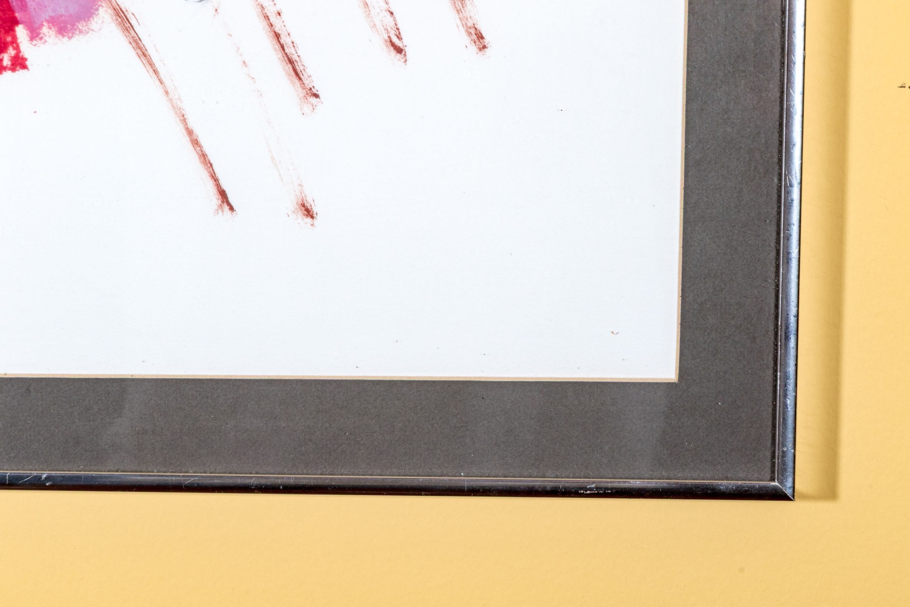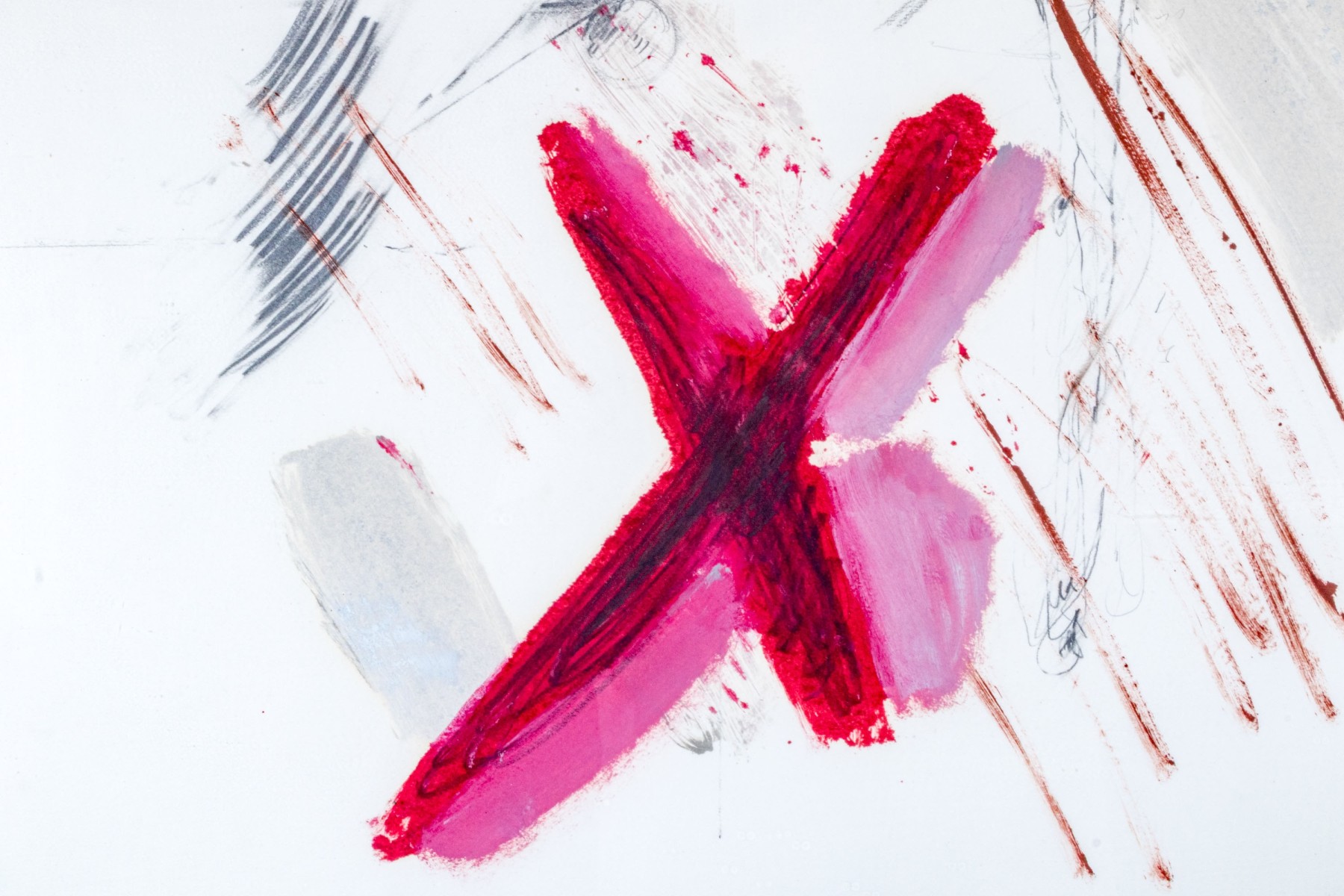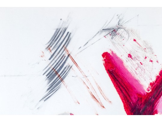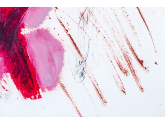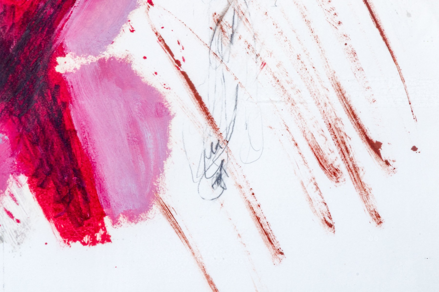 An eye-catching mixed media painting on paper depicting a red and pink X at the center of a white field textured with gray, black, and rust brown gestural strokes. Signed lower right quadrant.
