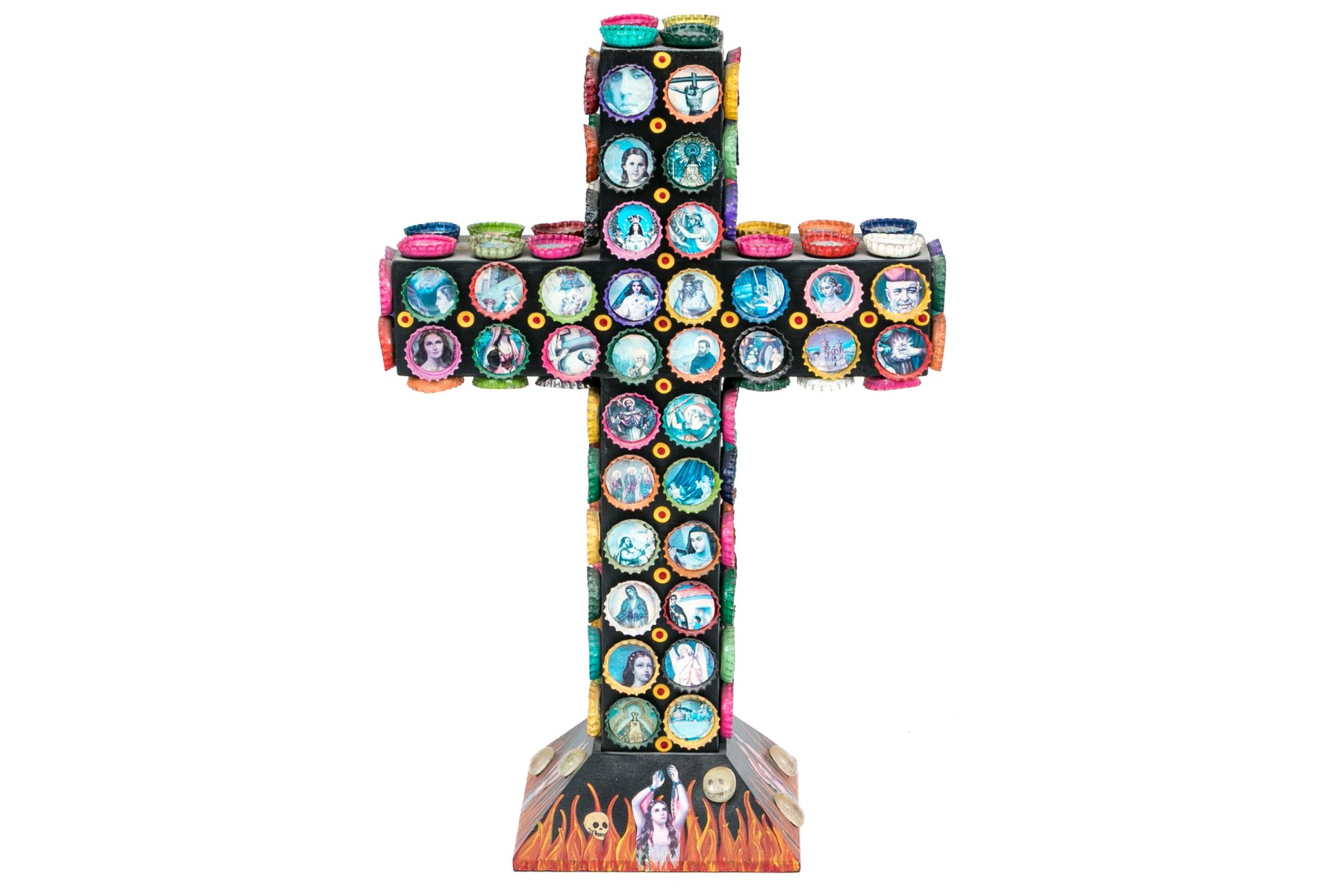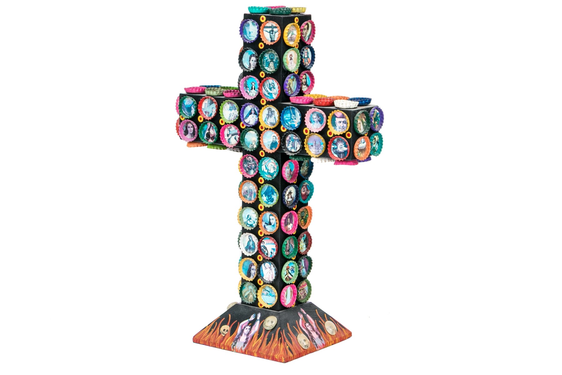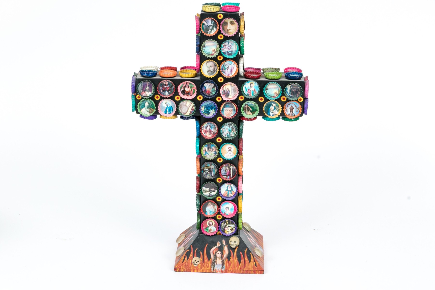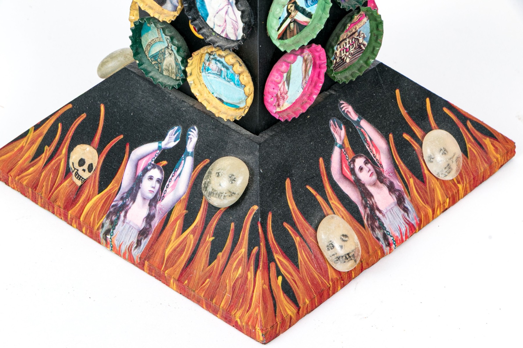 A mixed media sculpture of a black cross decorated with colorful bottle caps mountained with a variety of religious imagery, alternating with yellow and red dotted motifs in between. Mounted to a pyramidal square base painted with flames and decoupage decorated with scenes of skulls and women. Signed underfoot.