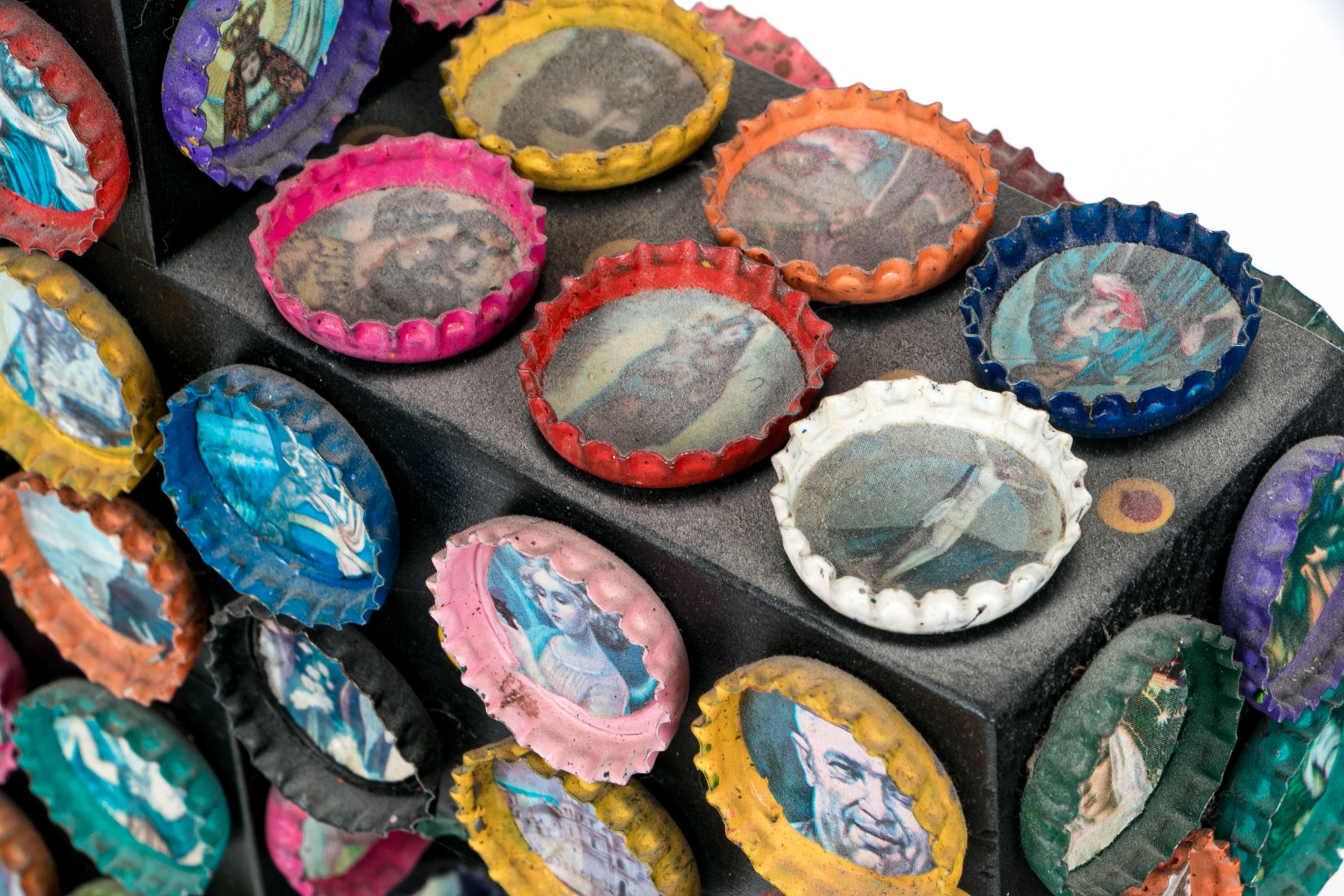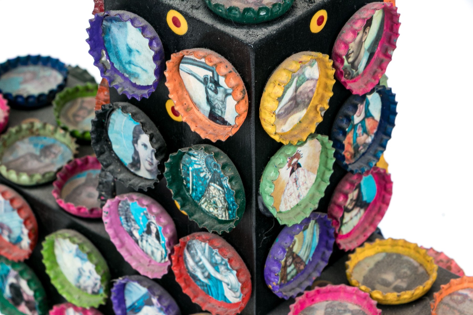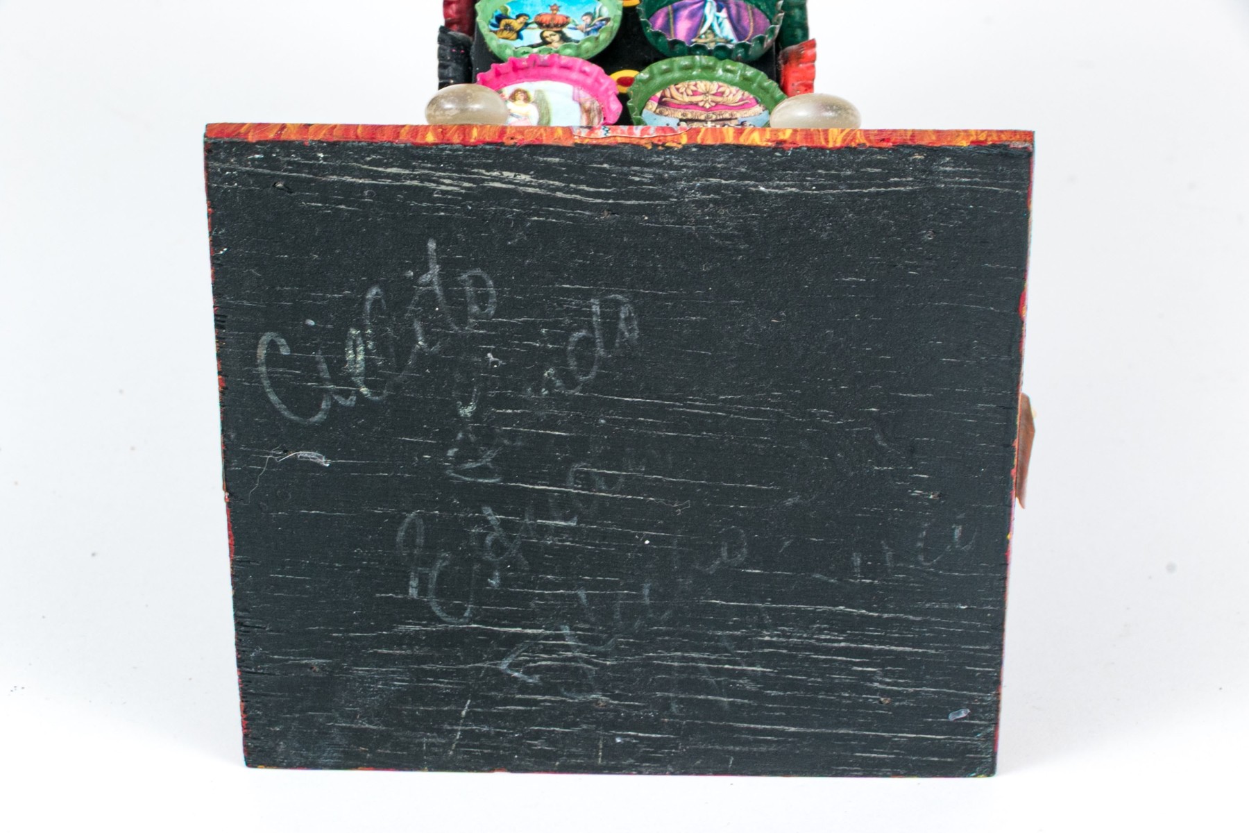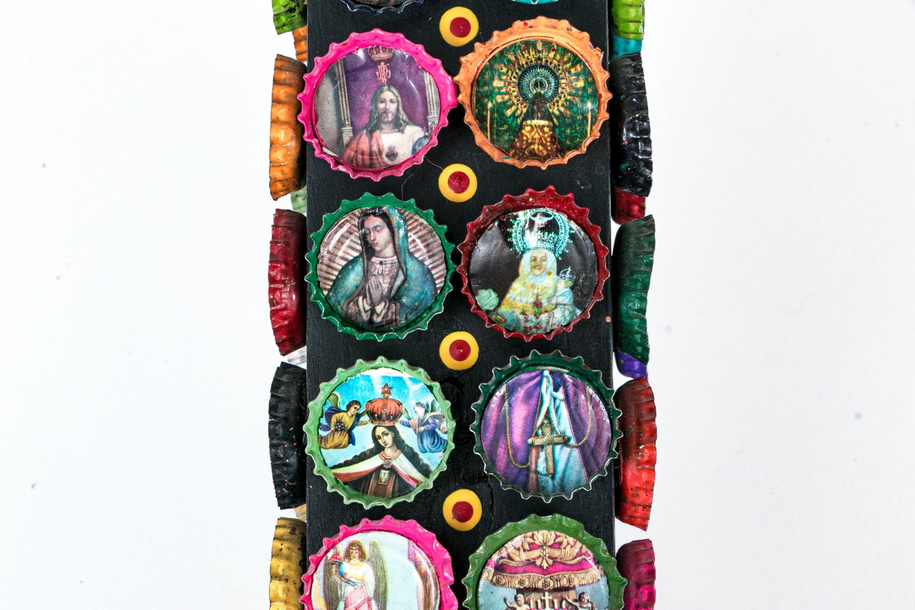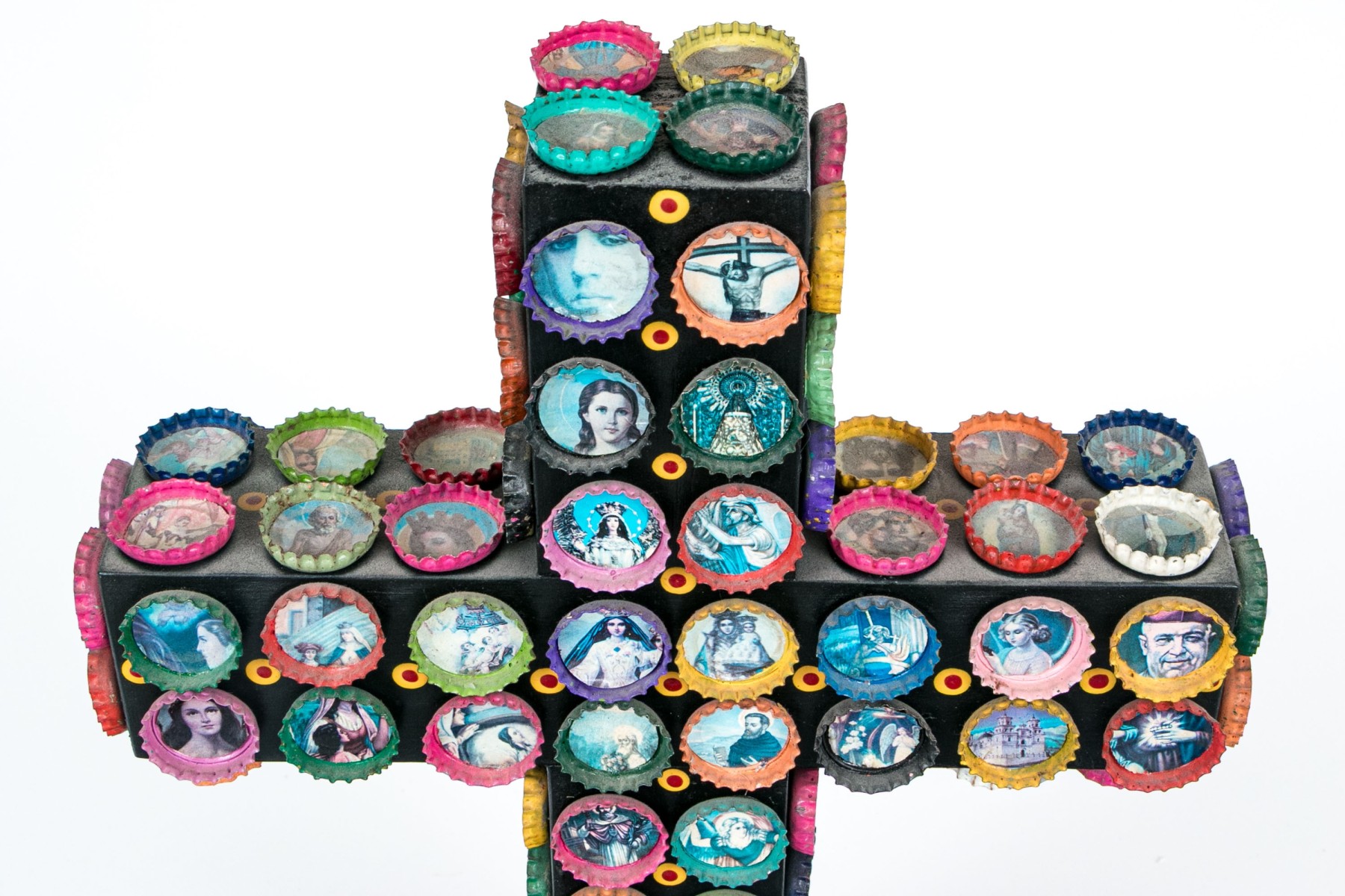 A mixed media sculpture of a black cross decorated with colorful bottle caps mountained with a variety of religious imagery, alternating with yellow and red dotted motifs in between. Mounted to a pyramidal square base painted with flames and decoupage decorated with scenes of skulls and women. Signed underfoot.