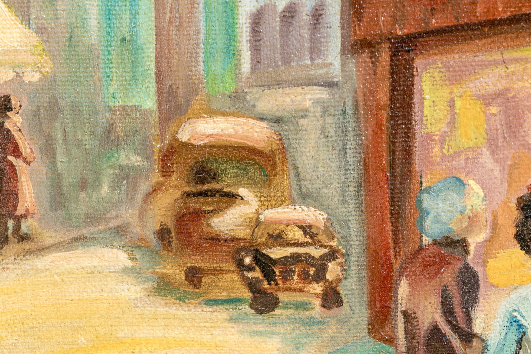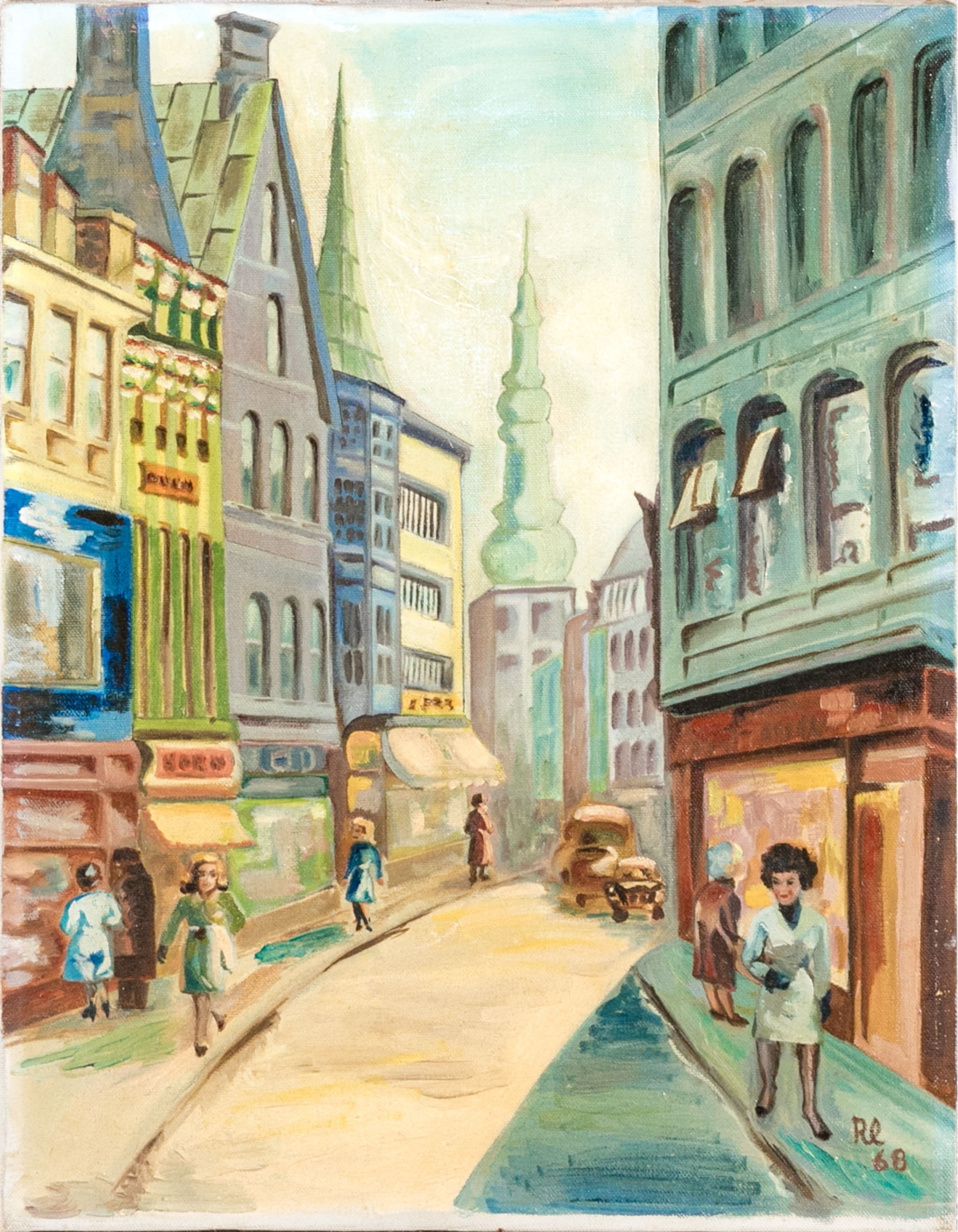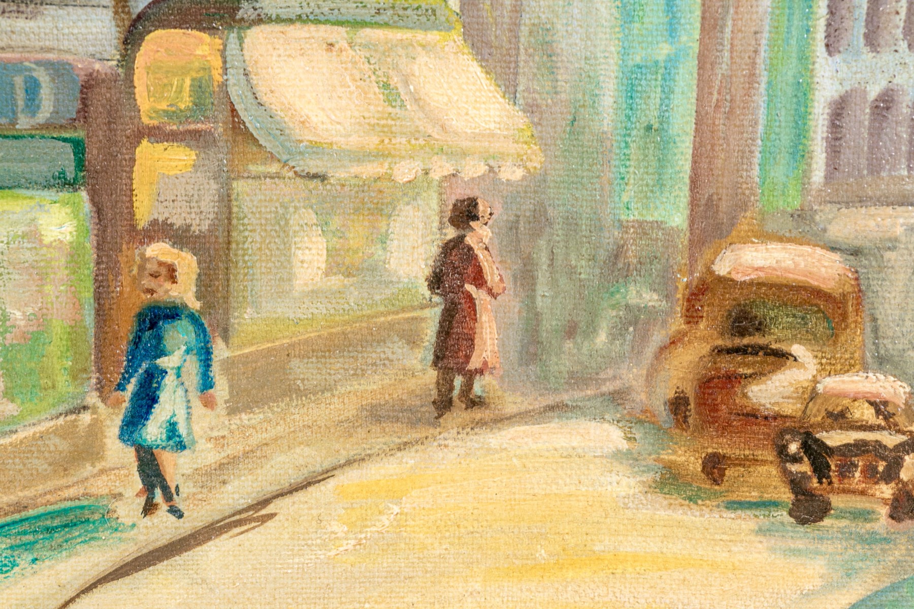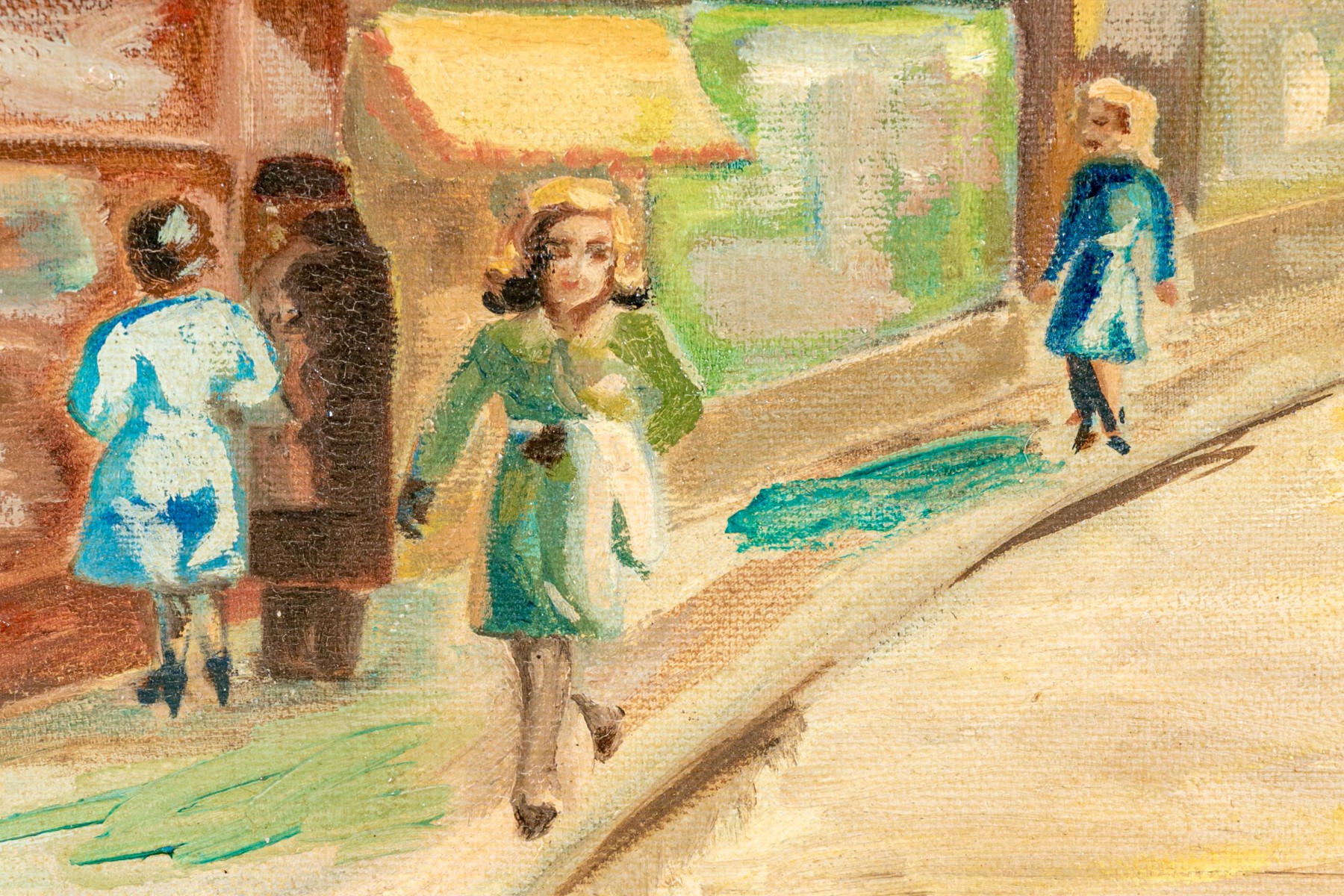 Oil on canvas depicting an urban street scene with figures walking on the sidewalks.