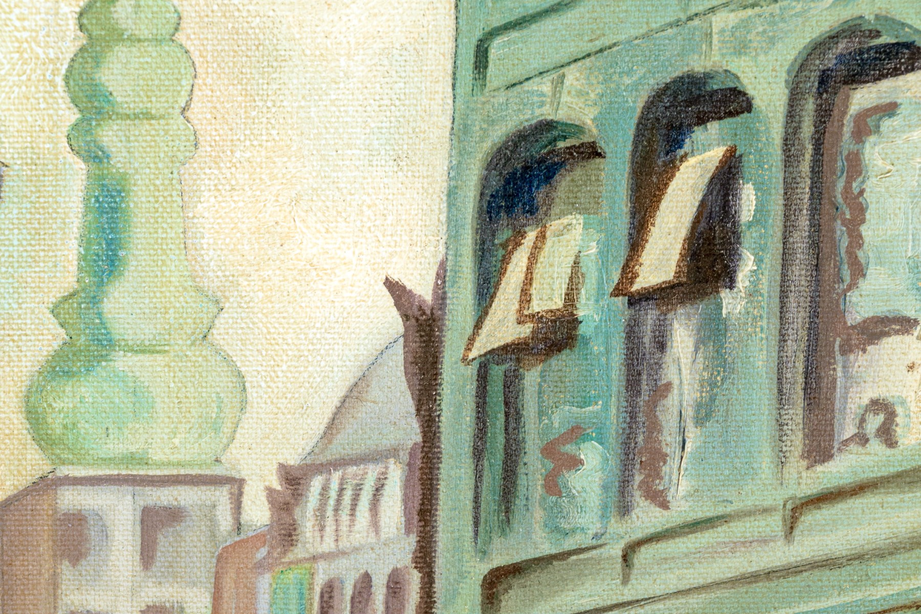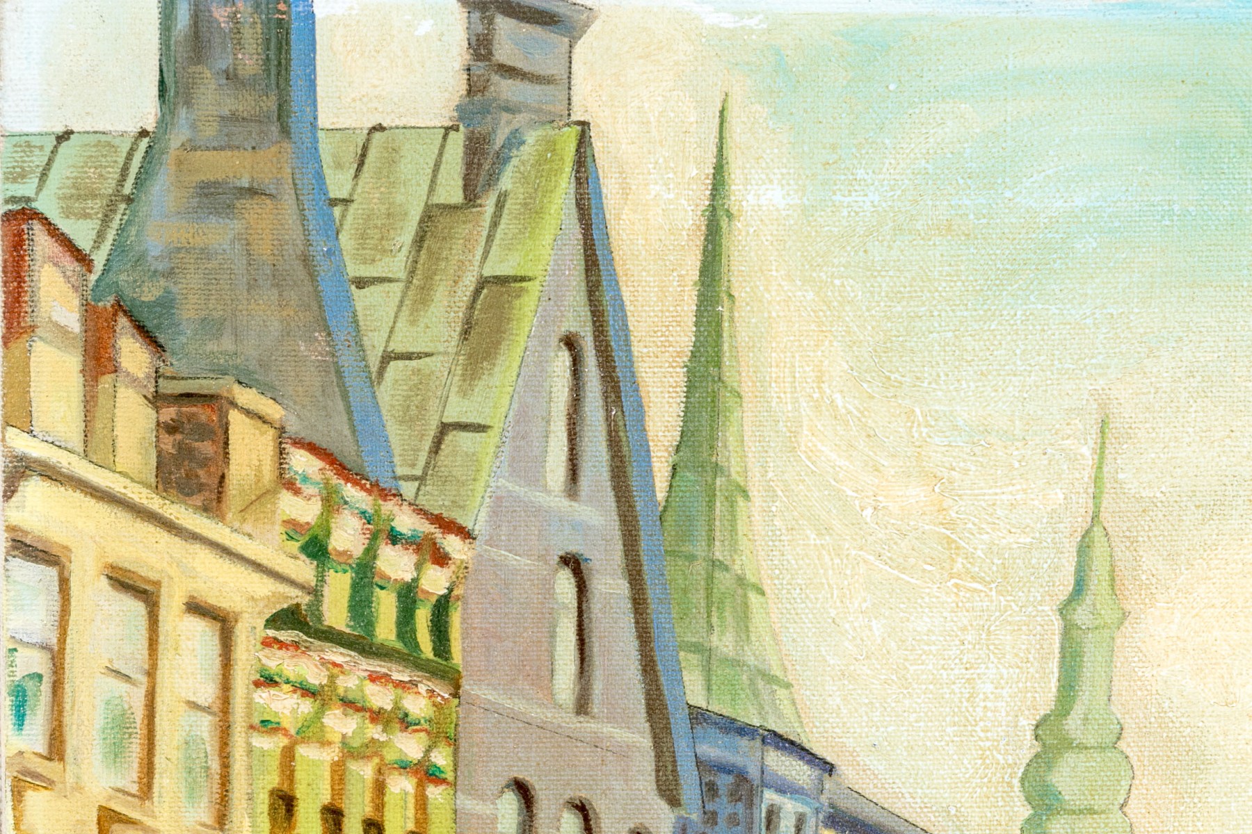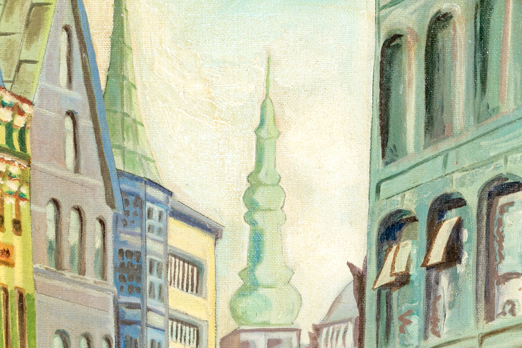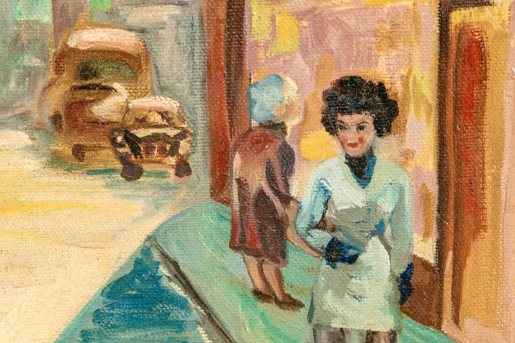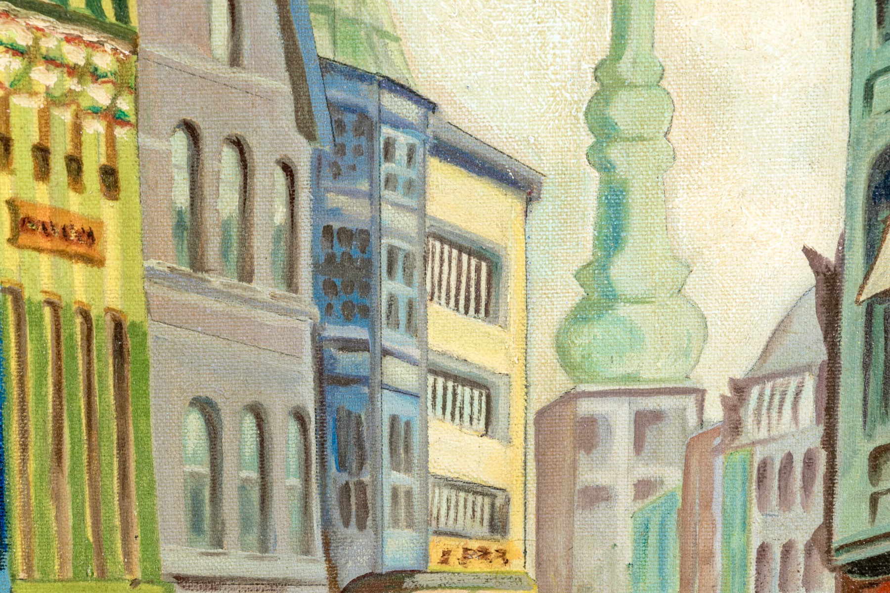 Oil on canvas depicting an urban street scene with figures walking on the sidewalks.