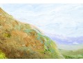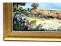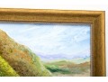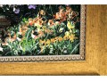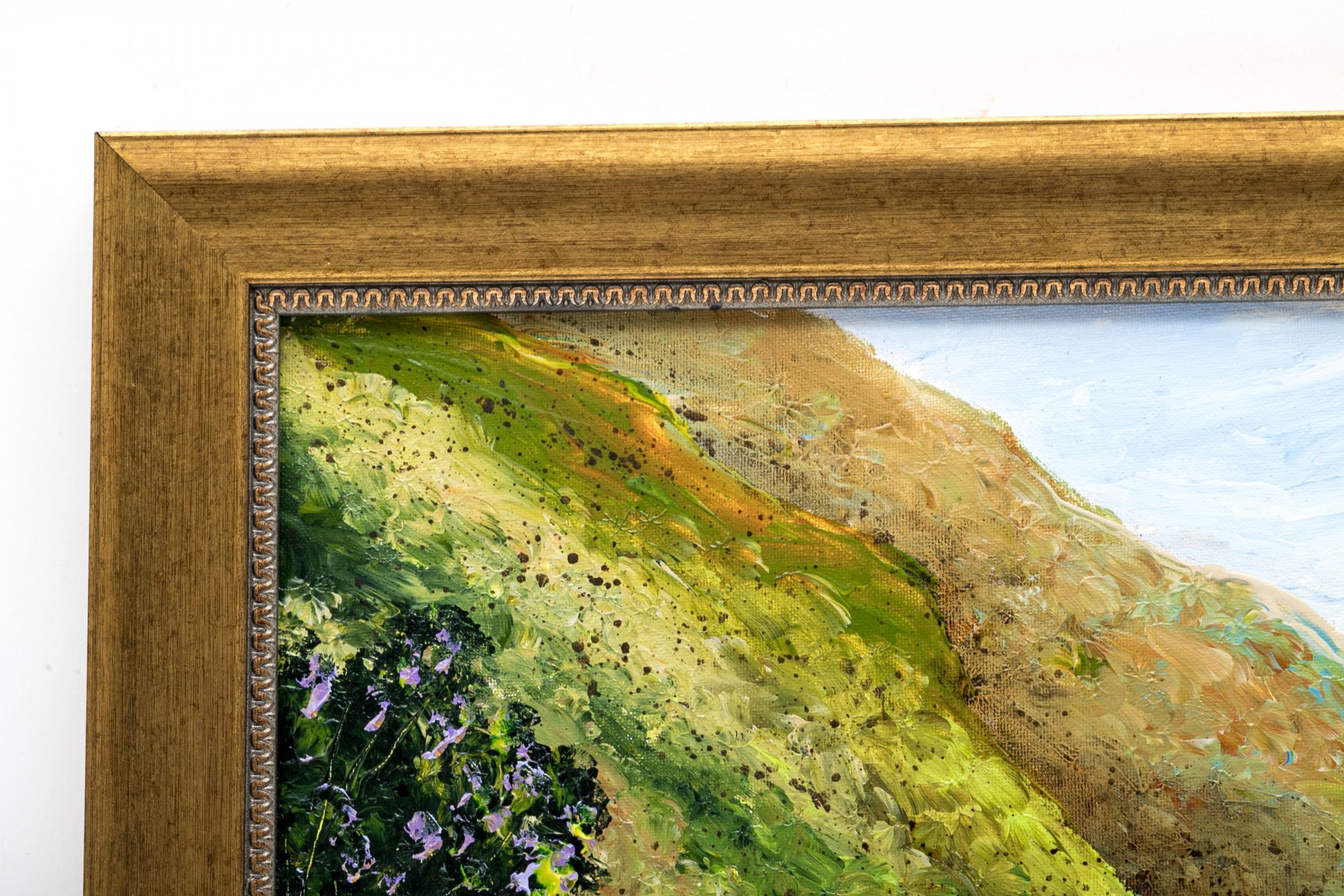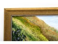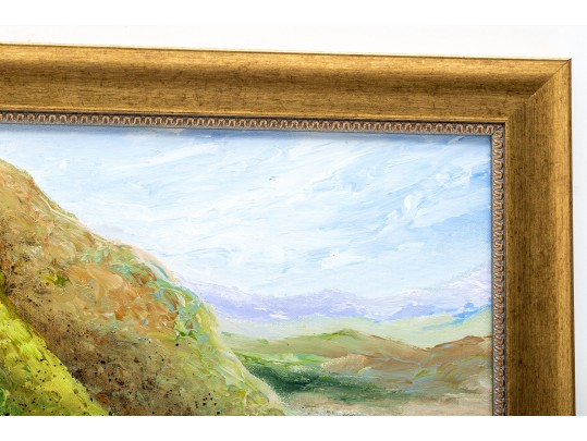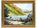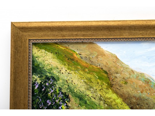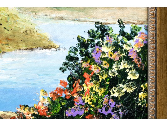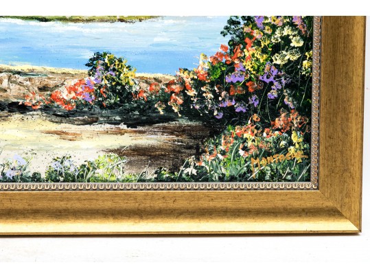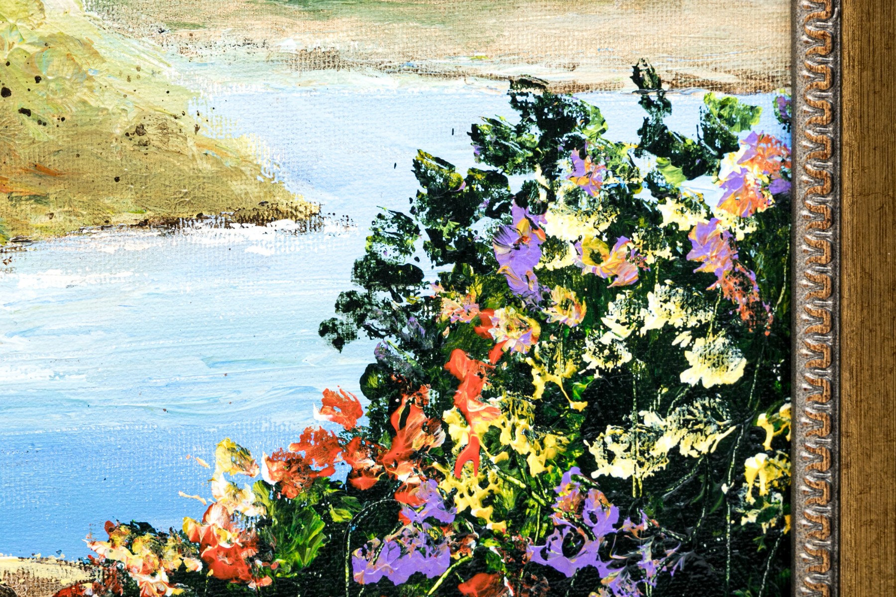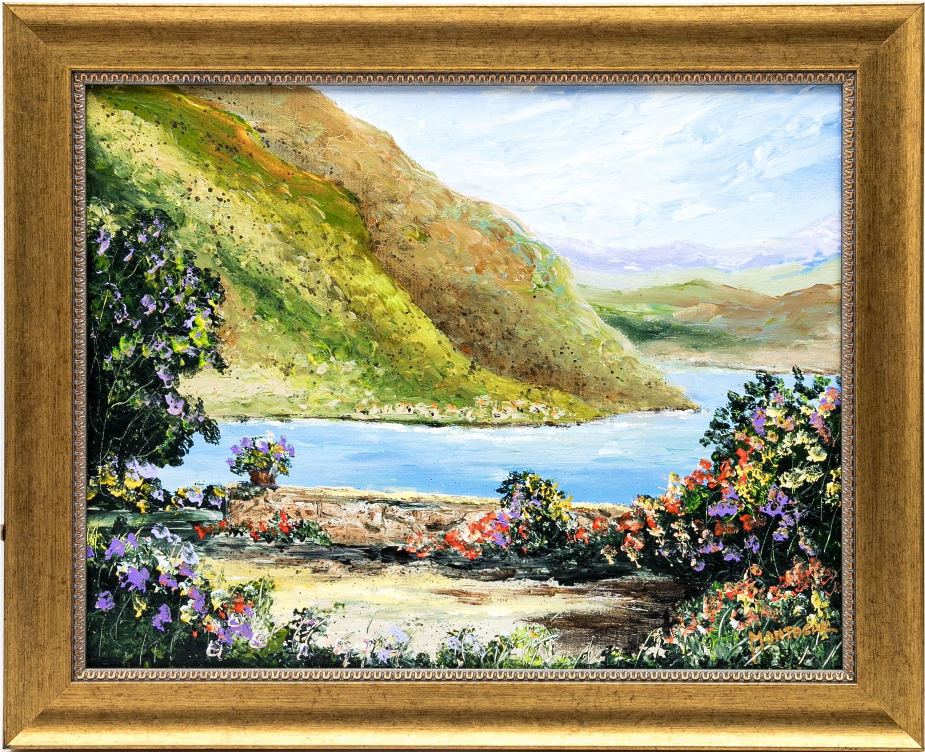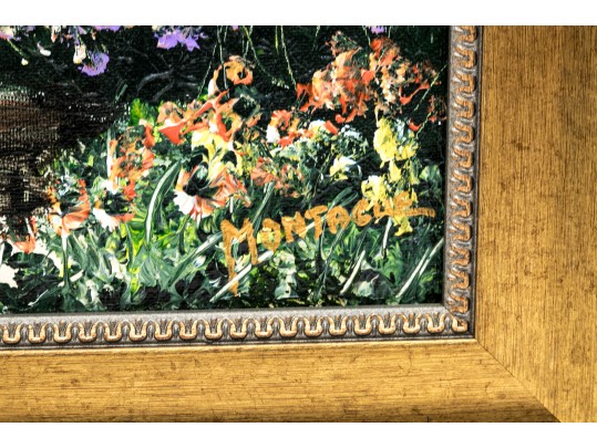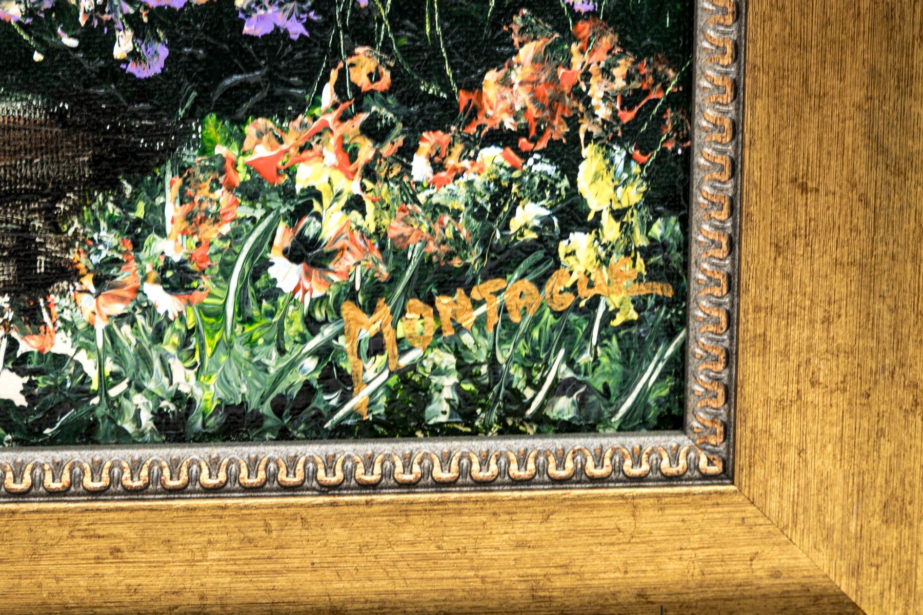 Acrylic on canvas board painting depicting a vibrant garden courtyard with burgeoning purple, red, and yellow flowers. The scene overlooks a calm blue lake scaled by a tall grassy mountain piercing a purple and periwinkle blue sky in the background. Signed "Montague" lower right. Displayed without glass in a gilt frame with a relief inner border.