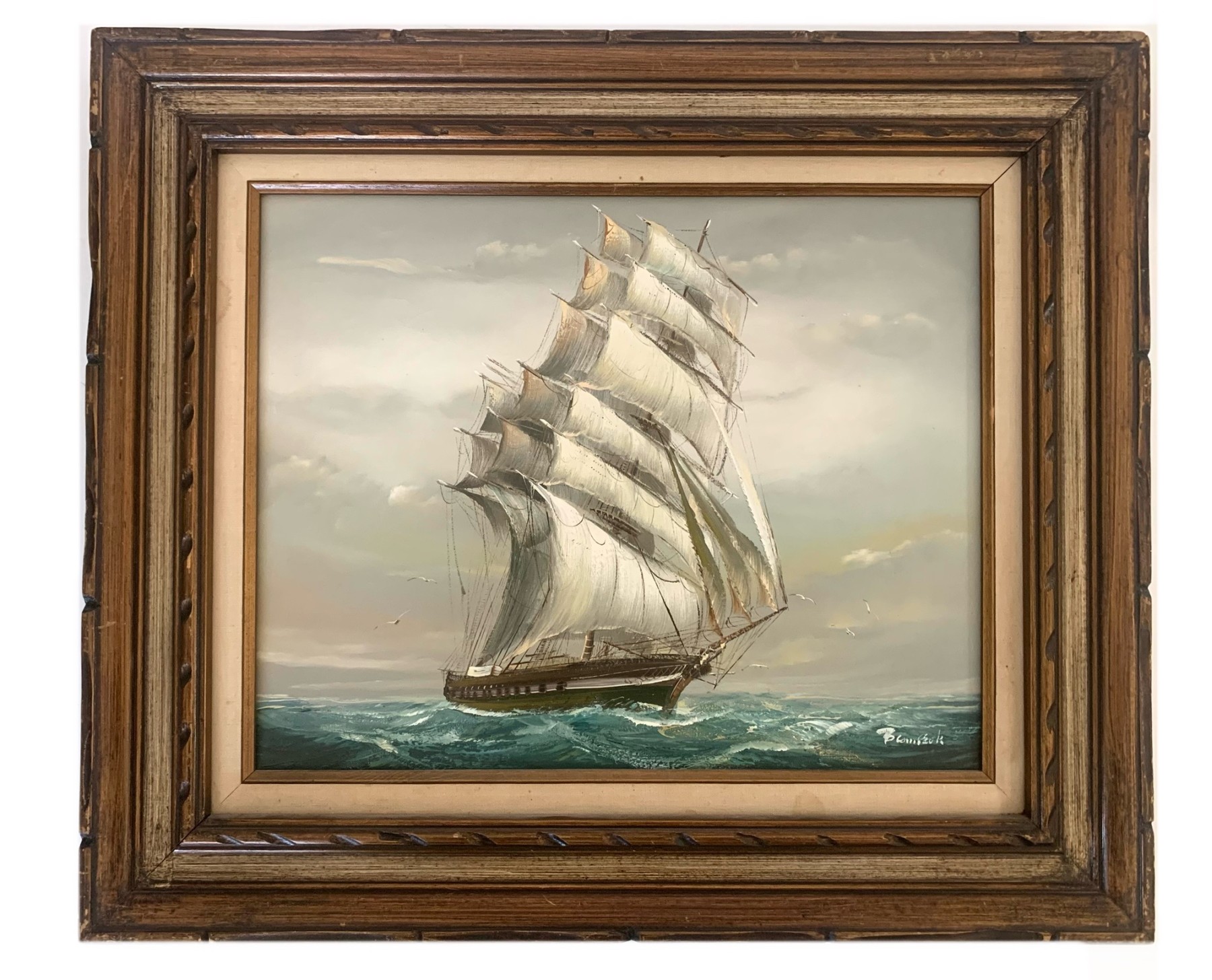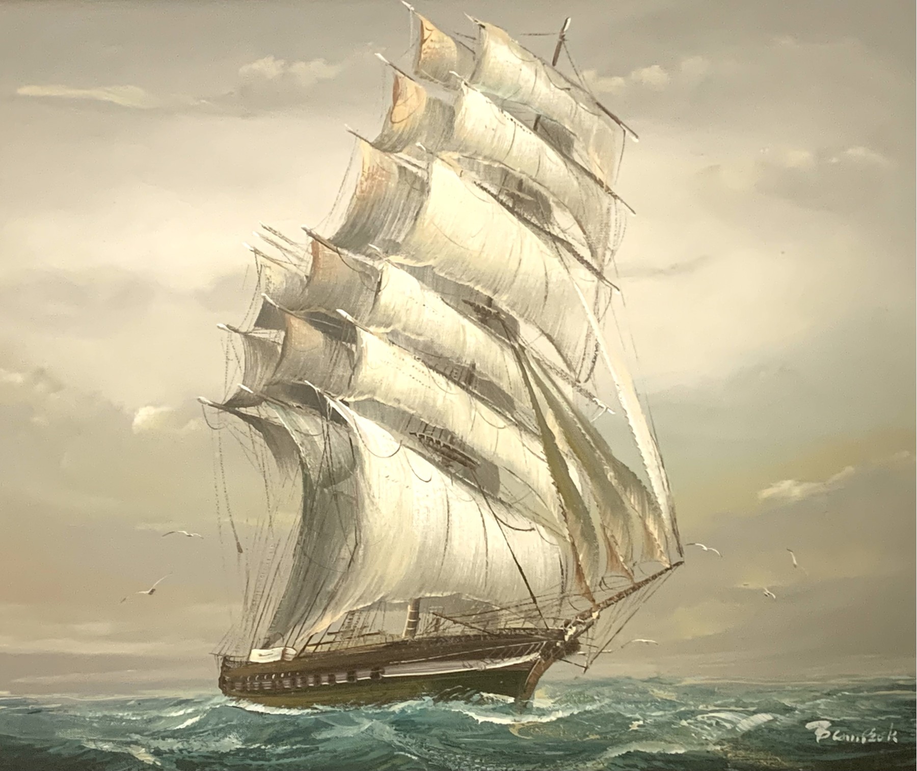 Oil on canvas depicting a masted ship on blue white foam capped waves and set against a cloudy sky.