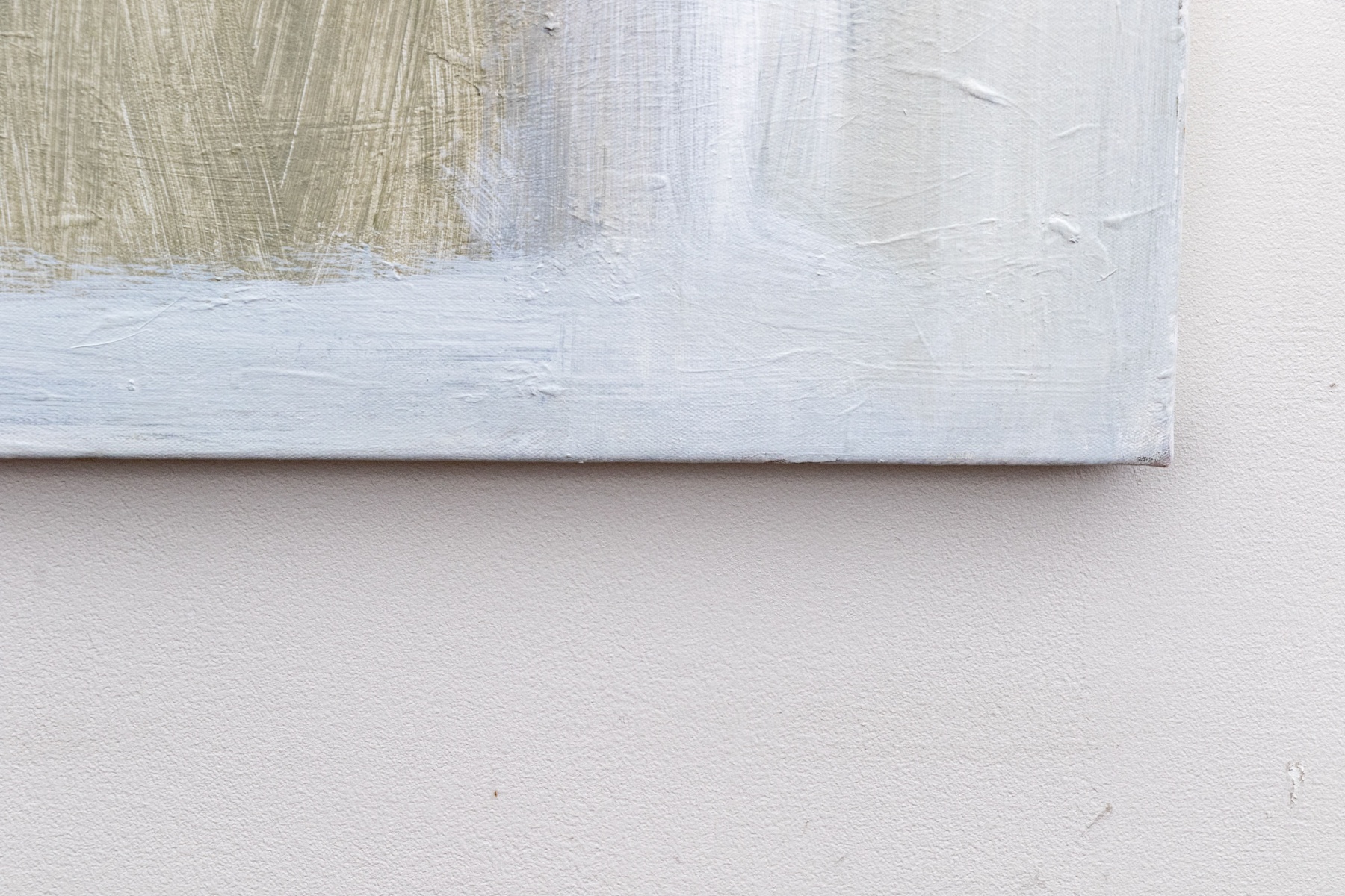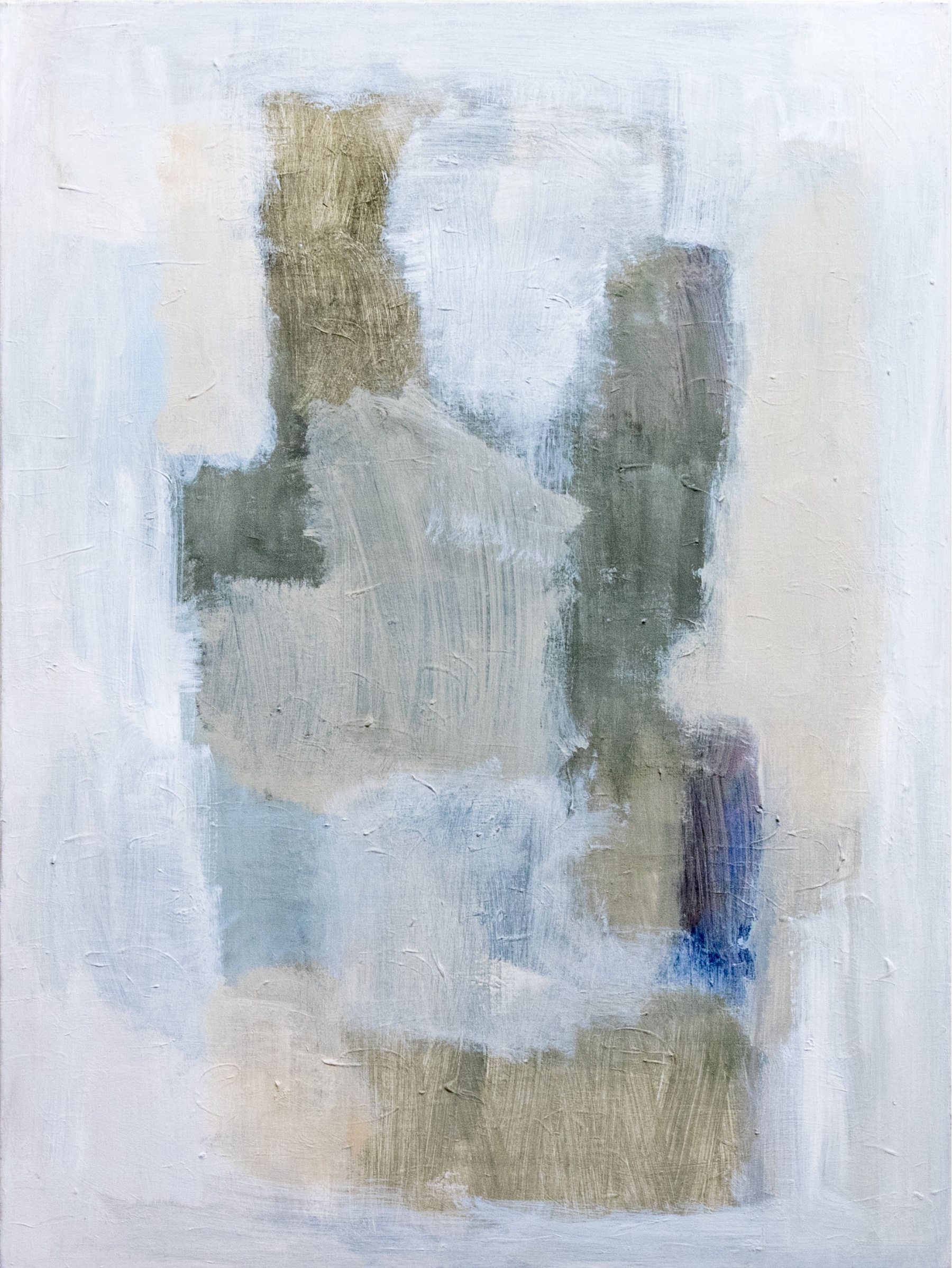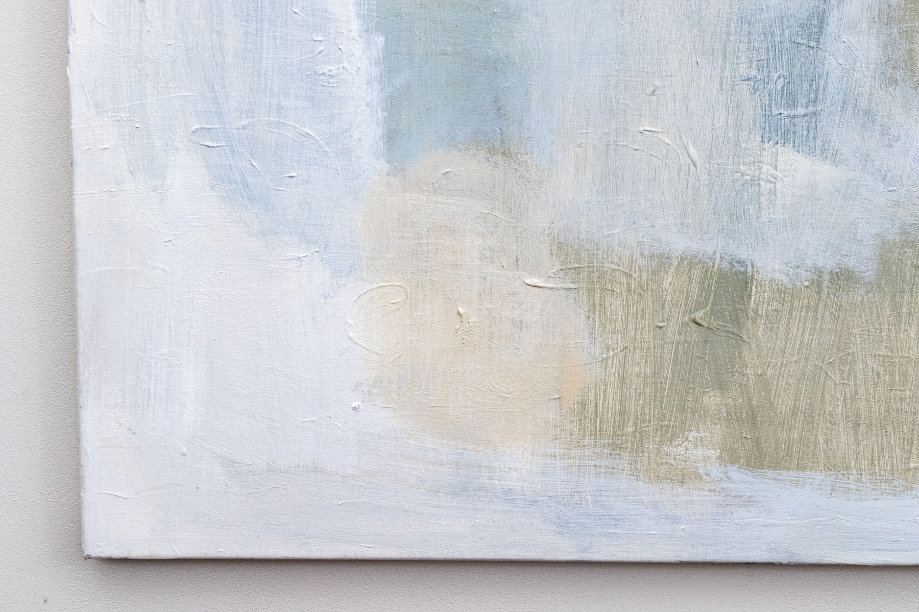 A well sized and nicely rendered painting on canvas depicting an abstract composition of textural and organically shaped rectangular forms overlapping in hues of cream, beige, brown, and blue against a white-blue ground. Signed on the verso. The canvas is mounted to a stretcher, unframed.