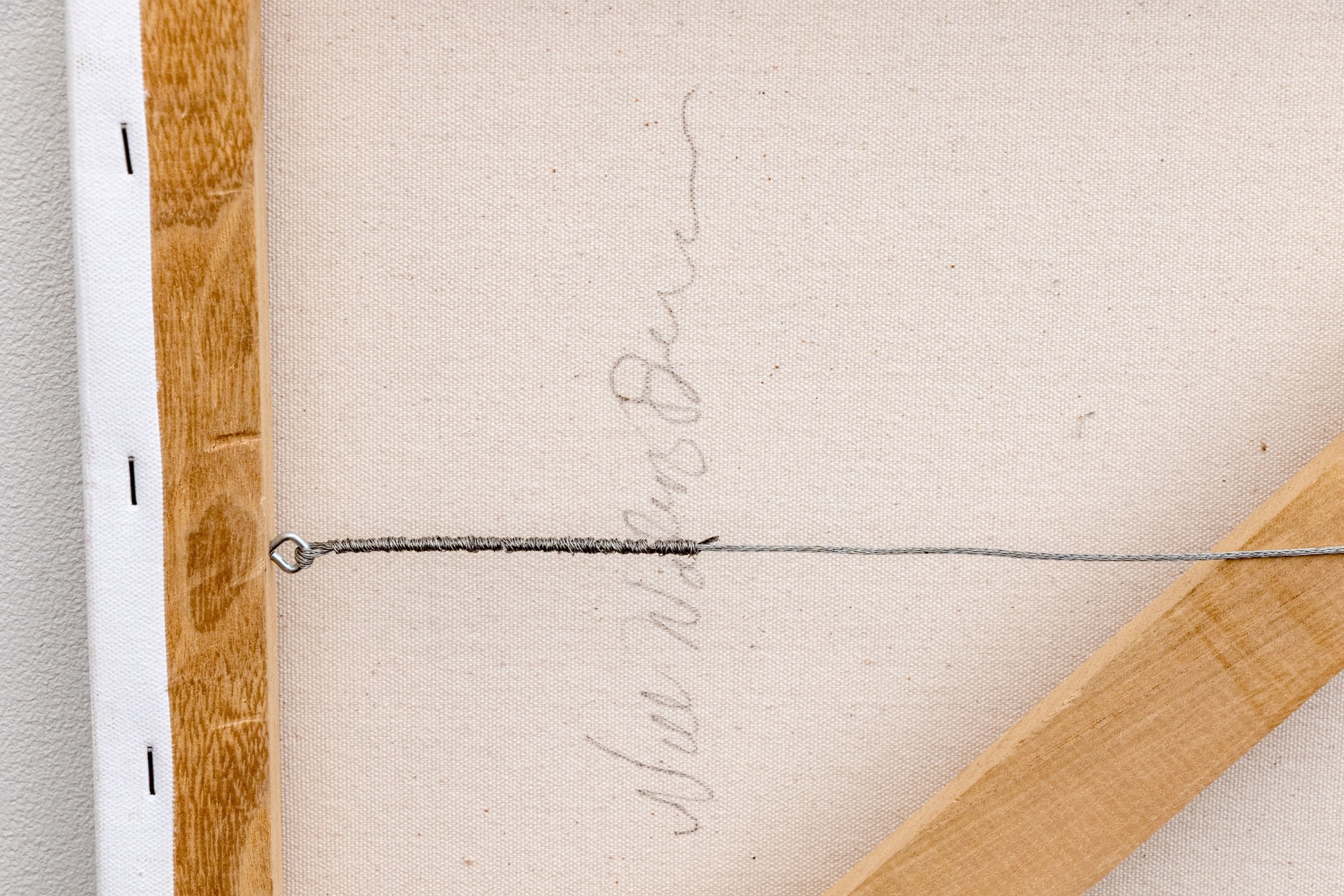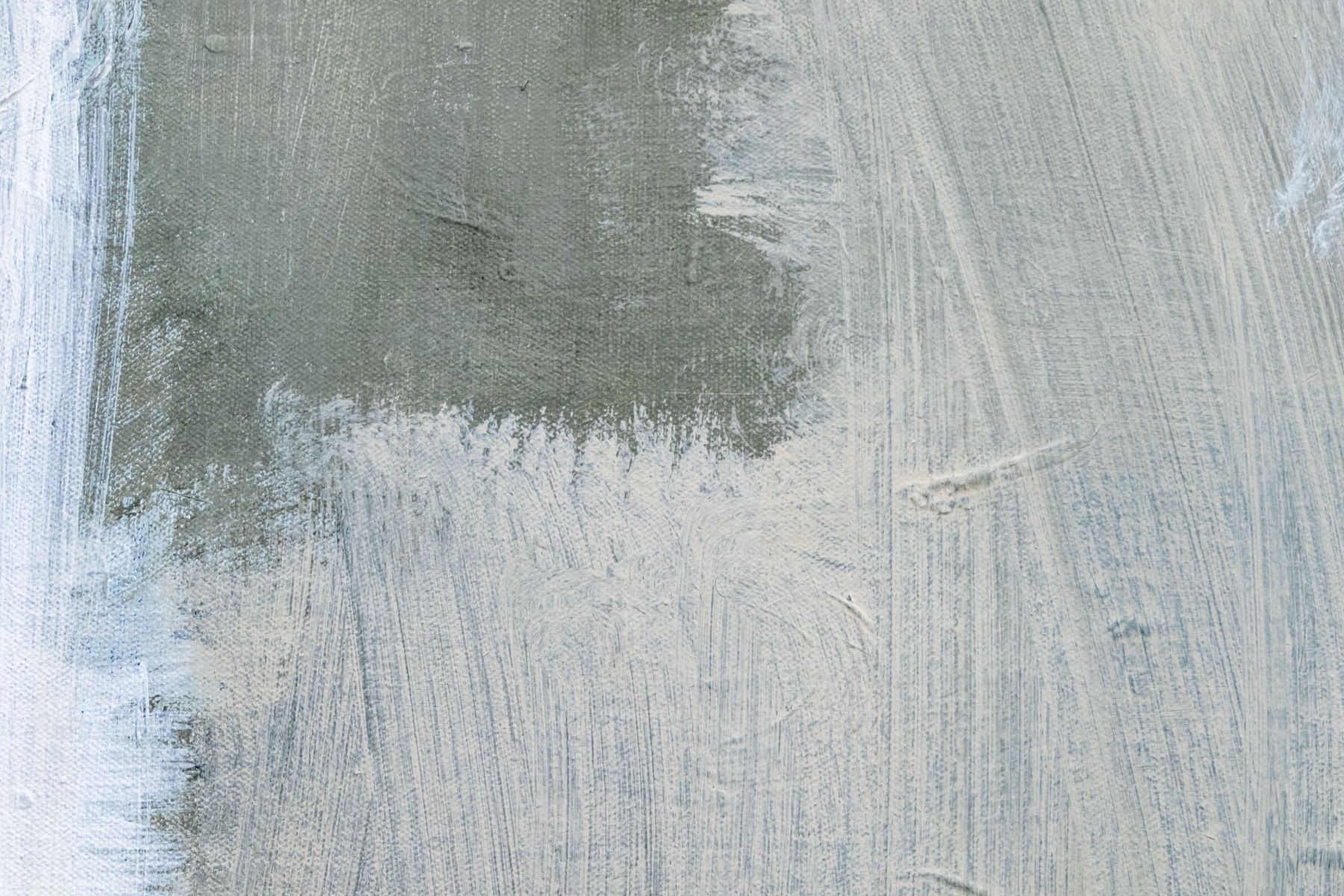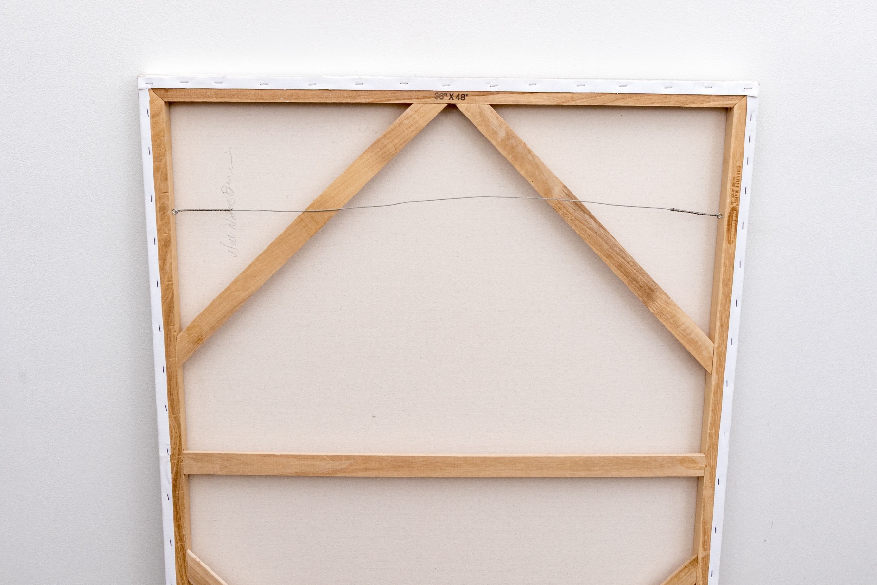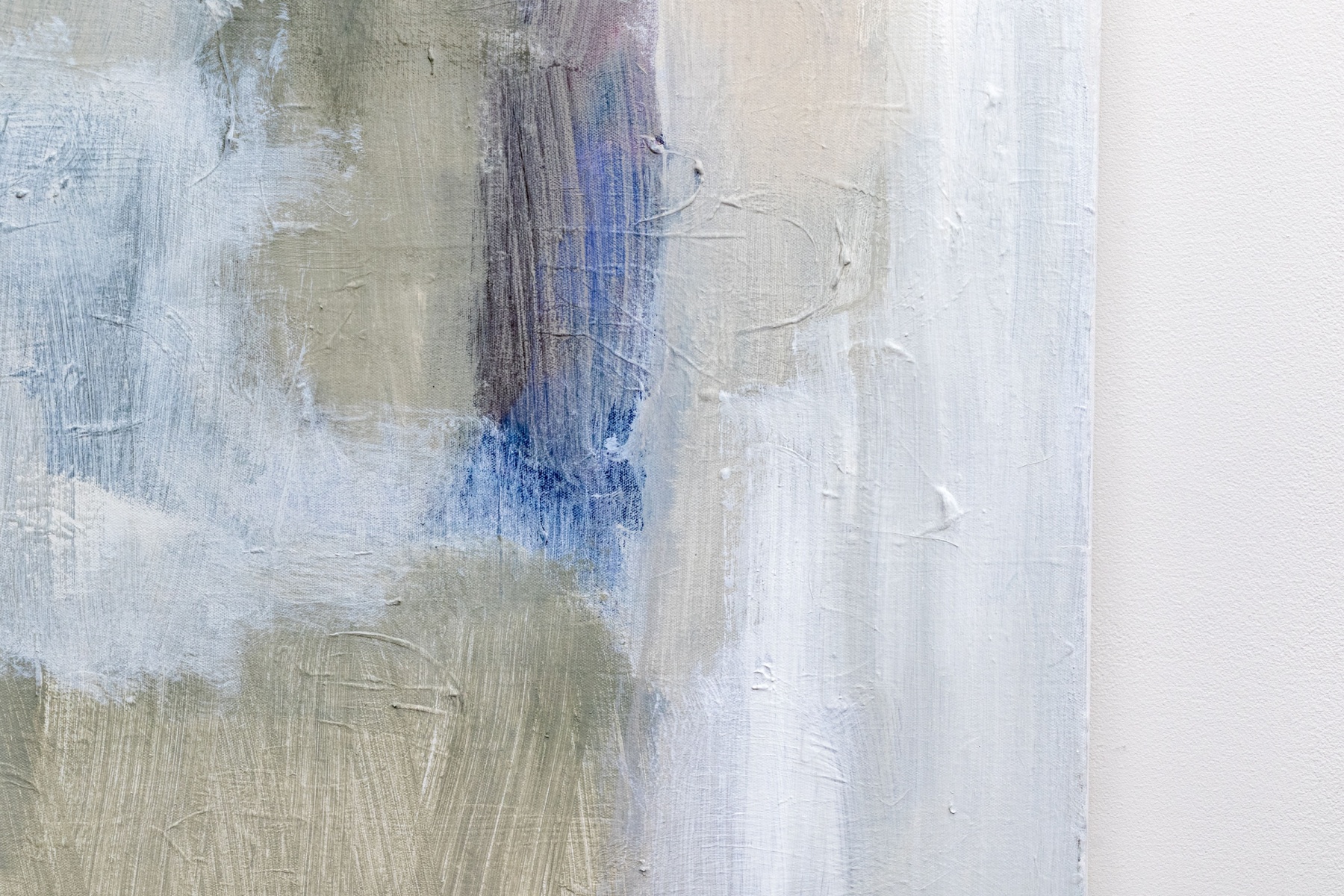 A well sized and nicely rendered painting on canvas depicting an abstract composition of textural and organically shaped rectangular forms overlapping in hues of cream, beige, brown, and blue against a white-blue ground. Signed on the verso. The canvas is mounted to a stretcher, unframed.