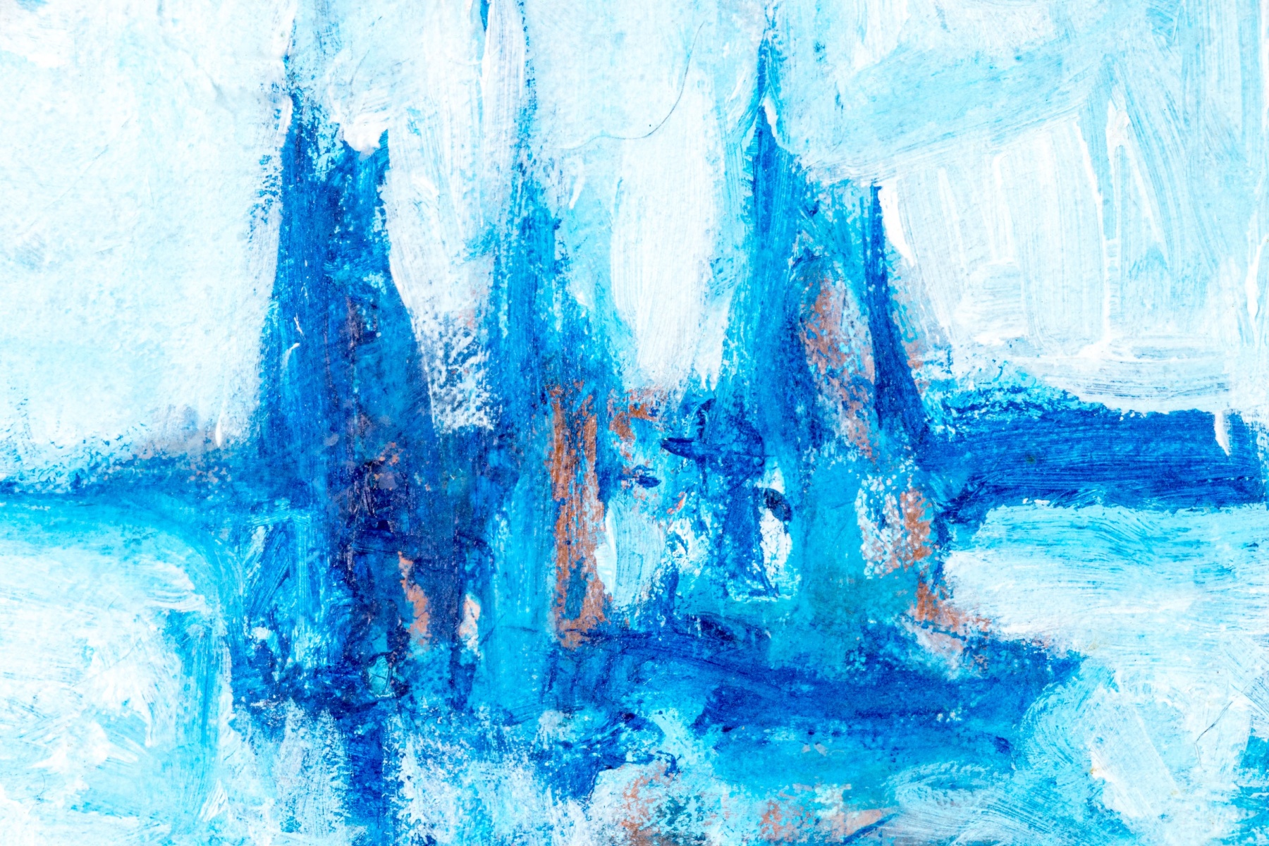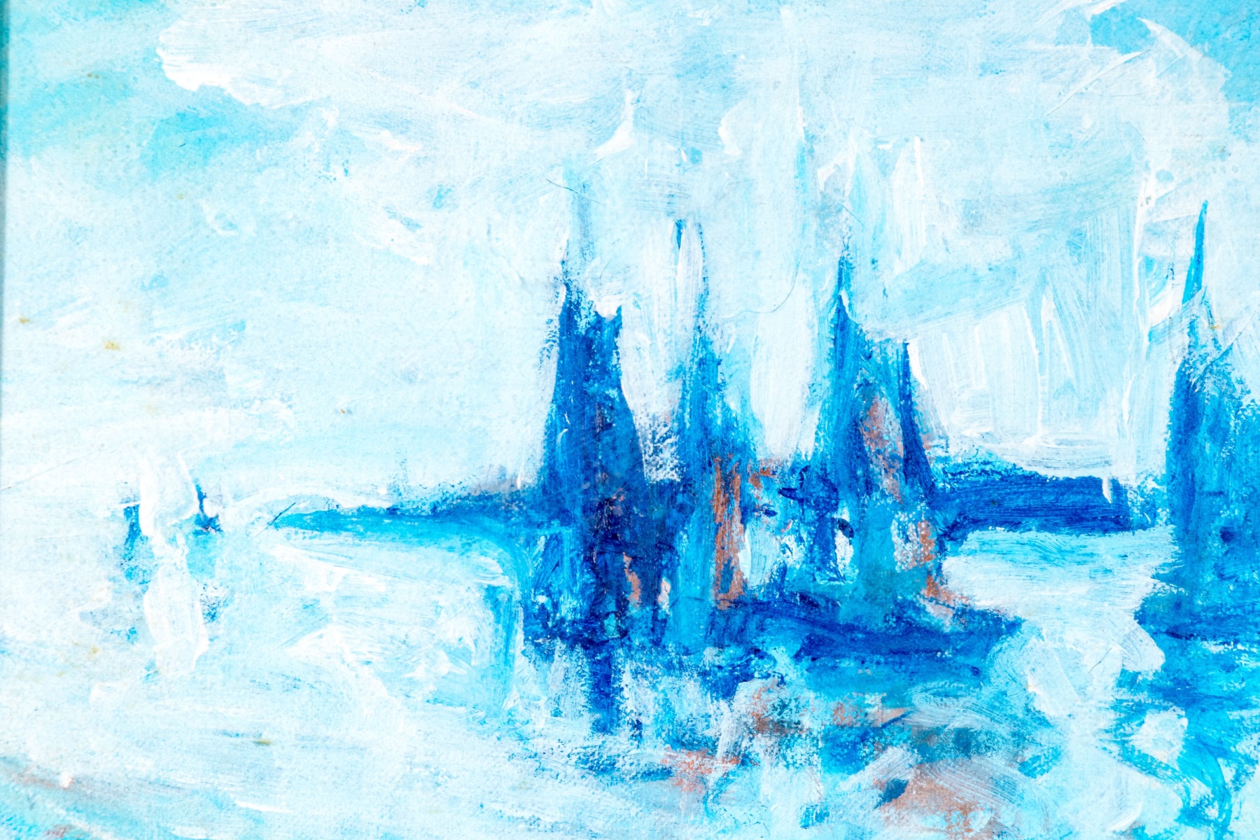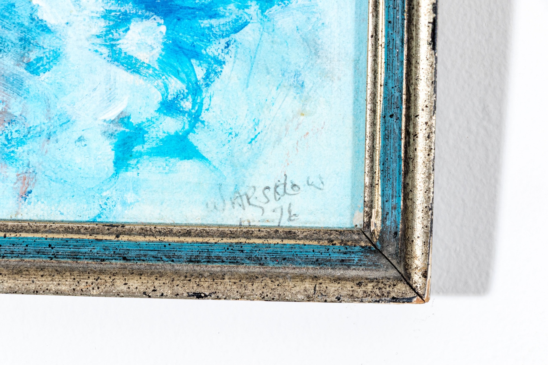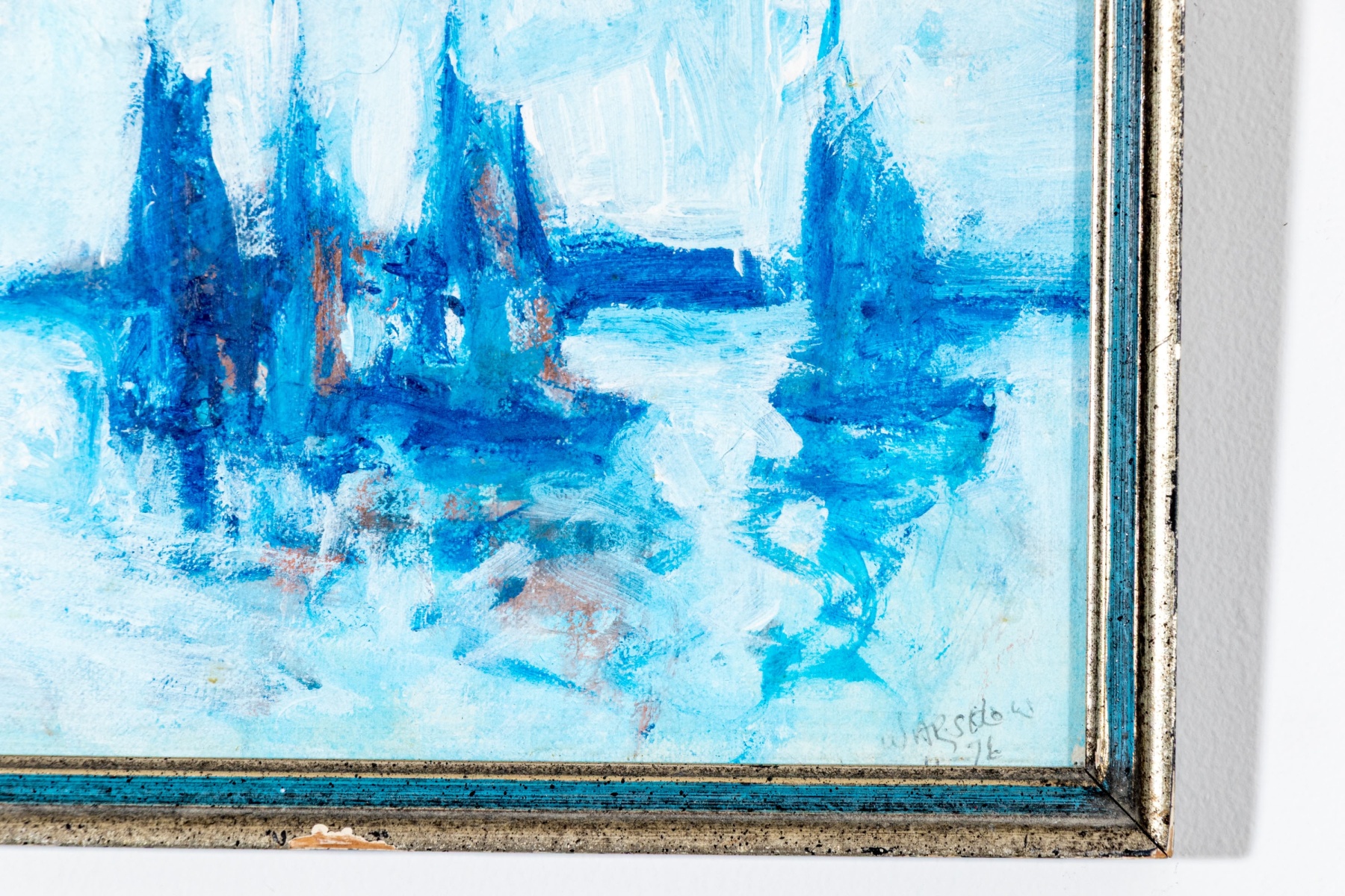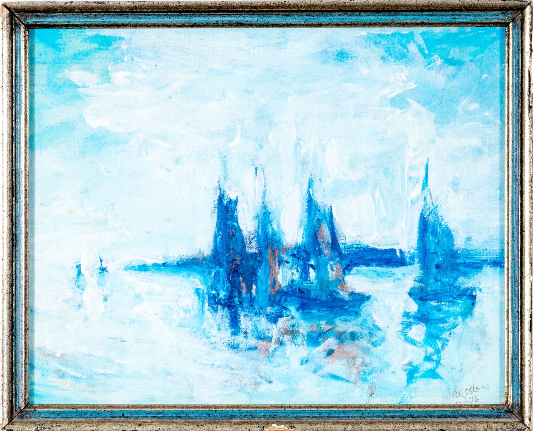 A charming oil painting on board depicting an expressionist scene of dark blue sailboats on pale, calm water accented with hints of warm brown beneath a vast, light sky. Signed lower right potentially appearing Warsidow or Warsodow and dated '76.