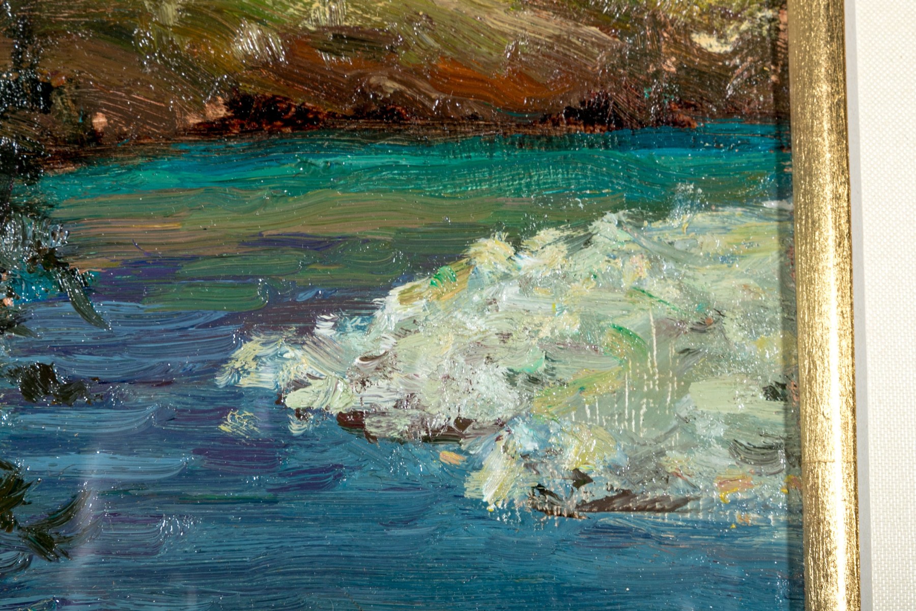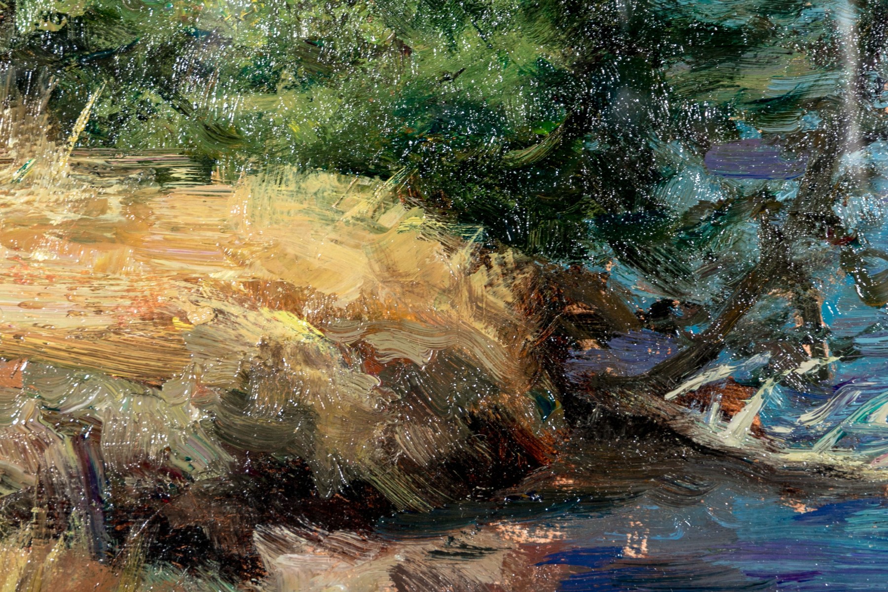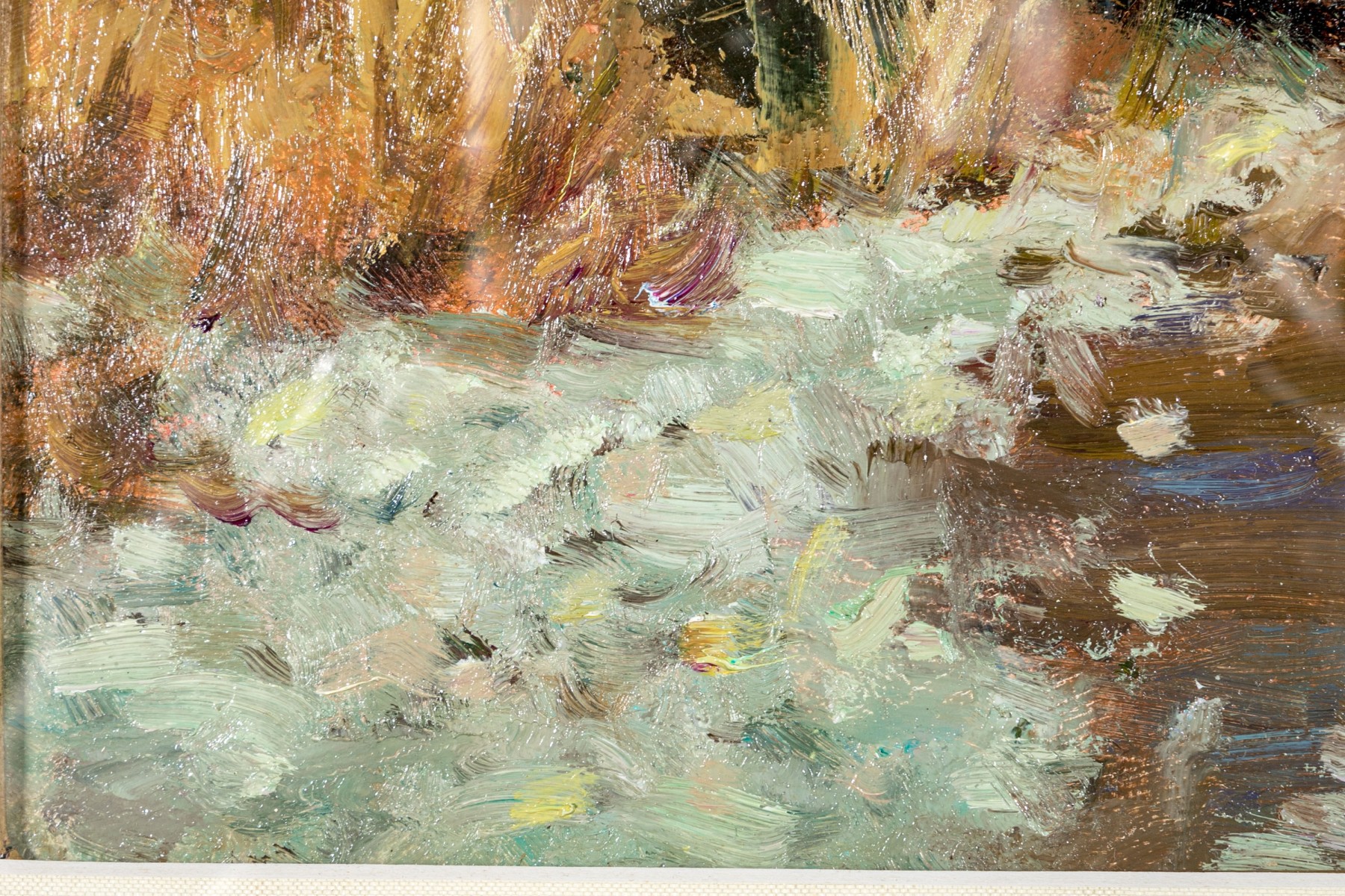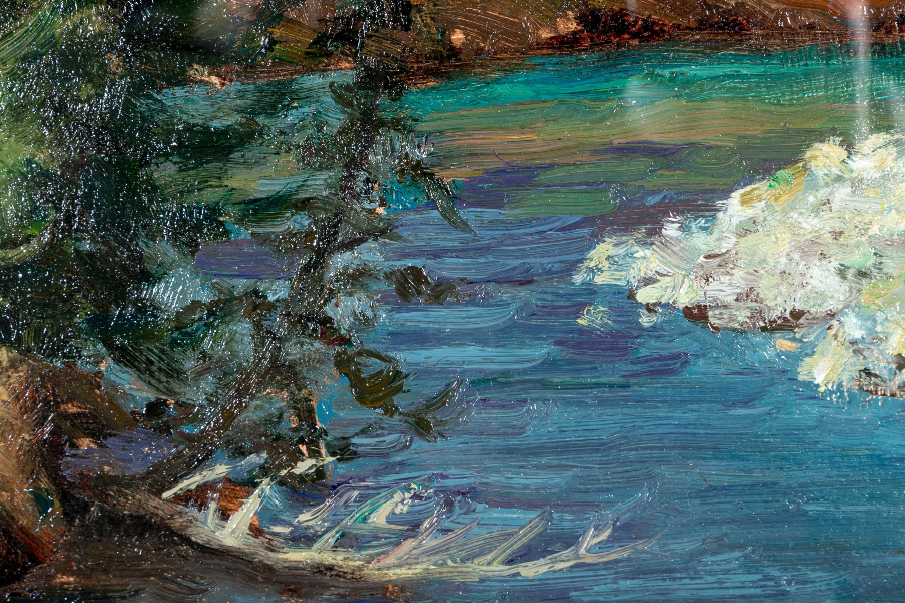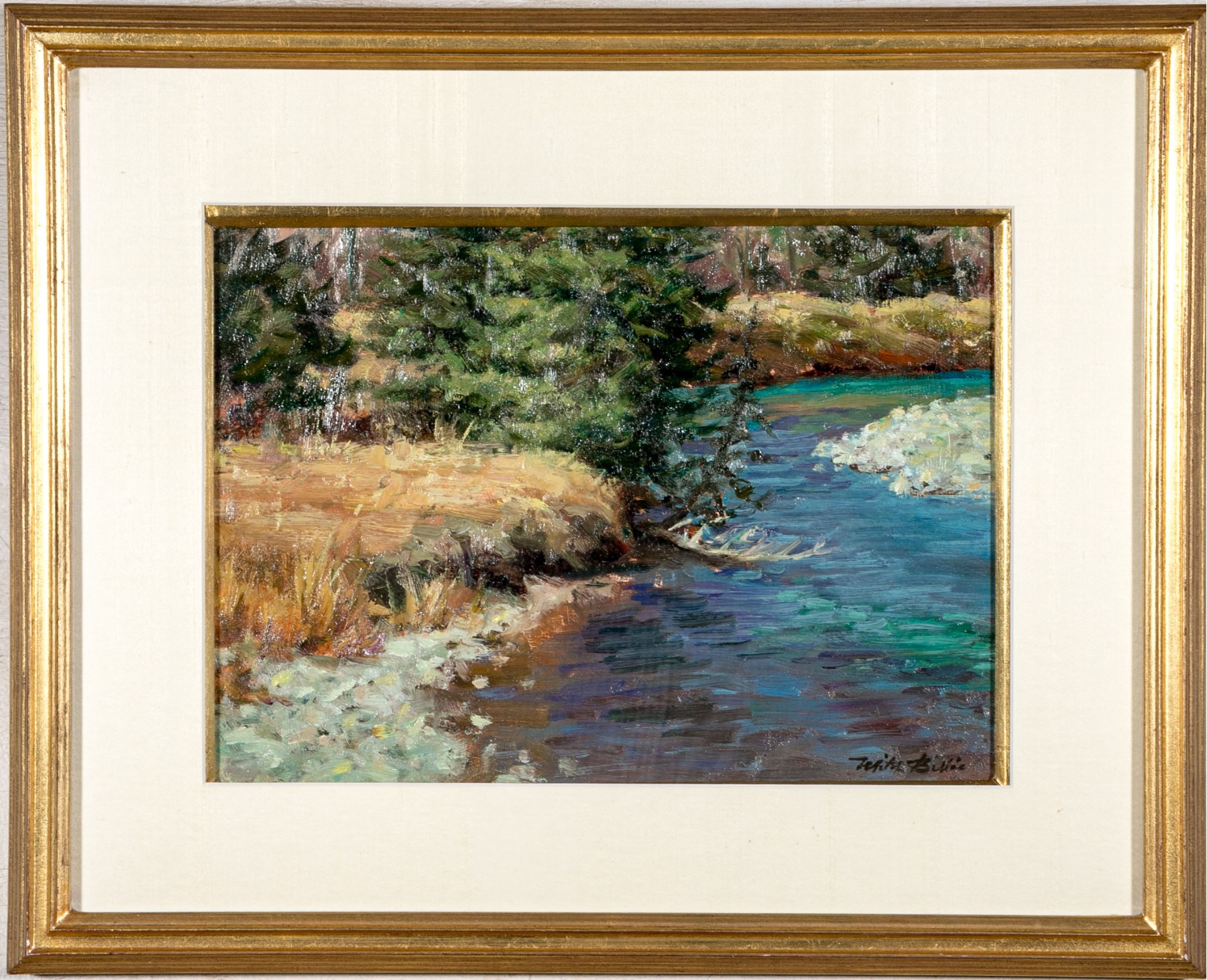 The painting wonderfully depicts an Impressionistic scene of a landscape with body of water on the right side, a lake or river with the natural earth and wild grasses and evergreen trees all wonderfully painted as though en plein air. Signed indistinctly lower right.