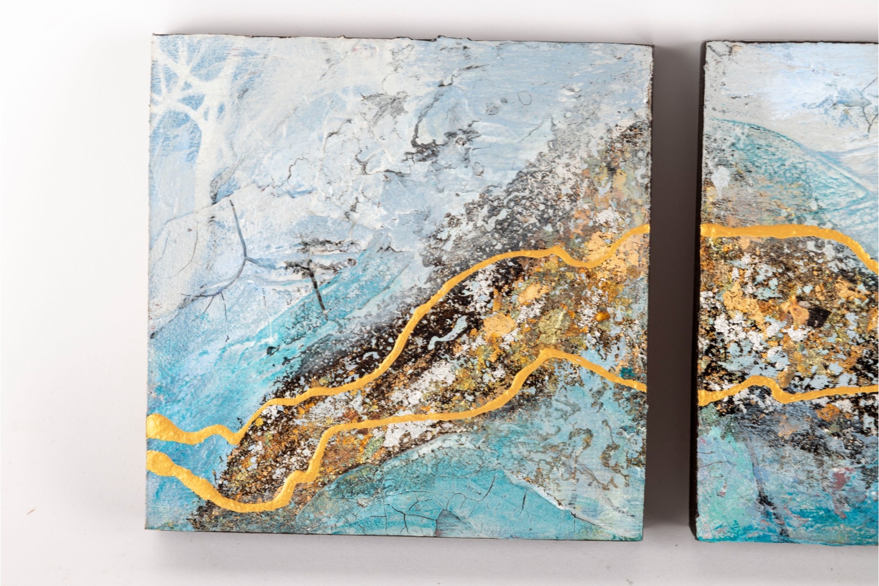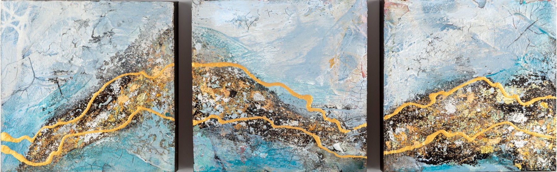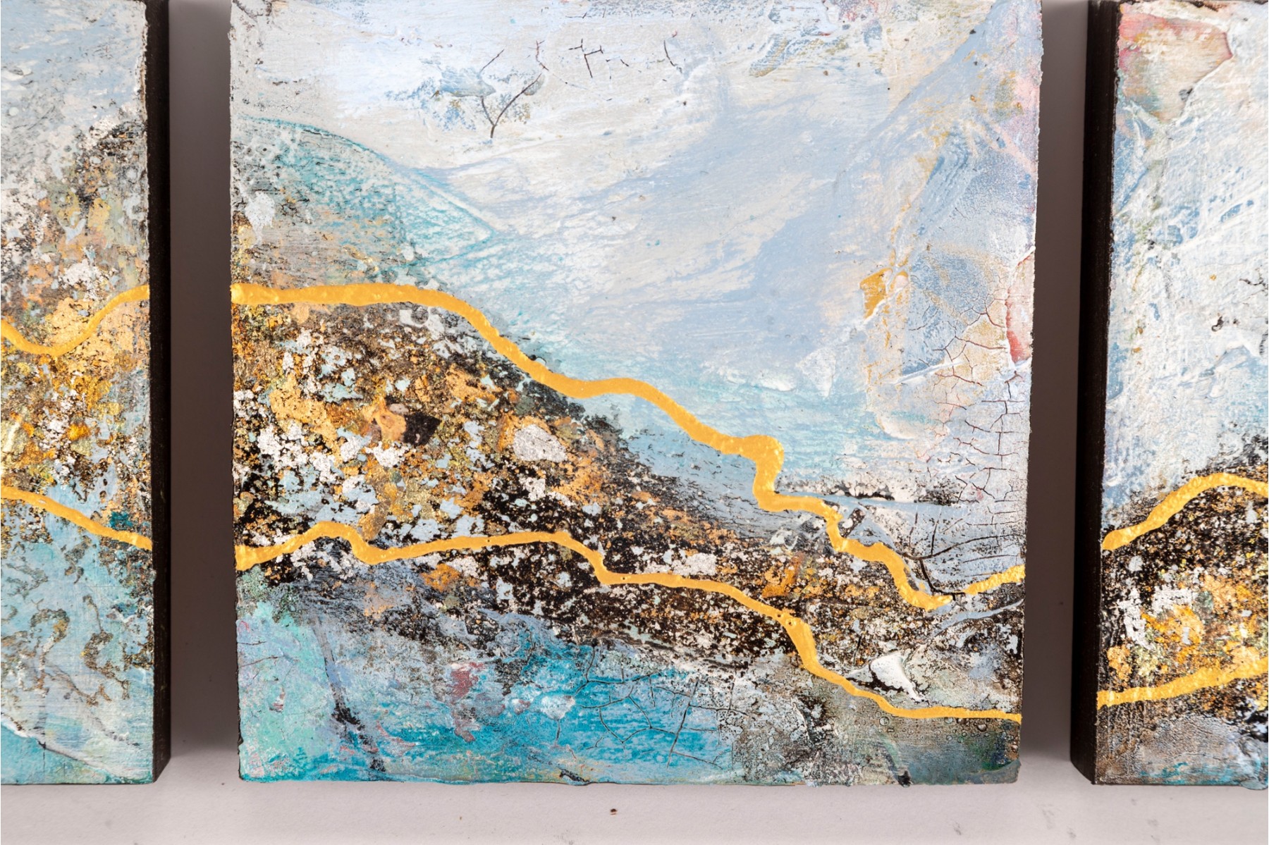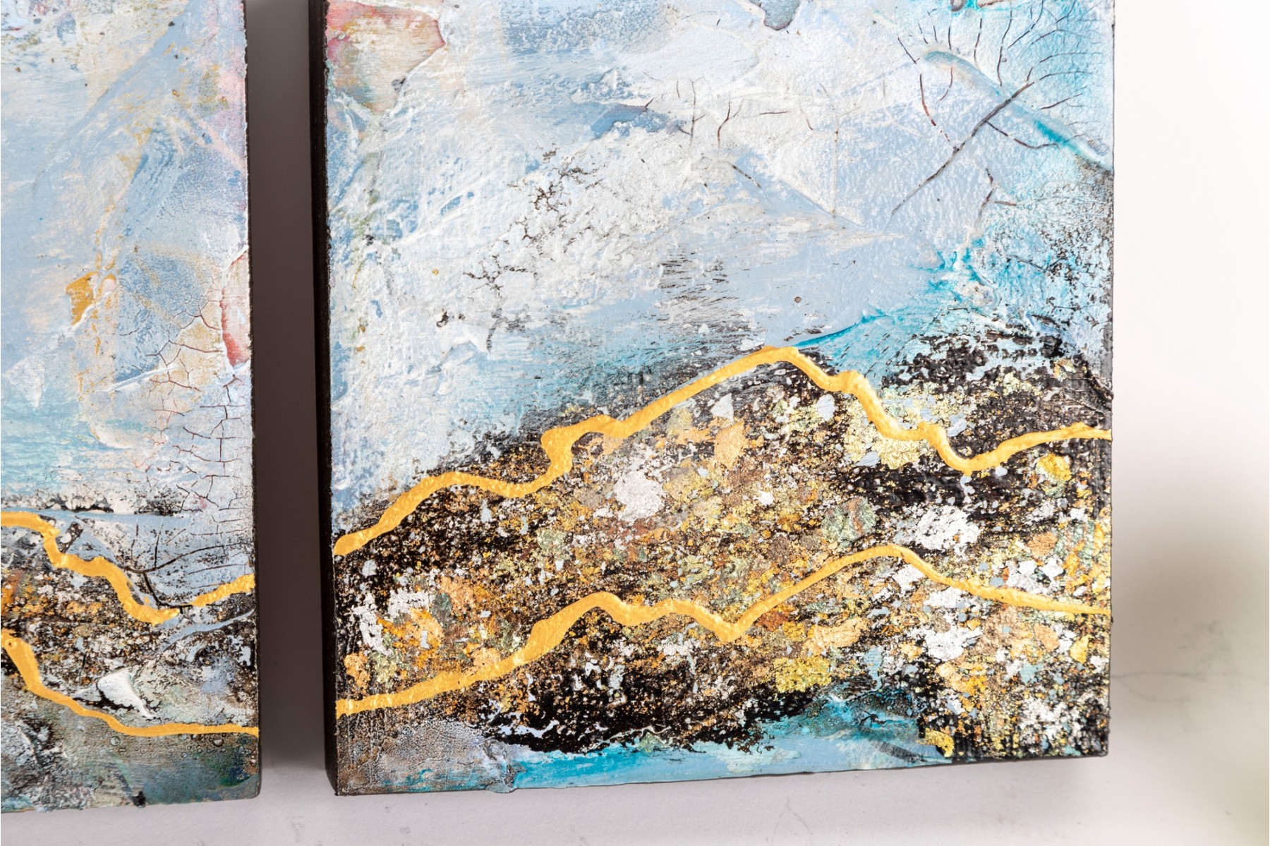 A trio of three signed artworks presenting oil on board co-ordinating abstract displays in textured hues of gold, blue and black.