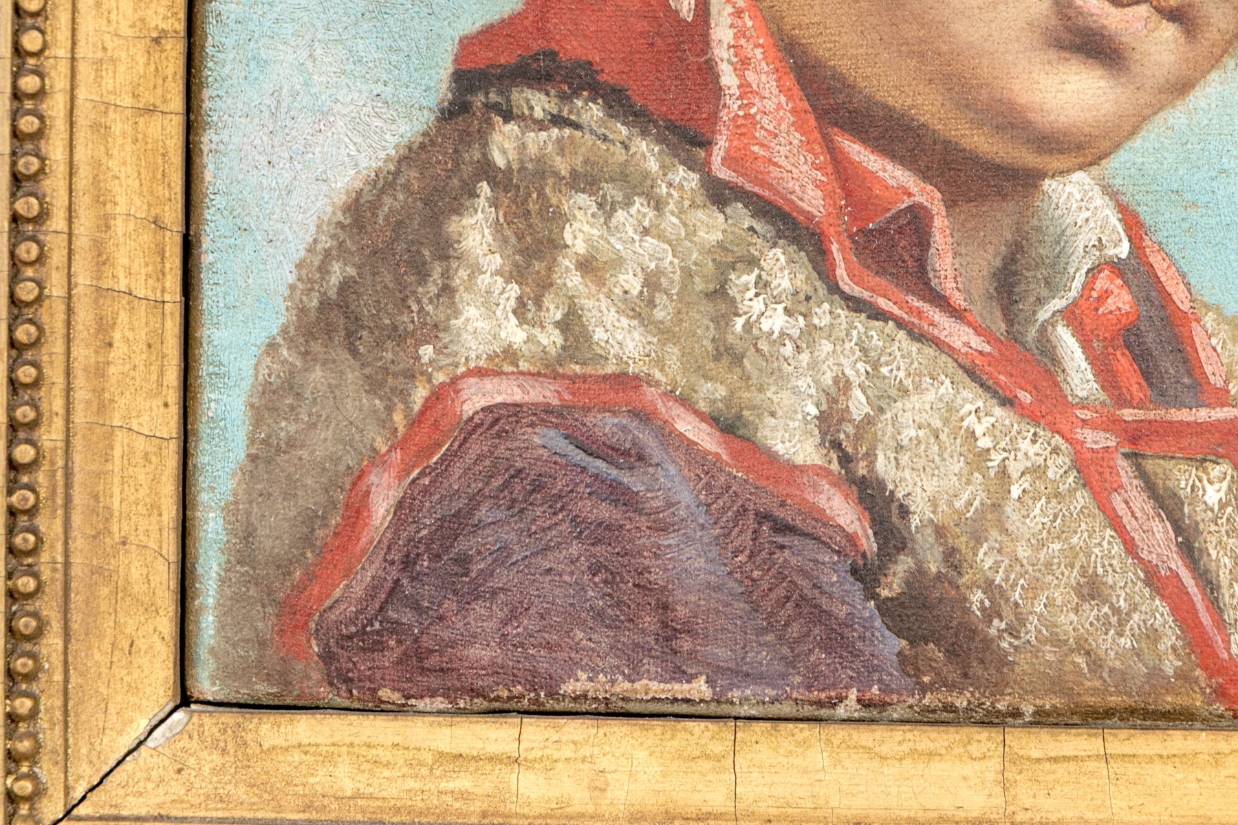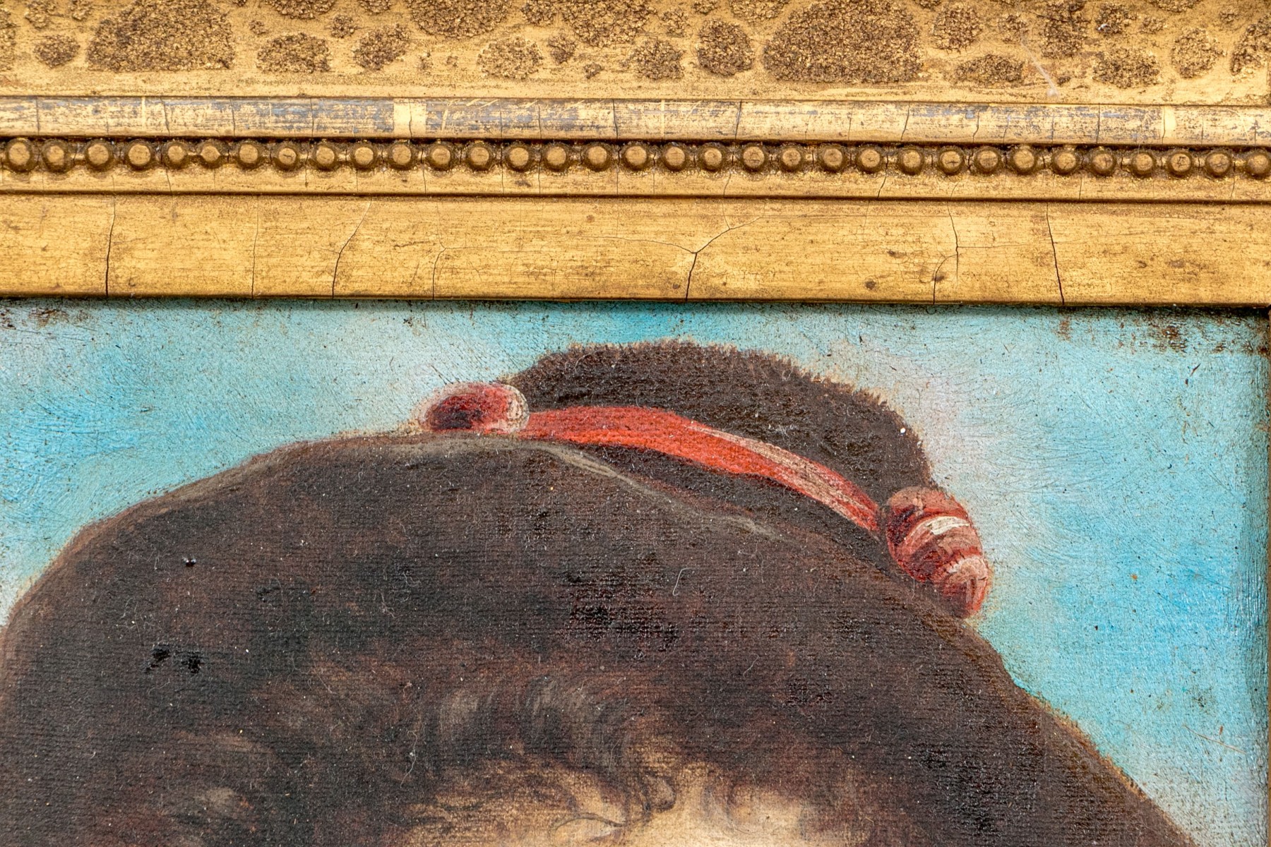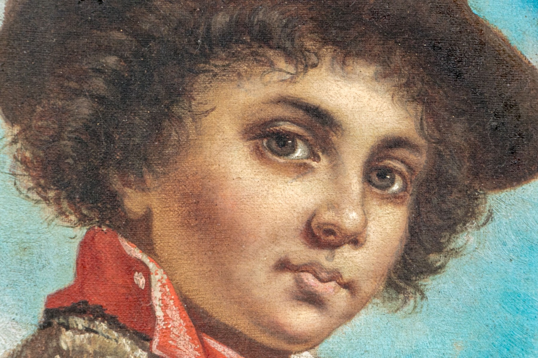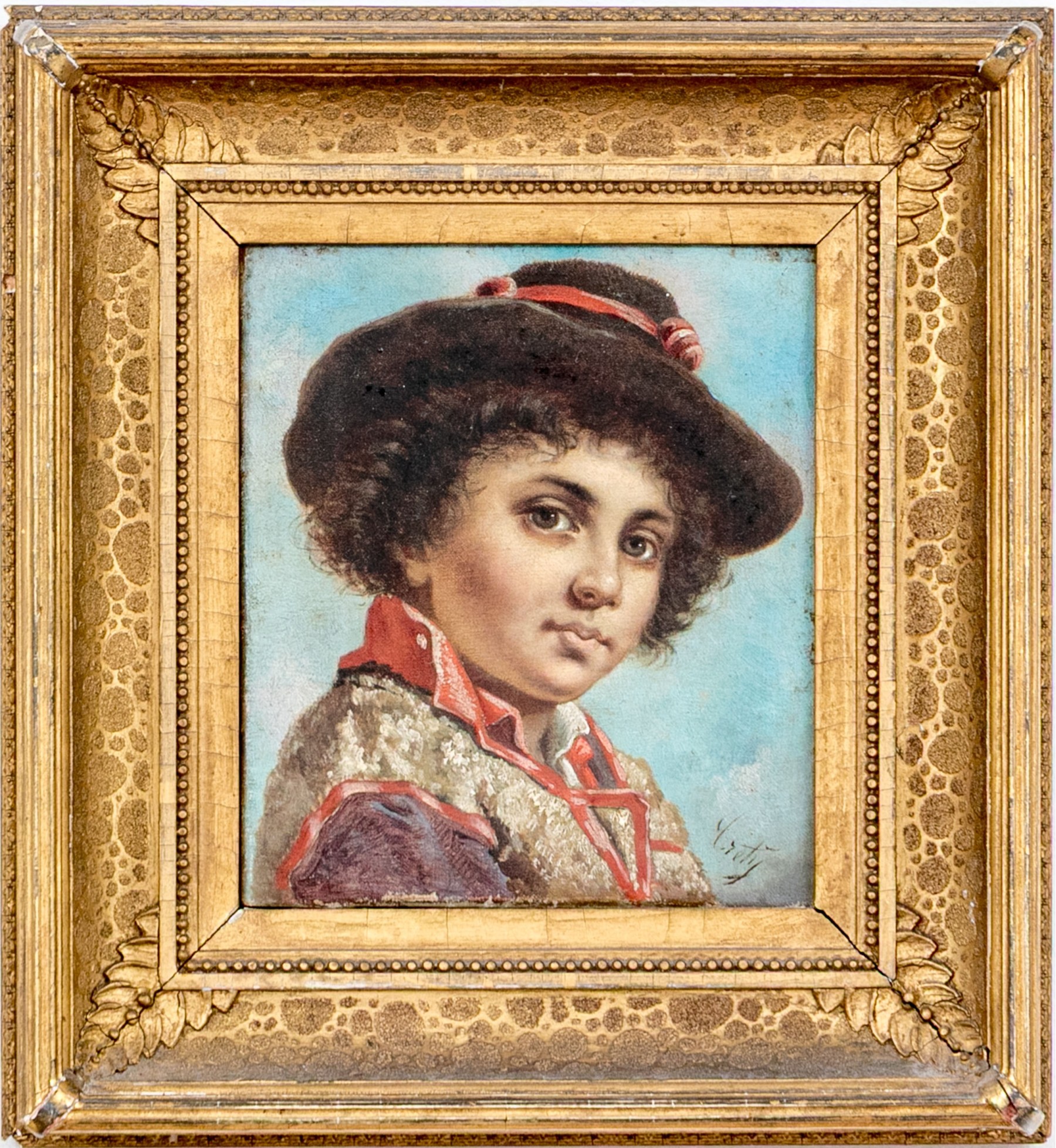 A charming 19th century French school oil painting on canvas depicting a young man with curly brown hair posed in three quarter profile wearing a dark brown hat with a red ribbon and a light brown vest with red trims over a mauve shirt against a sky blue ground. Signed lower right.
