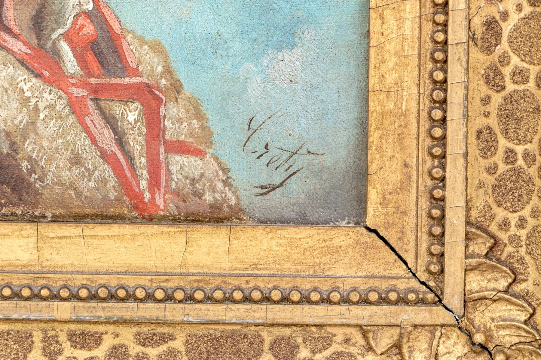 Displayed in a handsomely detailed gilt frame with fern motifs at the corners.