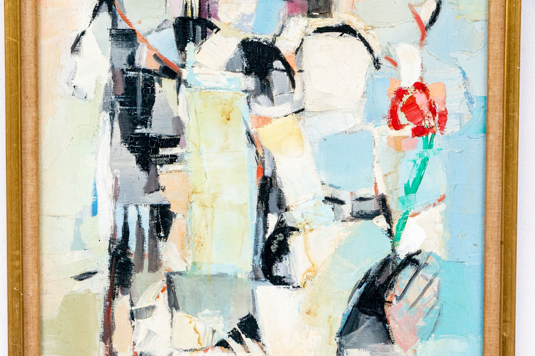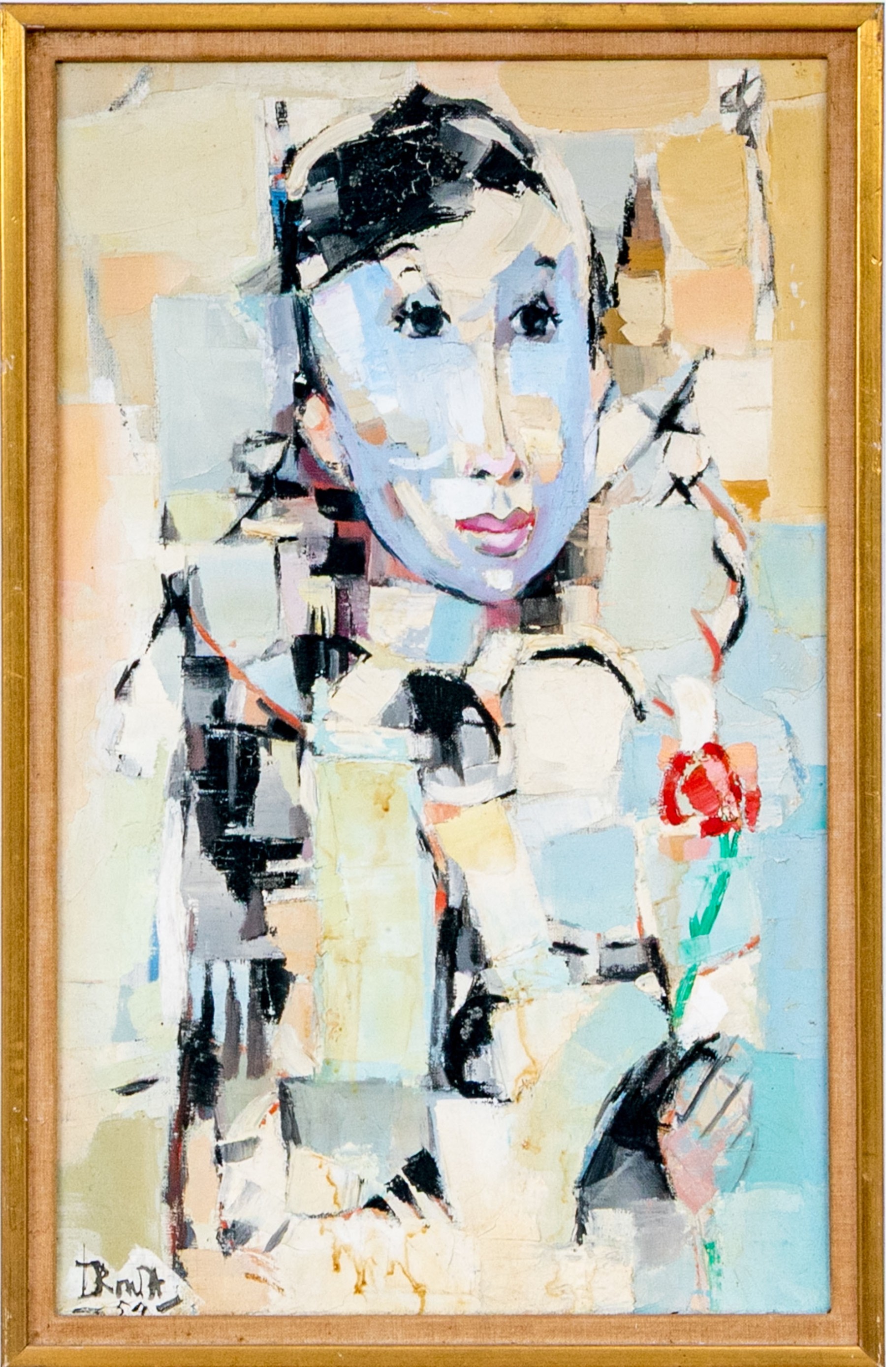A striking cubist oil painting on canvas depicting a portrait of a woman with sleek black hair tied back, holding a red rose on a green stem against a yellow, orange, pale green, and blue gesturally colorblocked background. Signed and dated '59 lower left.