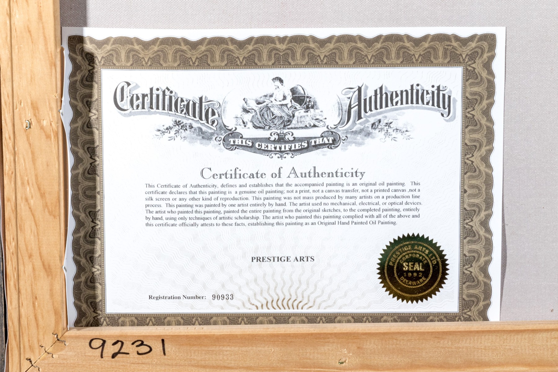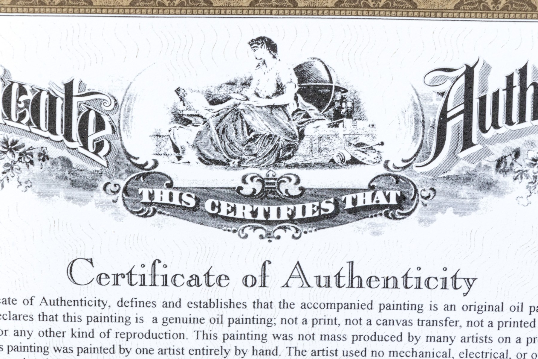 The COA the painting is an original oil painting, not a print, not a canvas transfer, not a printed canvas, not a silk screen or any other kind of reproduction.