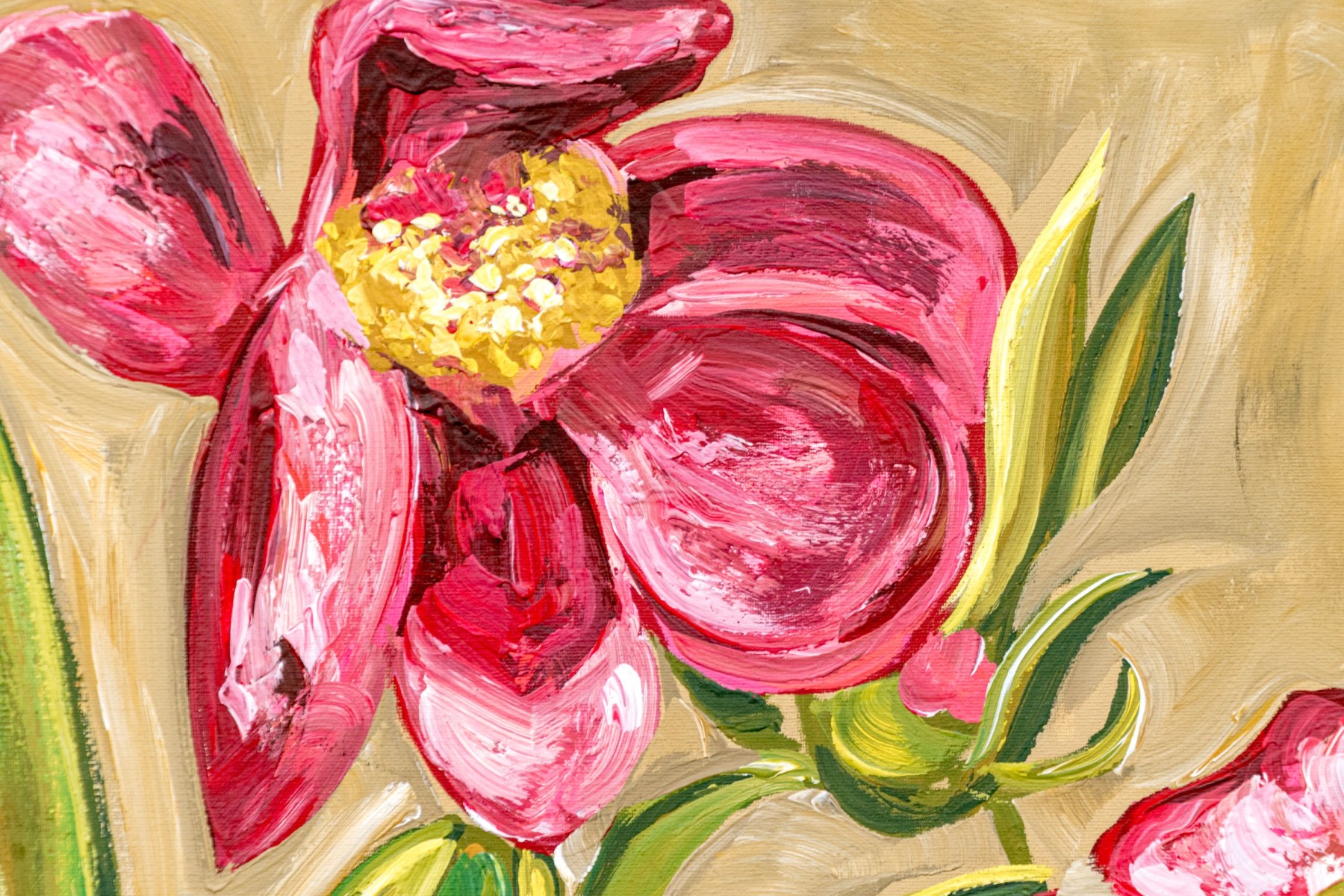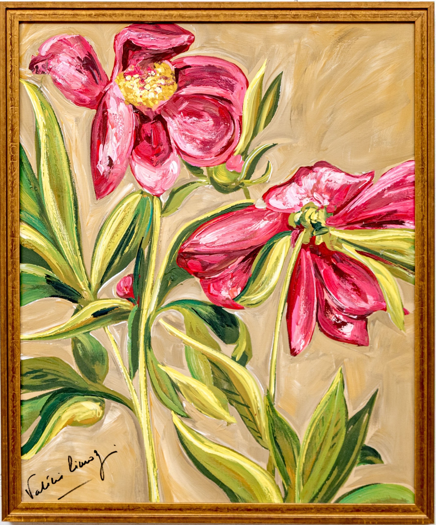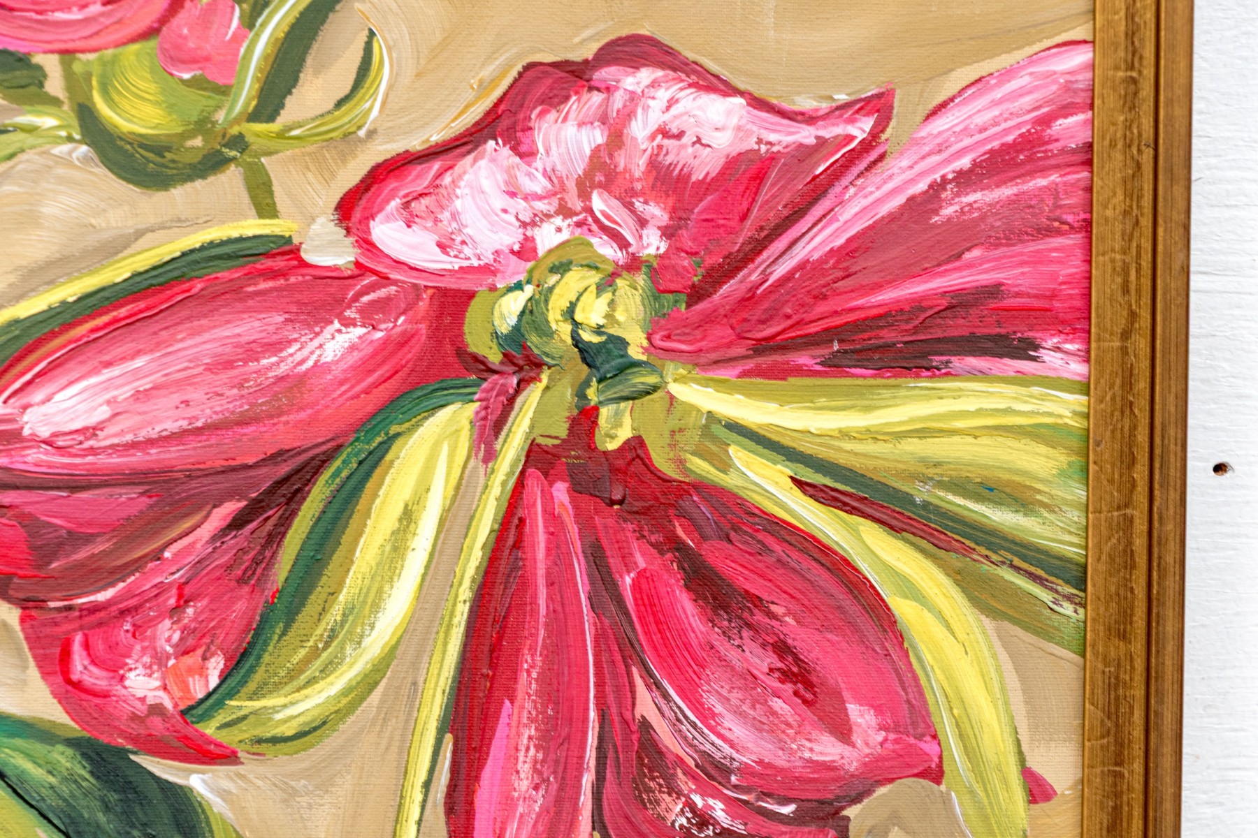 Signed lower left. Depicting two gorgeous lillies with pink-red hues with yellow and green stems and leaves against a neutral beige-brown back ground.
