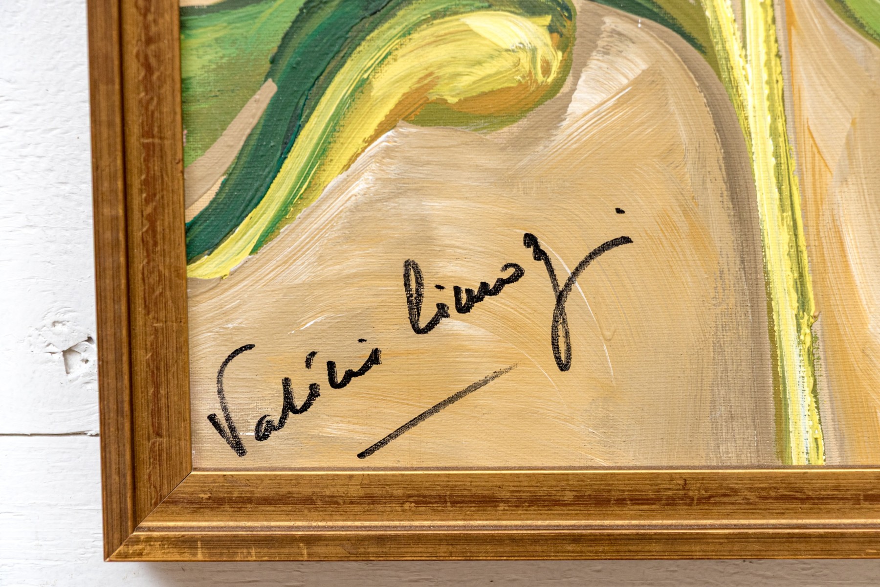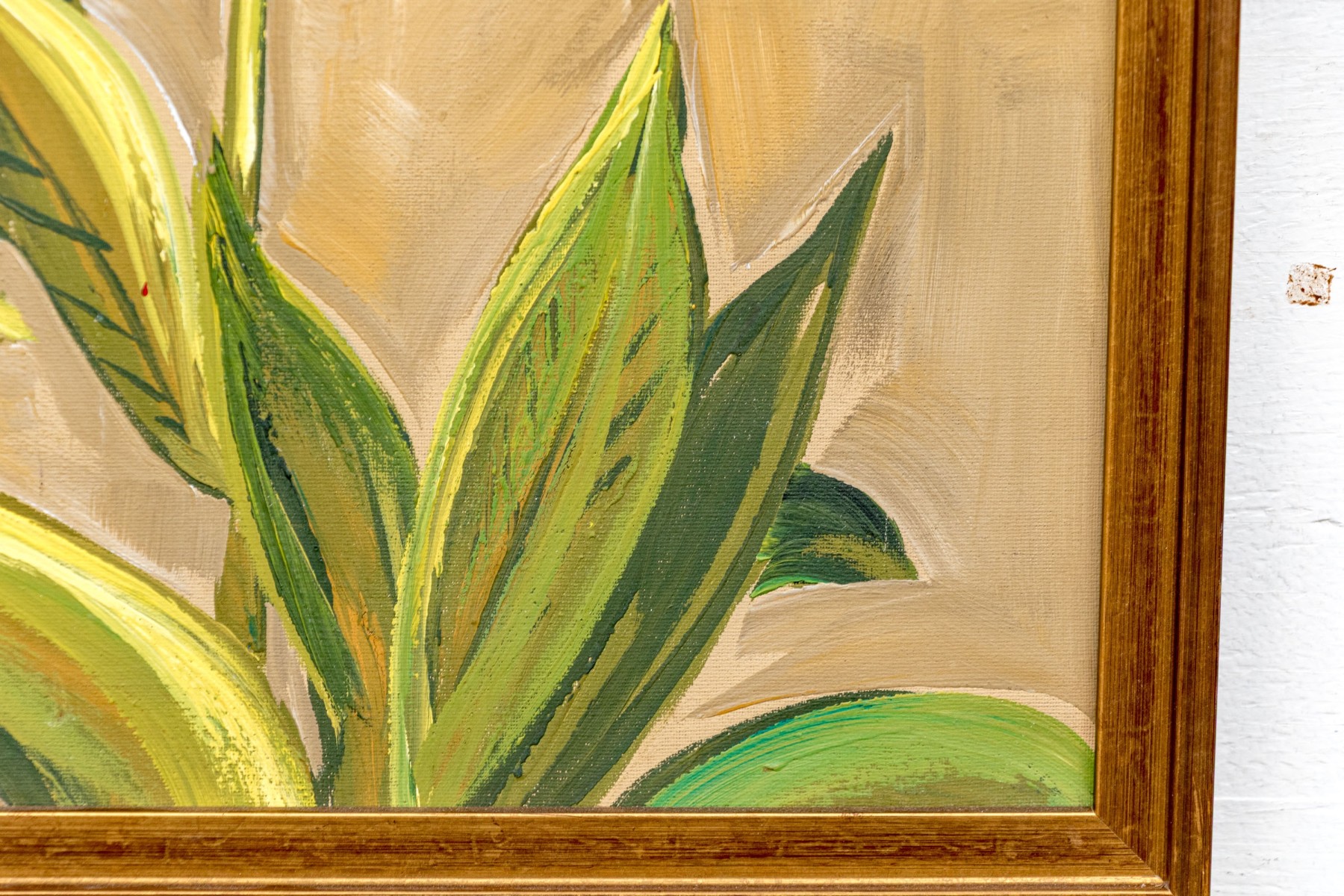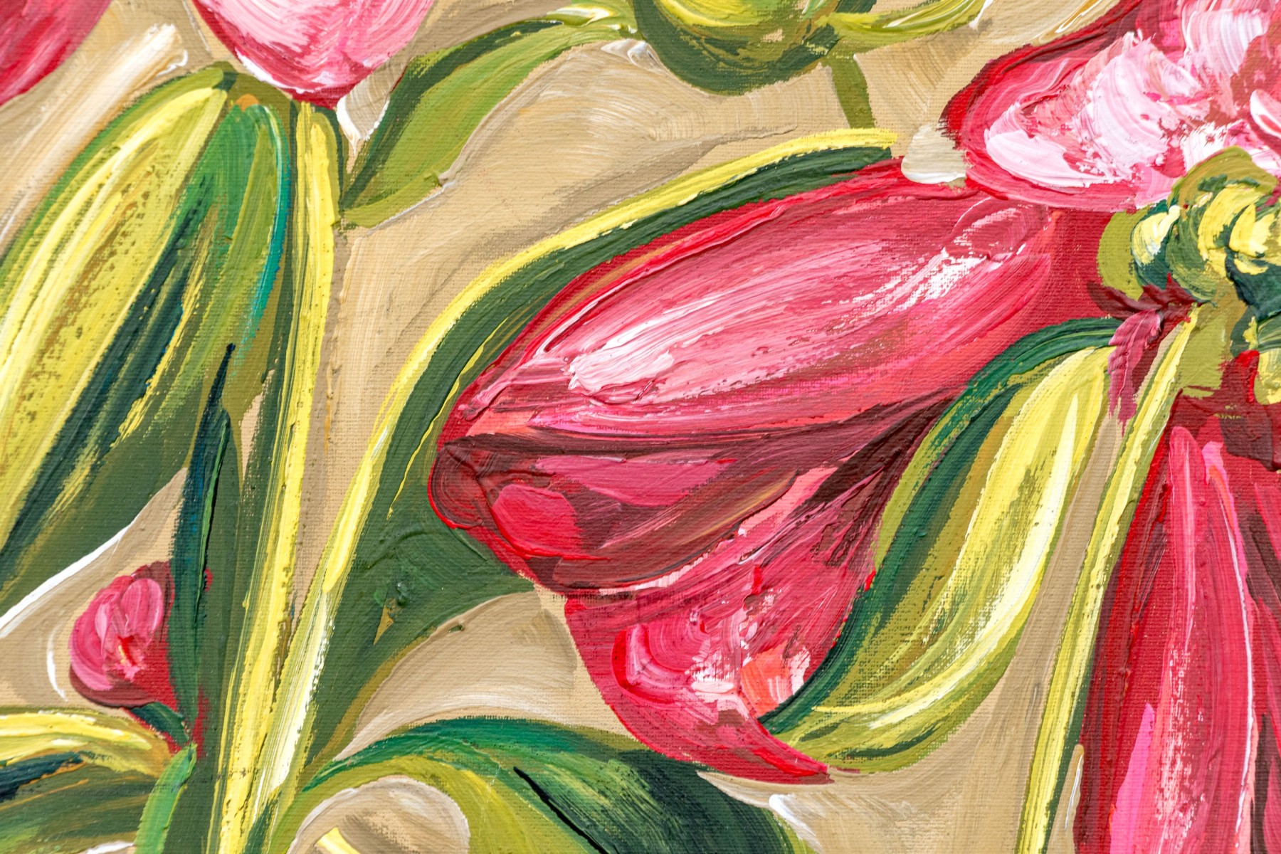 Signed lower left. Depicting two gorgeous lillies with pink-red hues with yellow and green stems and leaves against a neutral beige-brown back ground.