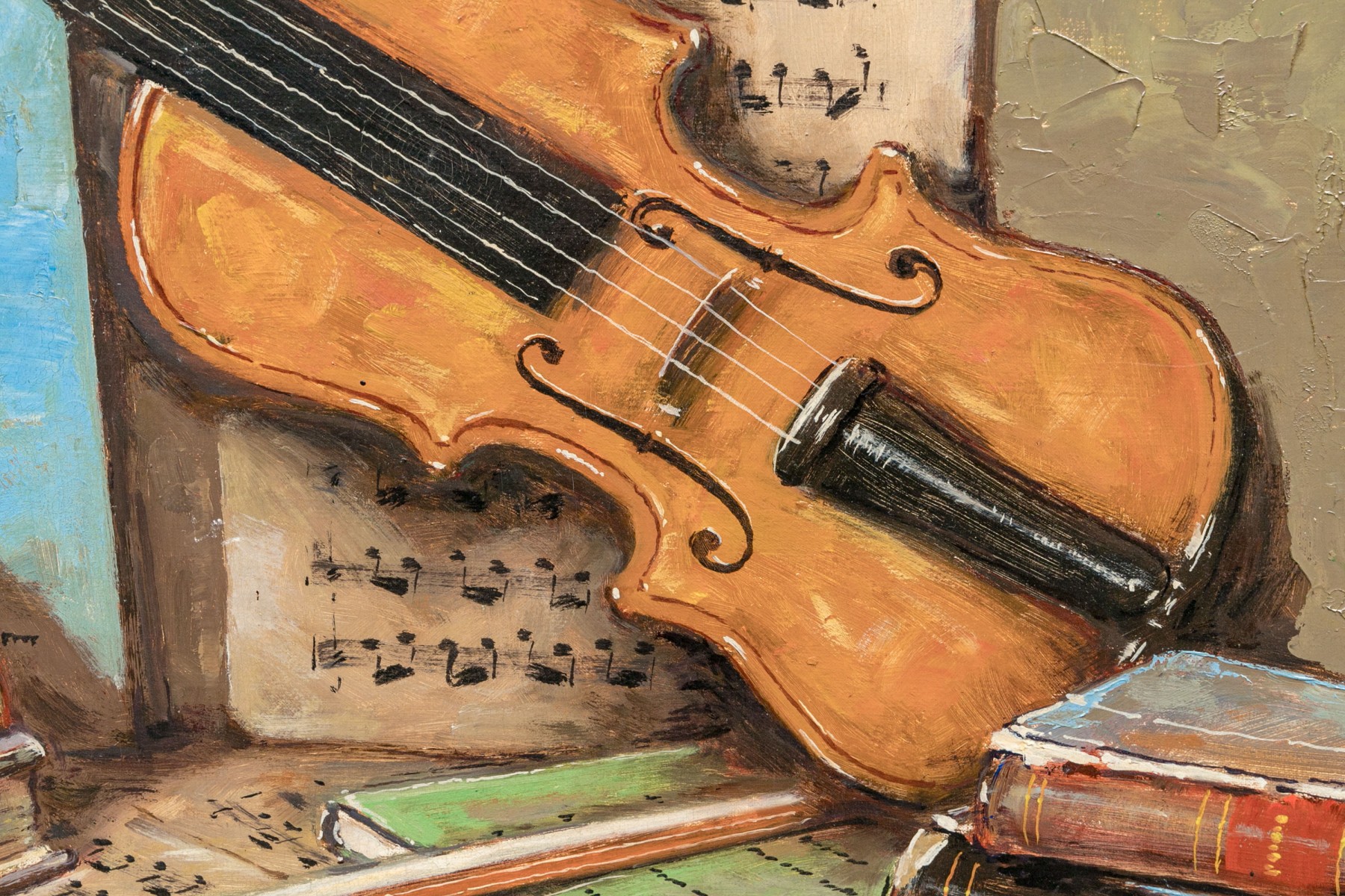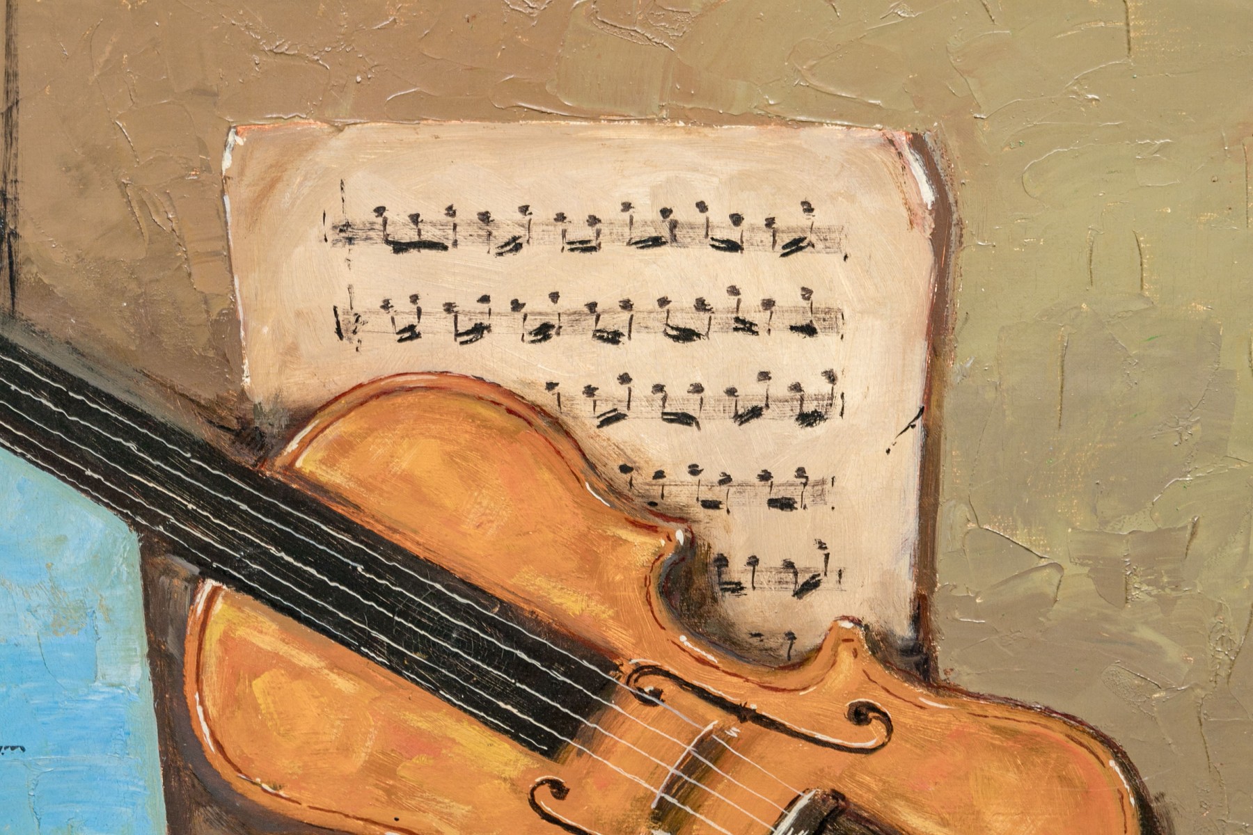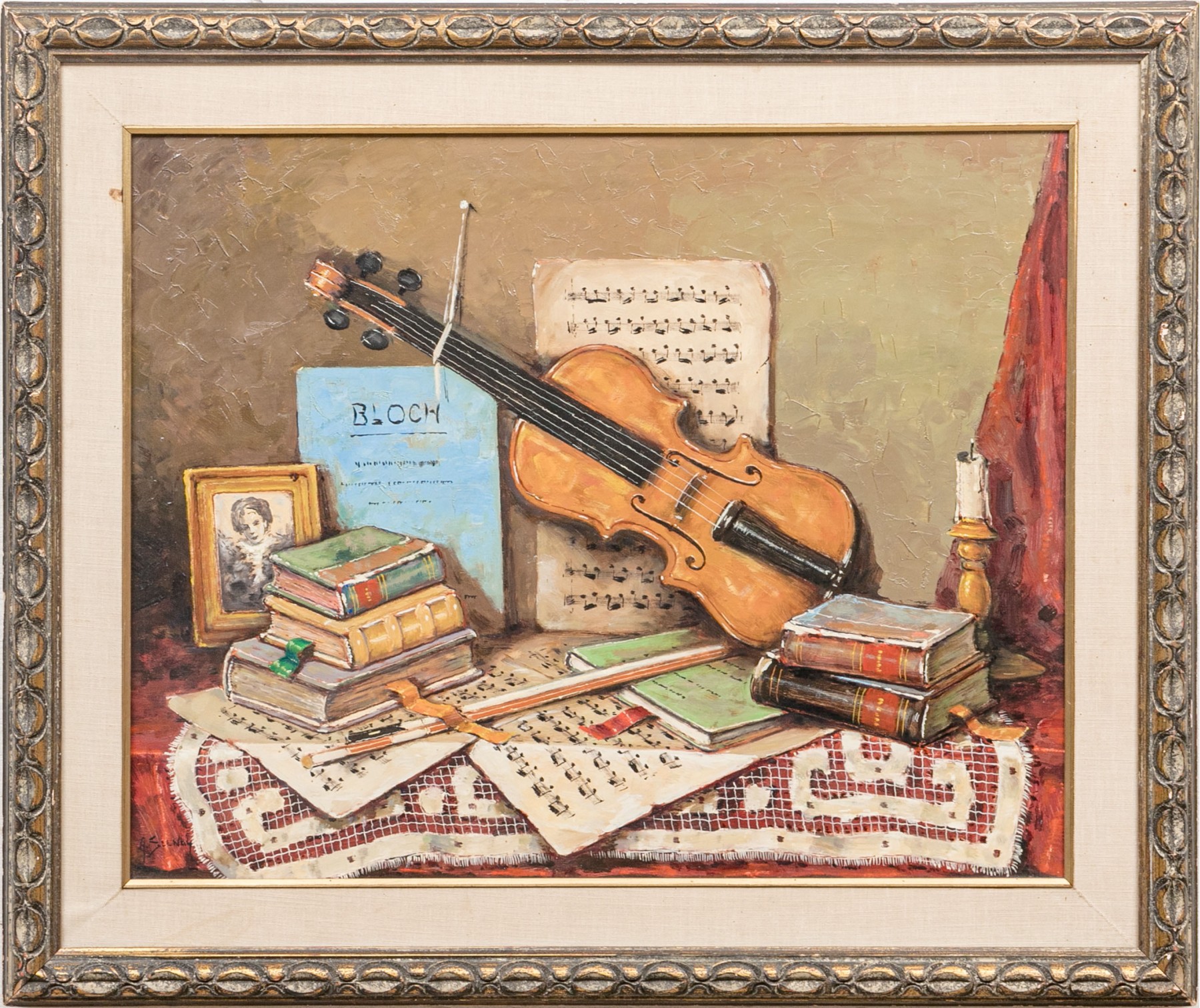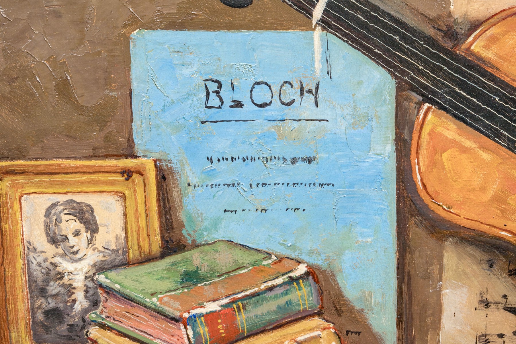 The name Bloch on the blue paper. A still life featuring a violin, sheet music and a blue covered book on a table with books, a portrait and a candlestick. All on a lace table cloth. Presented in a