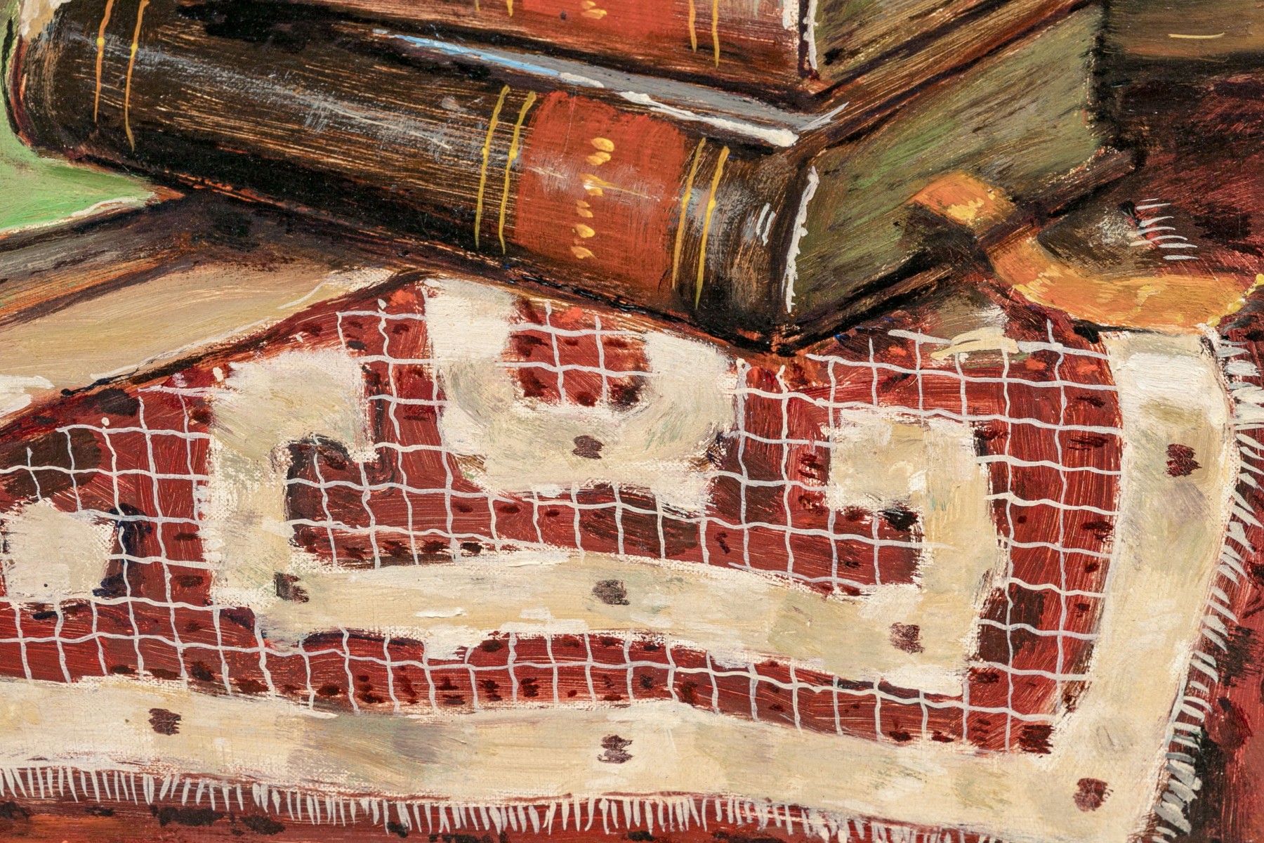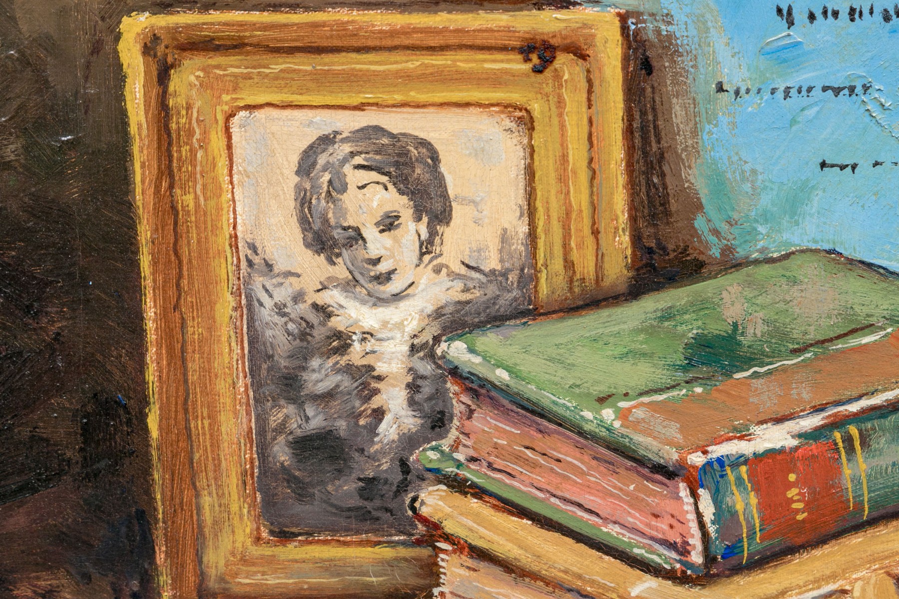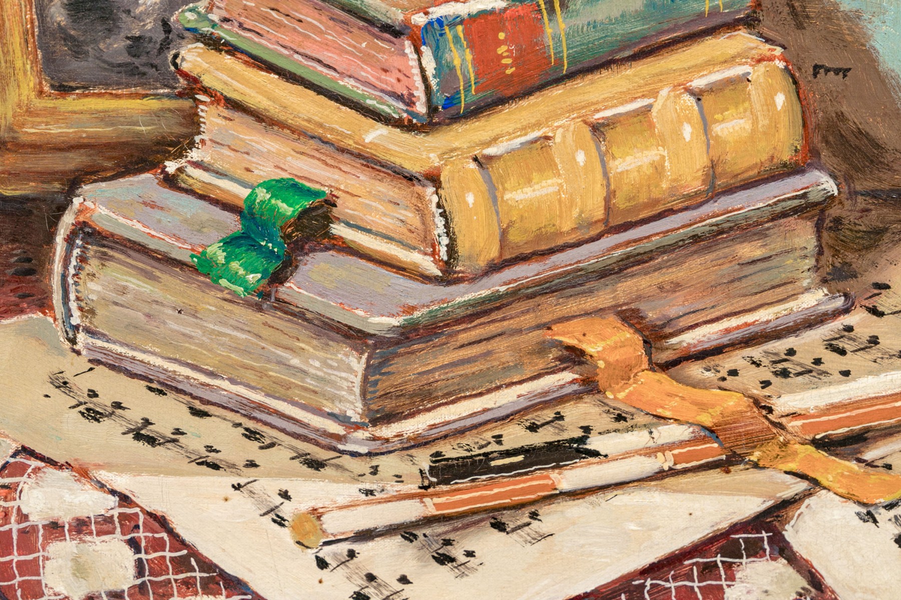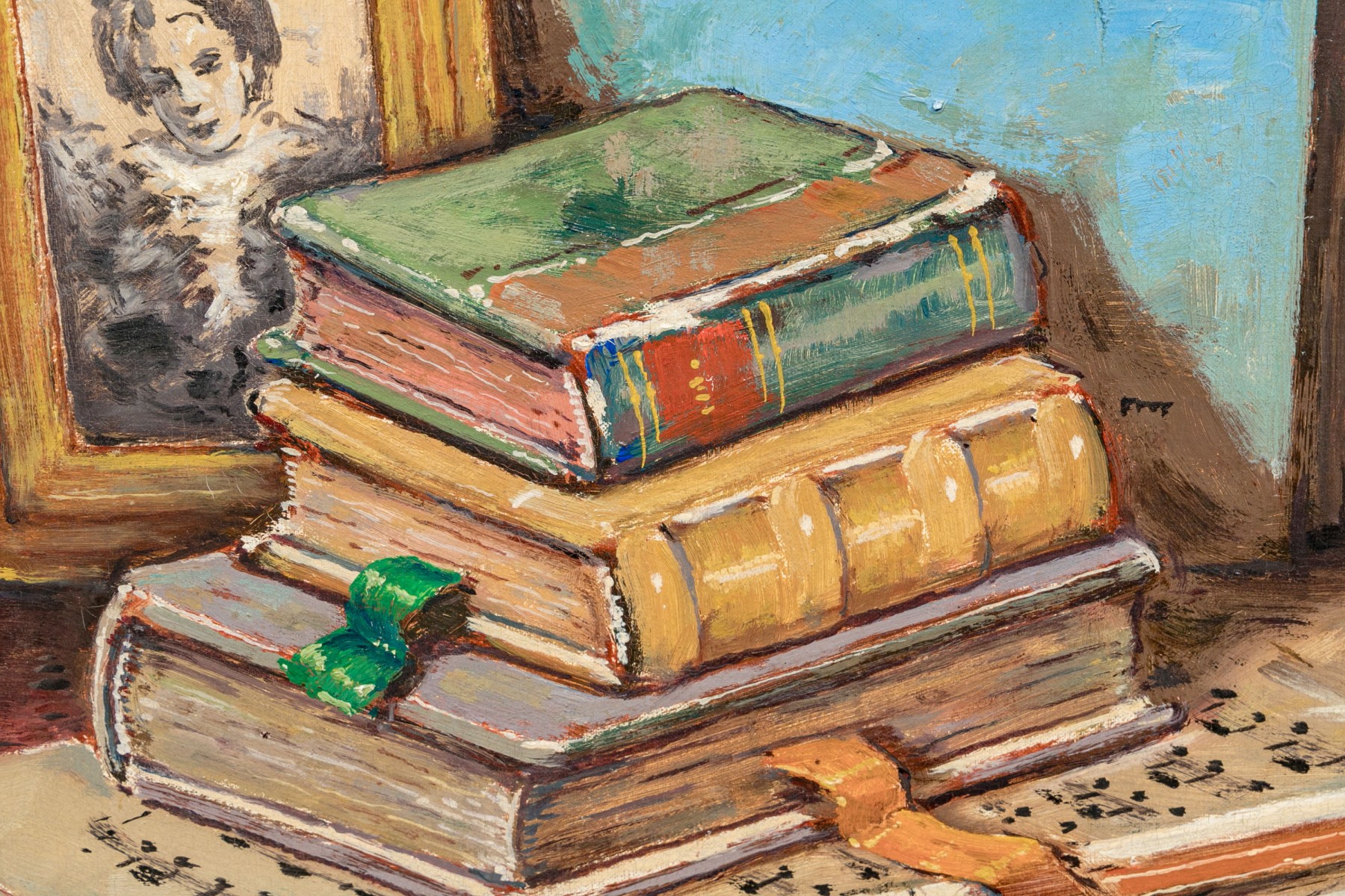 The name Bloch on the blue paper. A still life featuring a violin, sheet music and a blue covered book on a table with books, a portrait and a candlestick. All on a lace table cloth. Presented in a