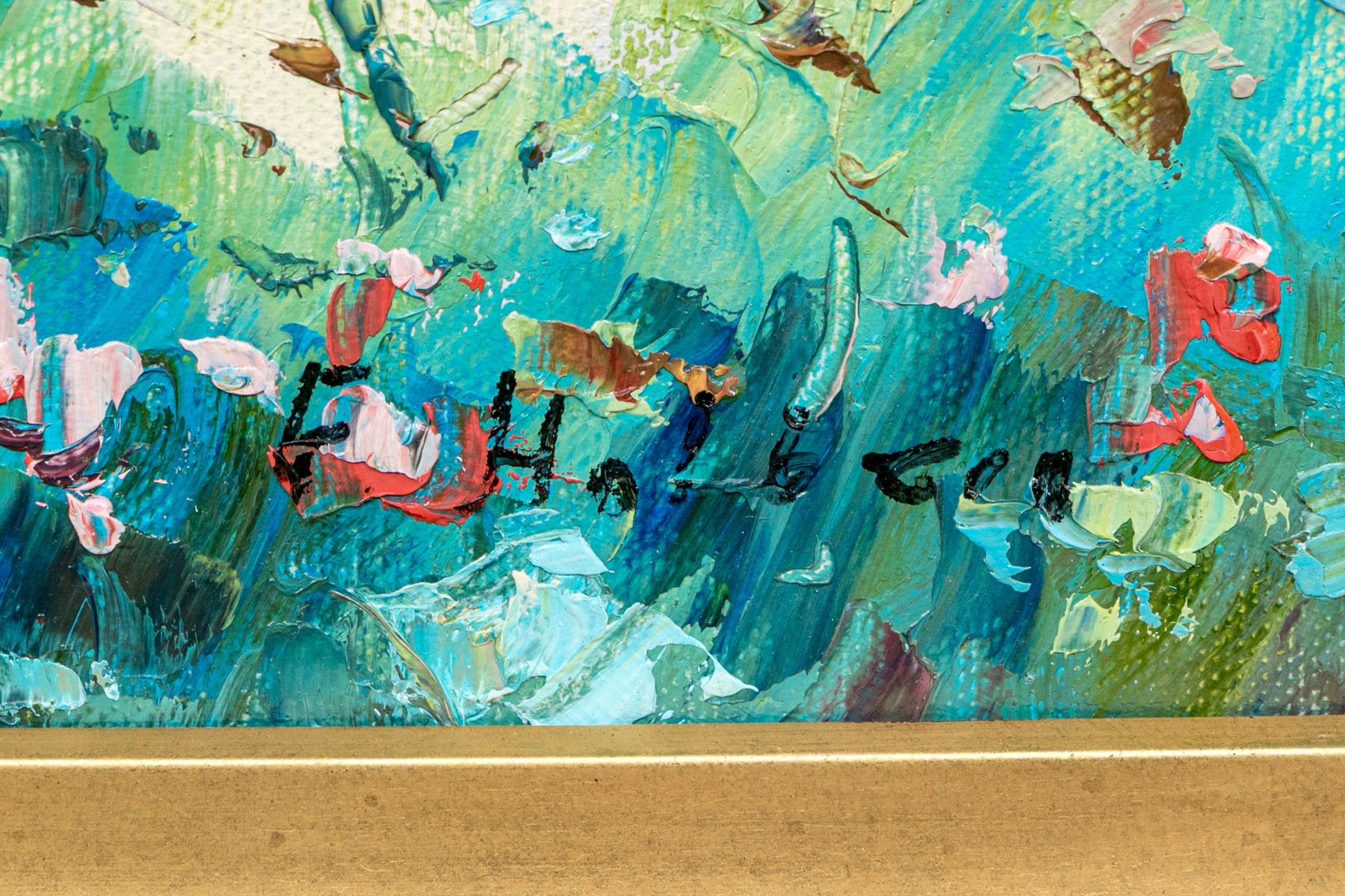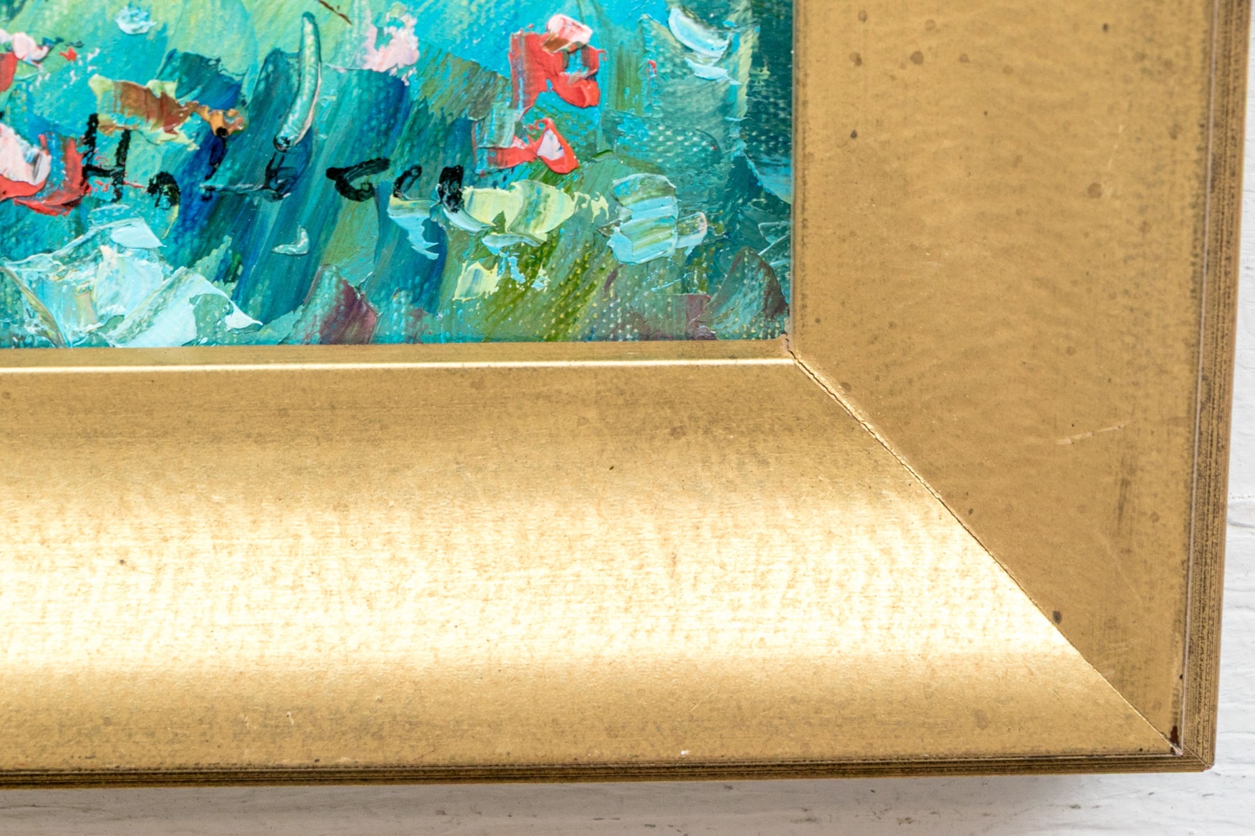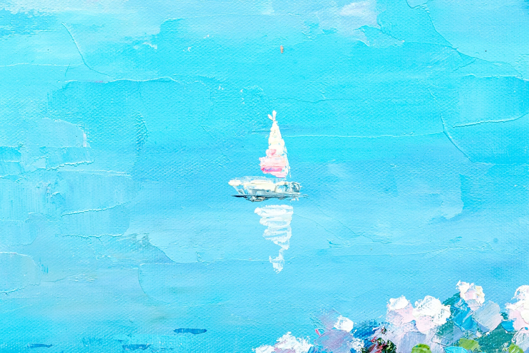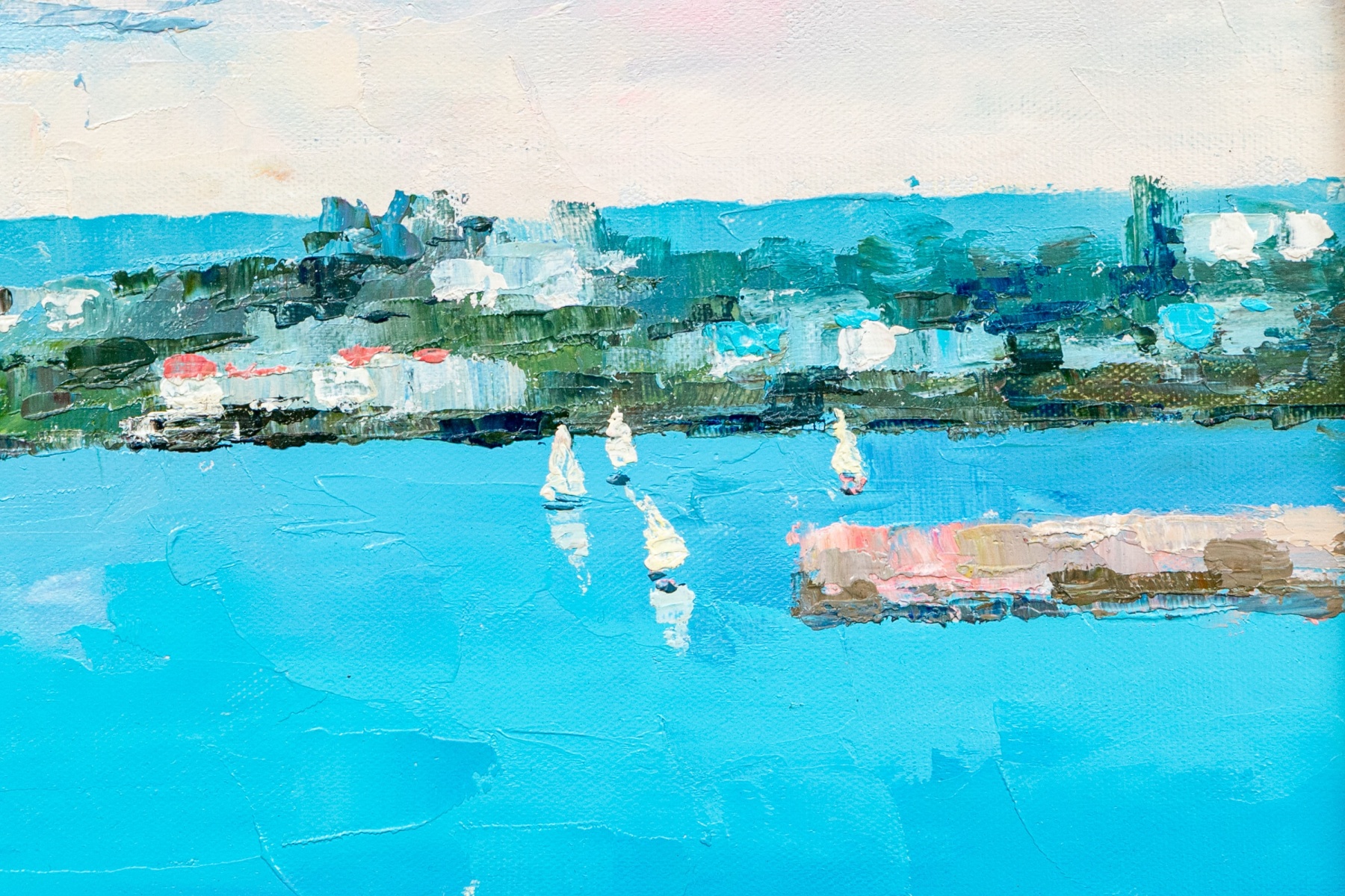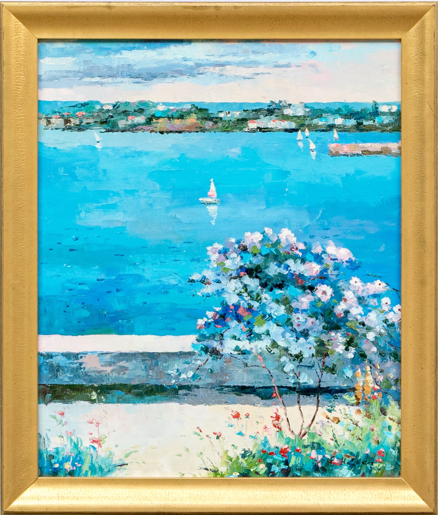 Signed indistinctly lower right. A lovely view of a few sailboats on the bright blue sea in summer with flowering trees on shore and a village across the water. Presented in a gilt frame.
