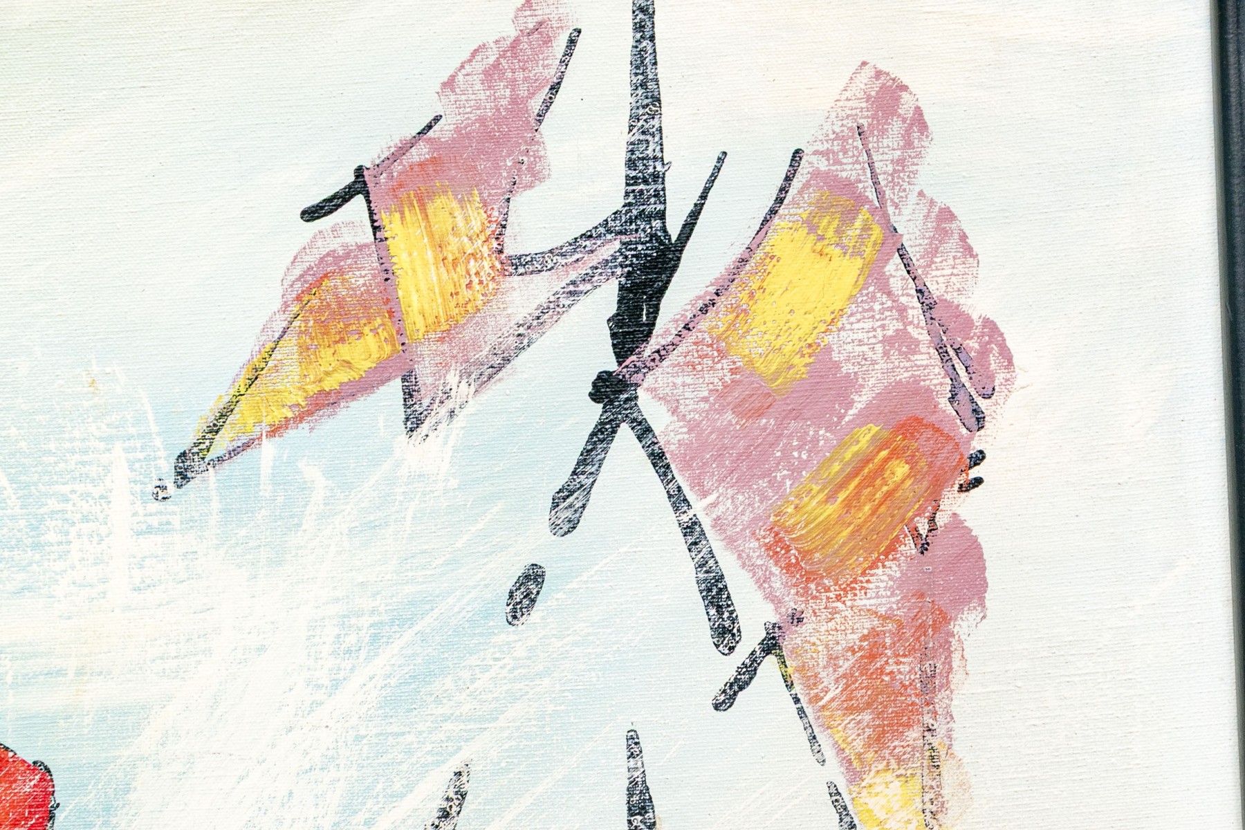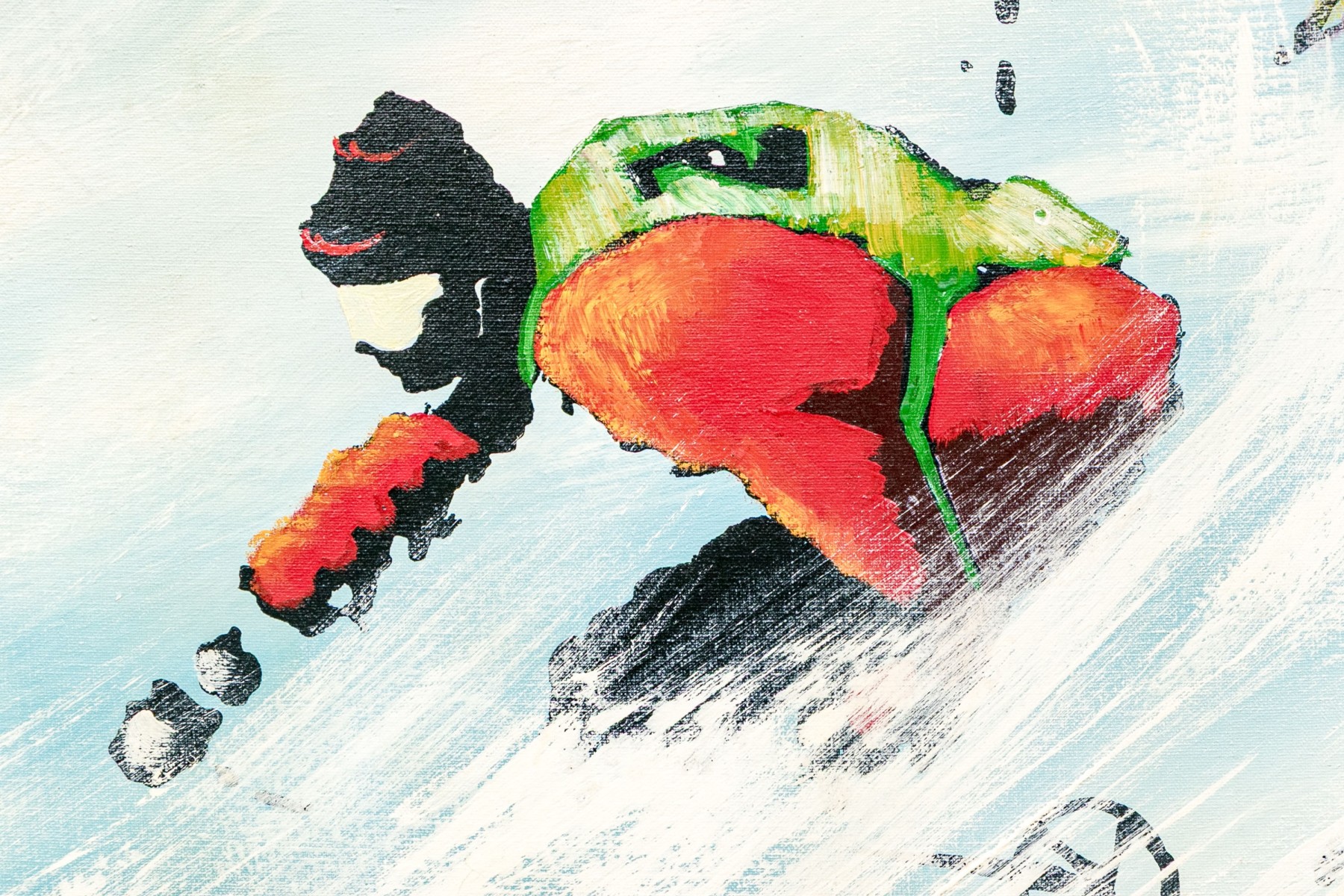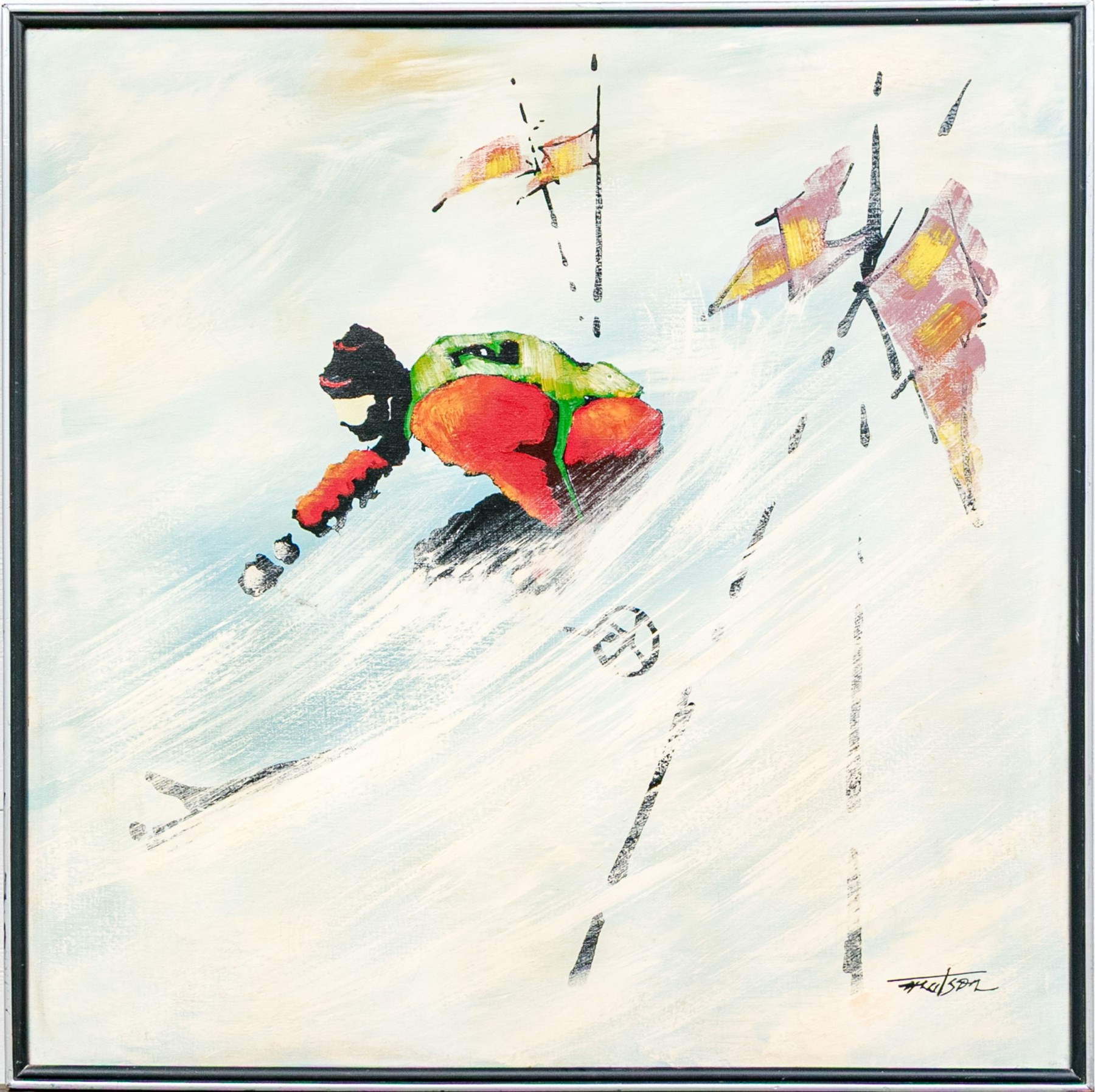 Signed indistinctly lower right. The skier in bright orange is racing down the snowy slope on a slalom course with flags on the poles. Presented within a silver tone and black painted frame.
