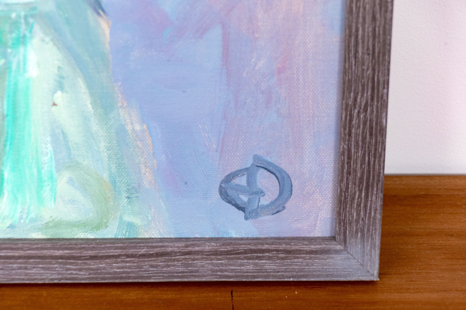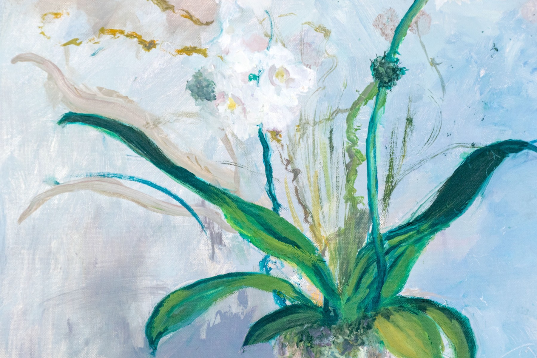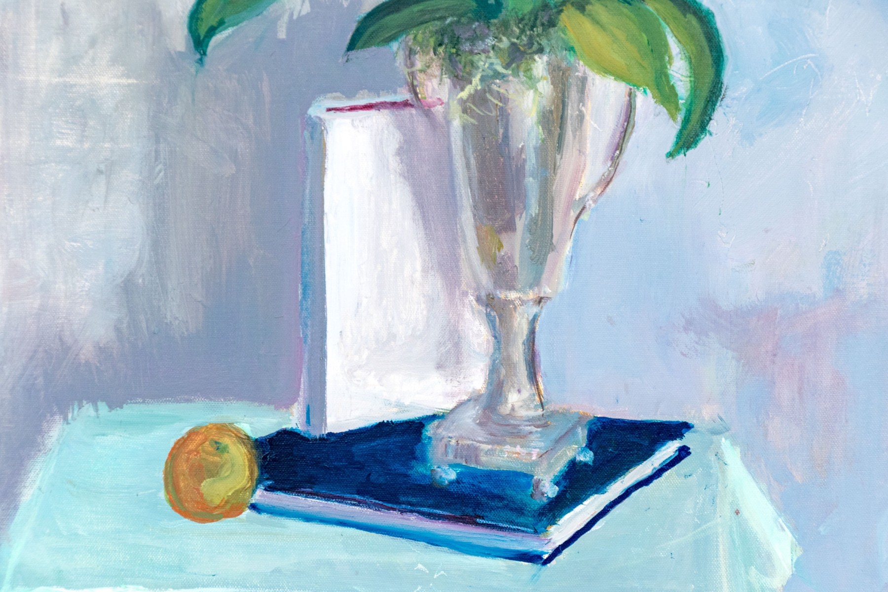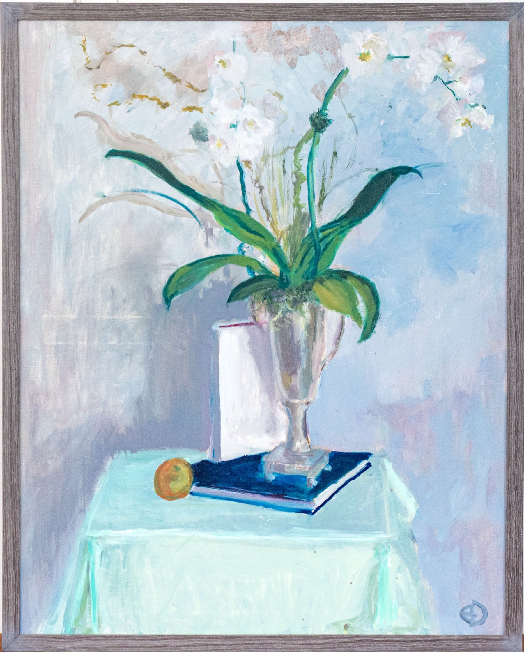 A wonderful oil painting on canvas depicting a still life with a white flowering orchid plant emerging from a silvered pedestal vase set atop a dark blue book with a single orange over a square table with a pale mint green tablecloth against a textural blue, gray, and pink background. Signed lower right with initials appearing ED.