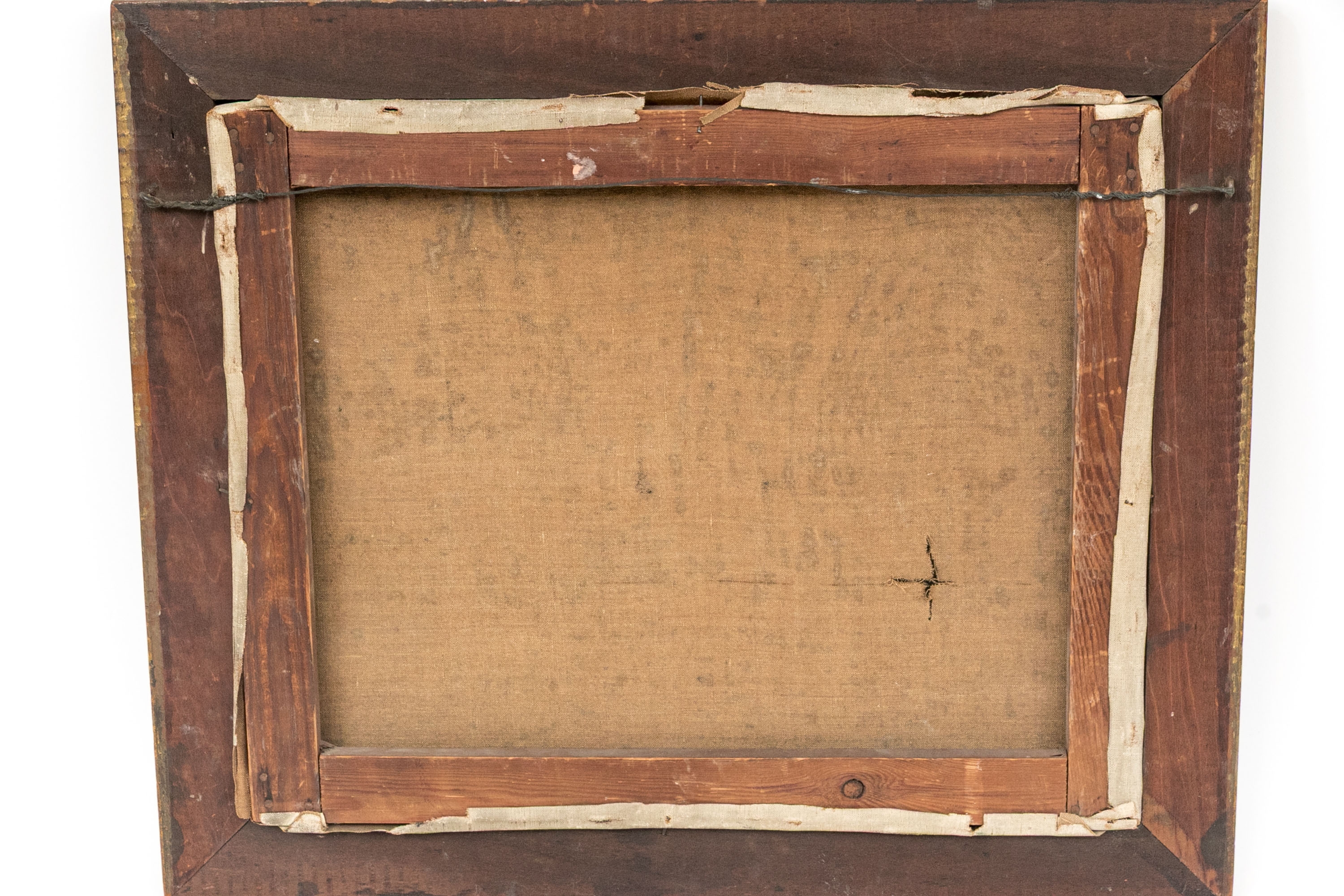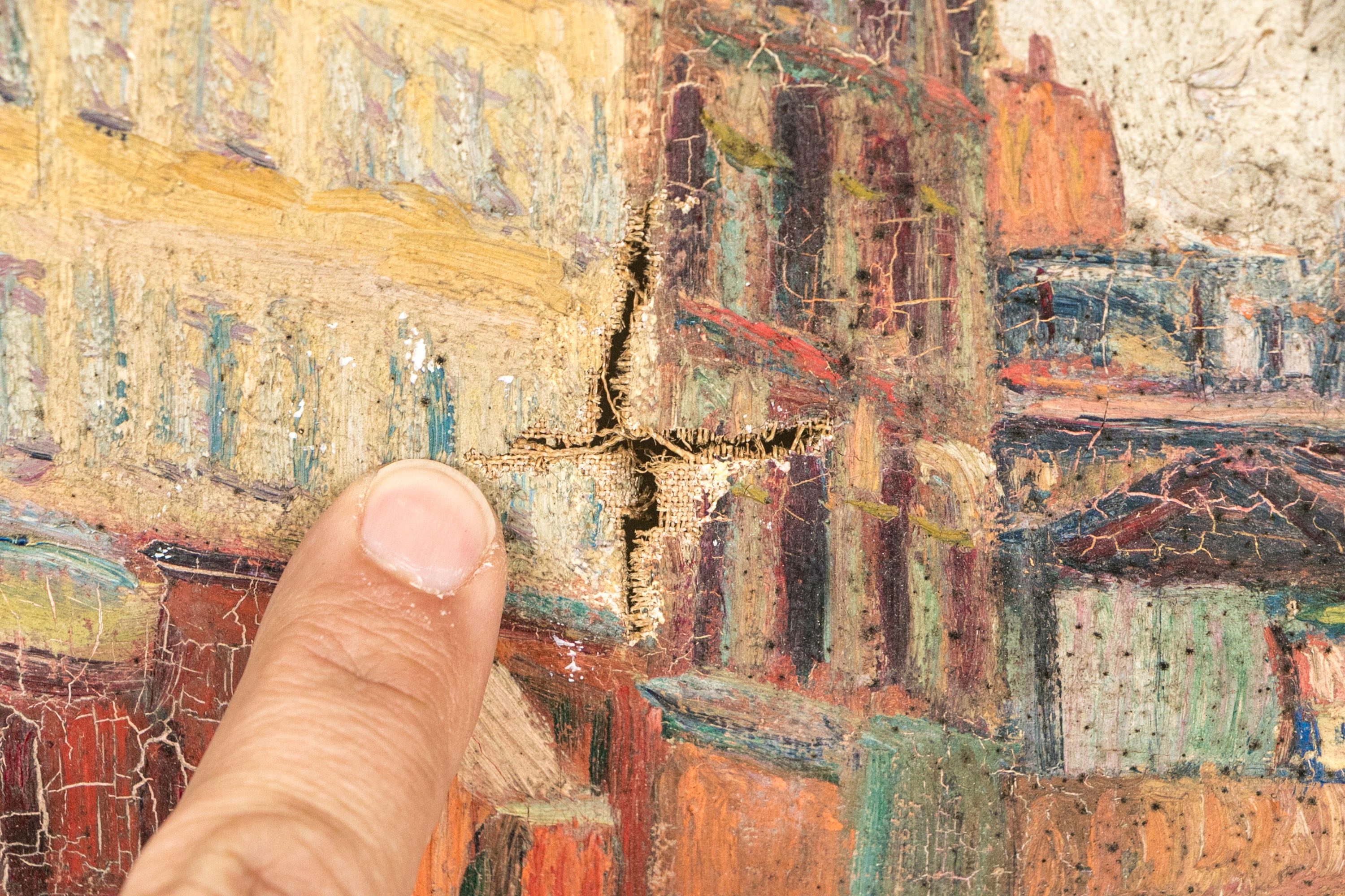 As-Is. There is a tear in the form of an X to the lower left quadrant. Spotting to the canvas, should be cleaned and restored.