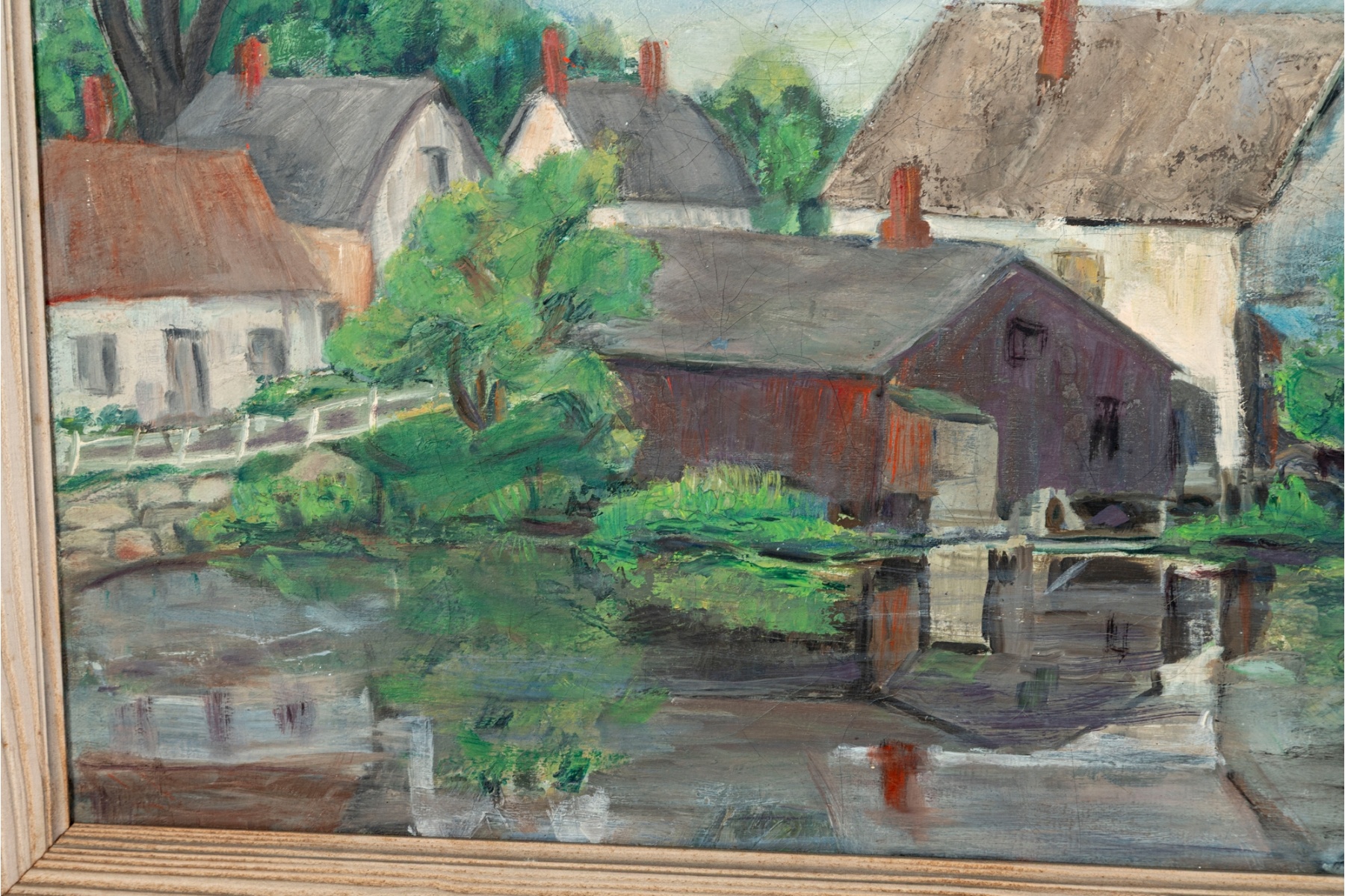 A wonderful oil painting on canvas depicting an impressionist view of a town with calm water reflecting white, gray, blue, and red buildings flanked by lush green trees opening up to a view of a clouded blue sky. Signed lower right.
