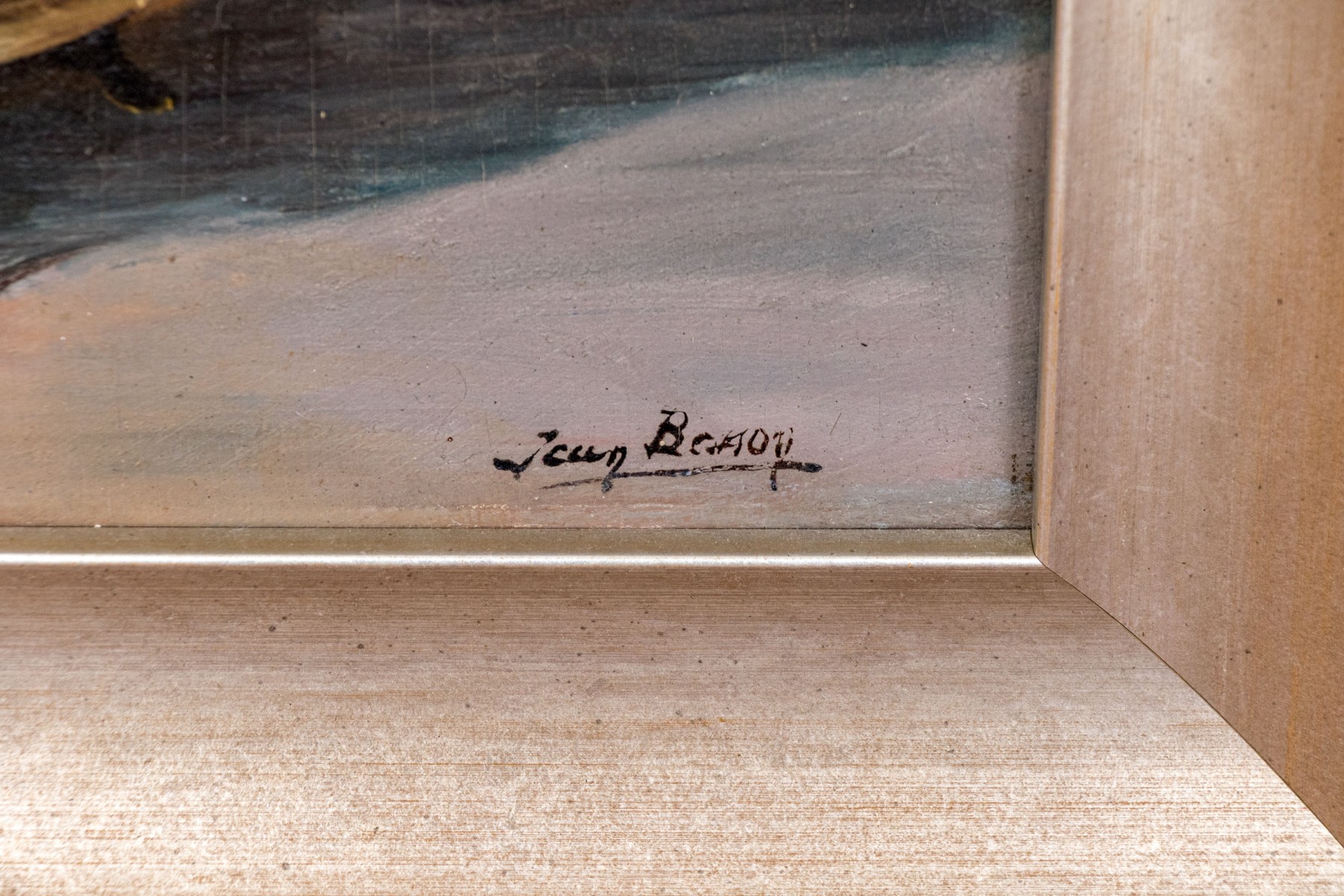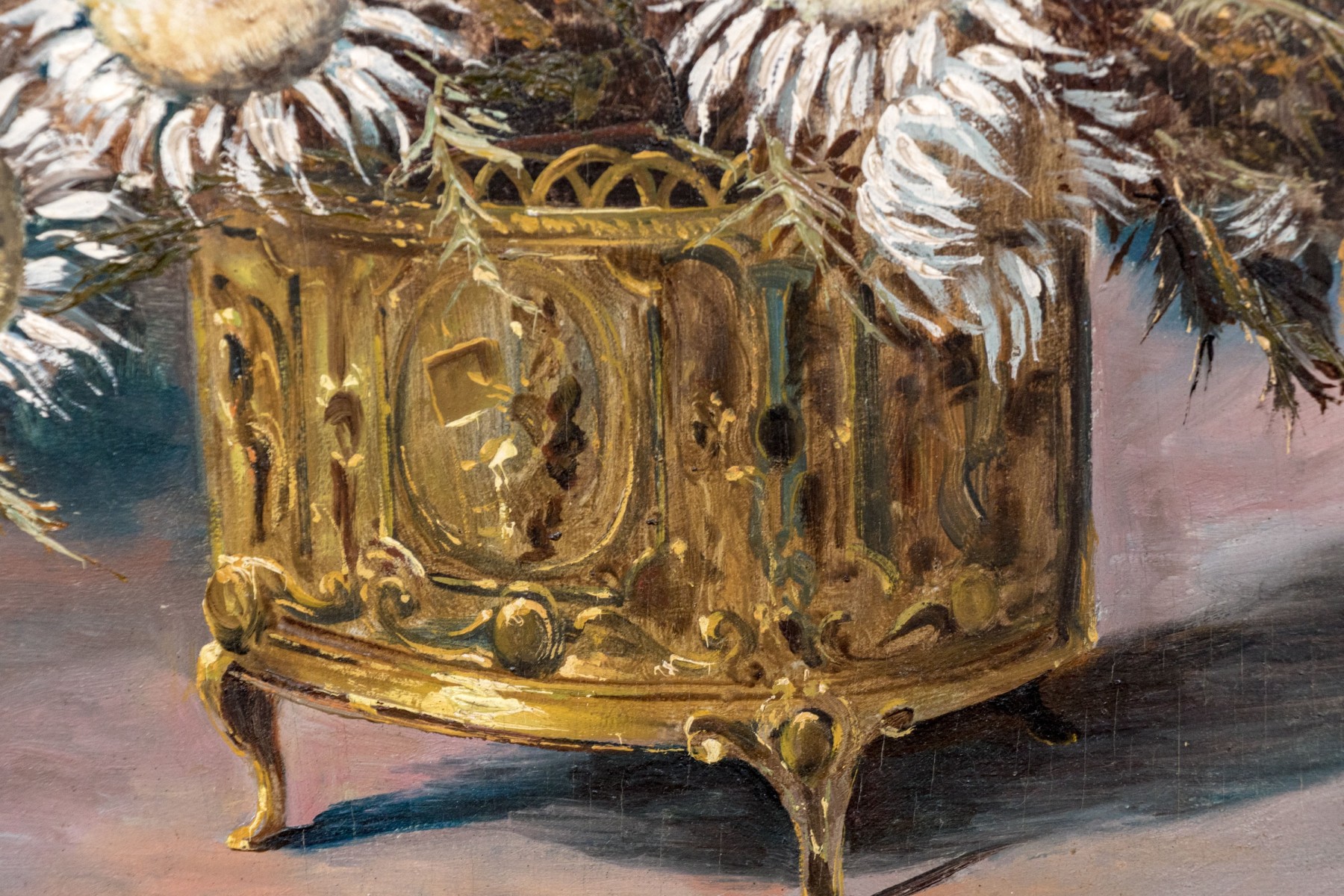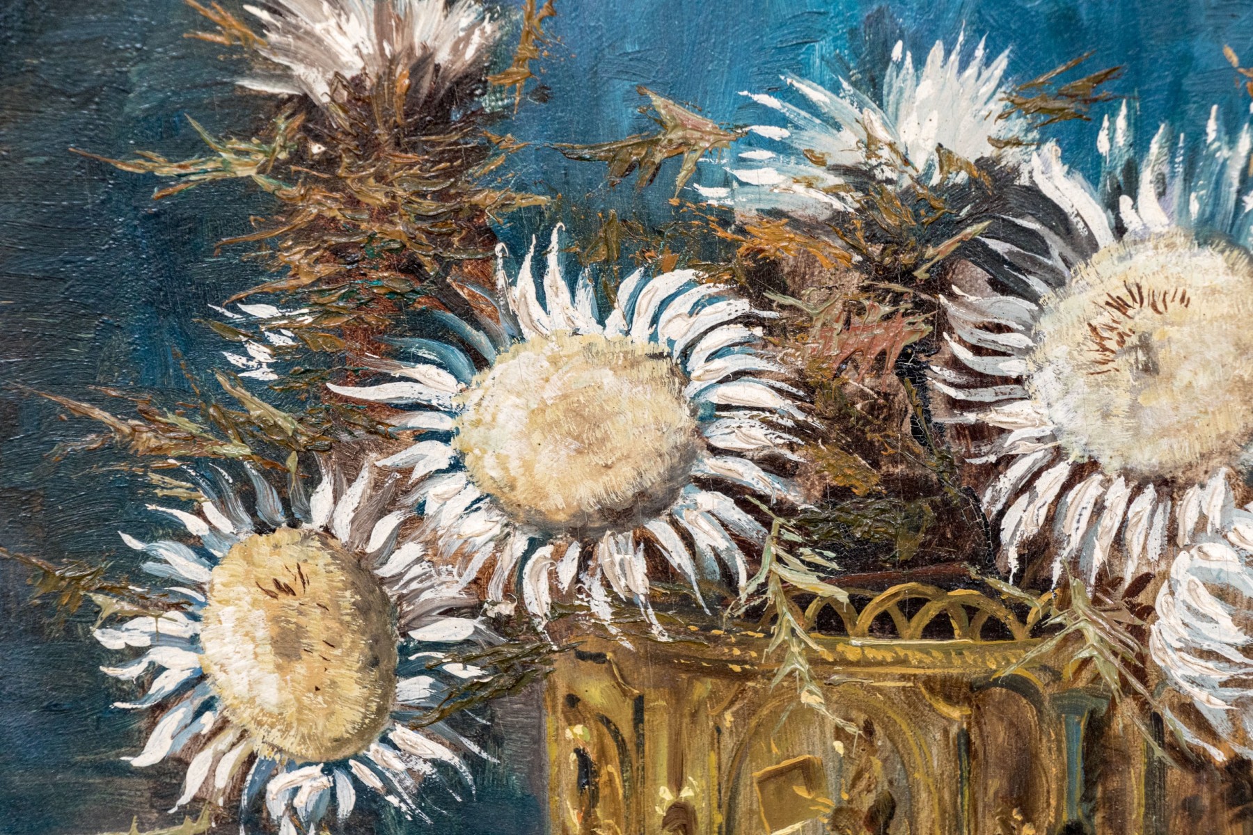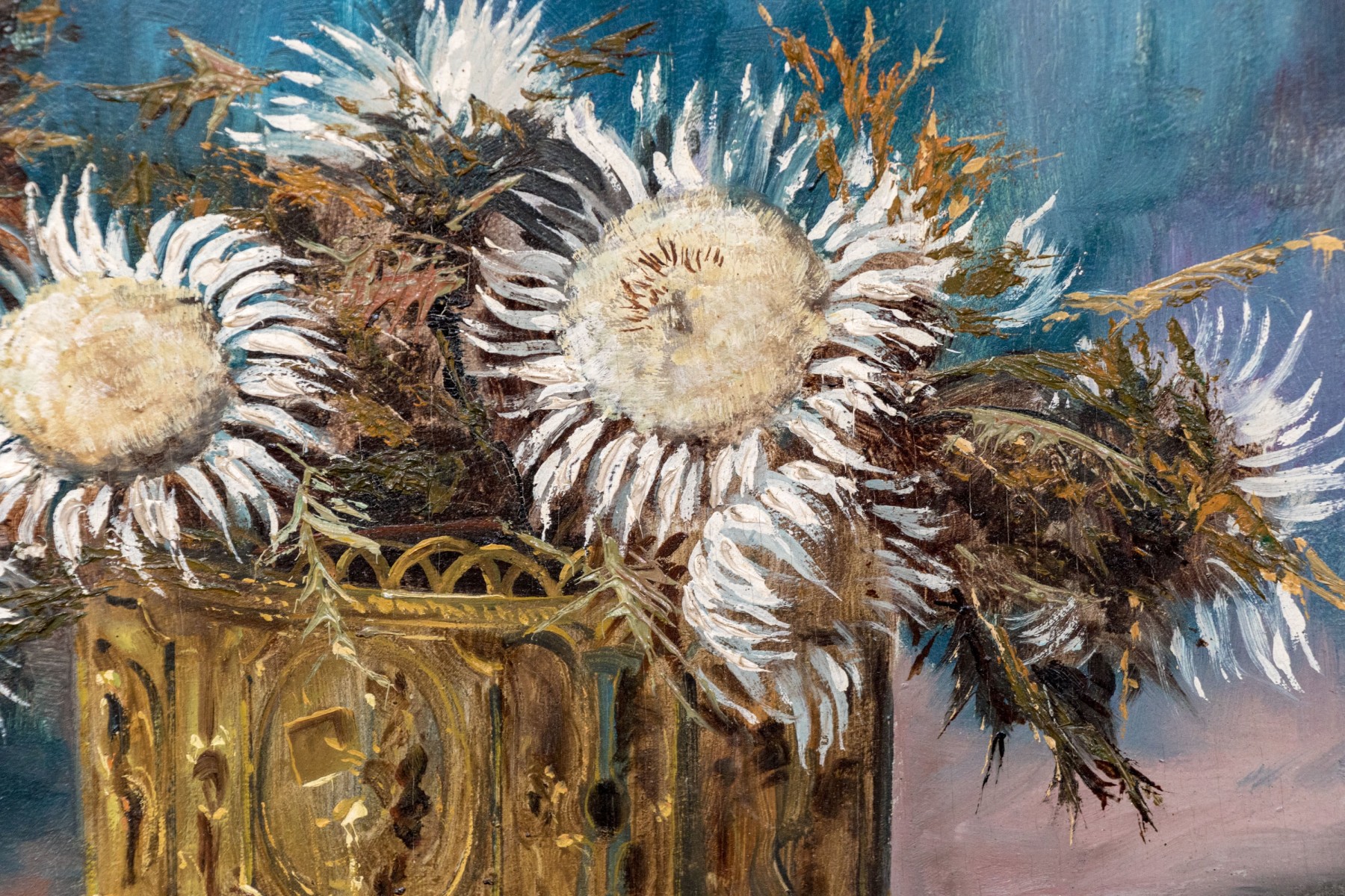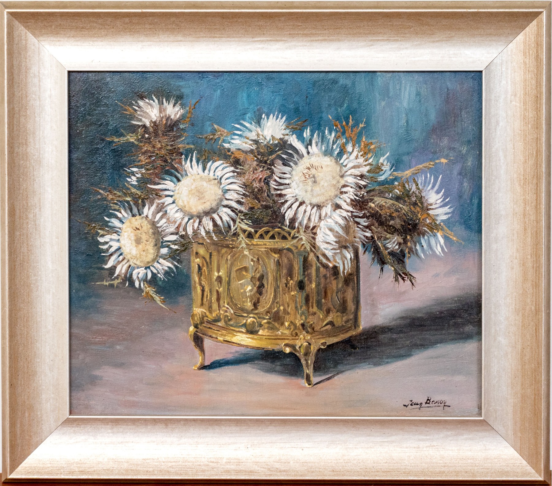 A charming oil painting on canvas depicting an arrangement of dried white sunflowers in a highly decorative brass planter with an openwork trim at the top, relief medallions and scrolls around the cylindrical body, and cabriole legs set atop a warm-toned gray ground against a cerulean blue background. Signed lower right potentially appearing 'Jean Boaou' or 'Jean Boaoy.'