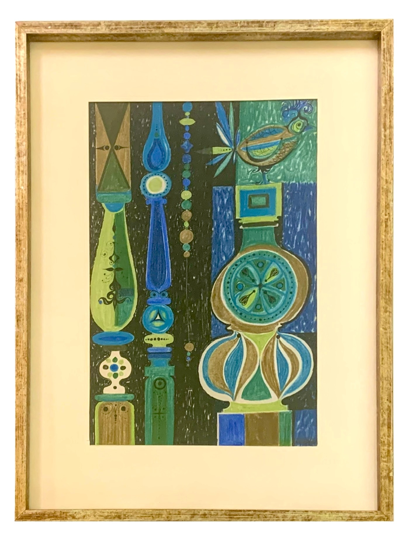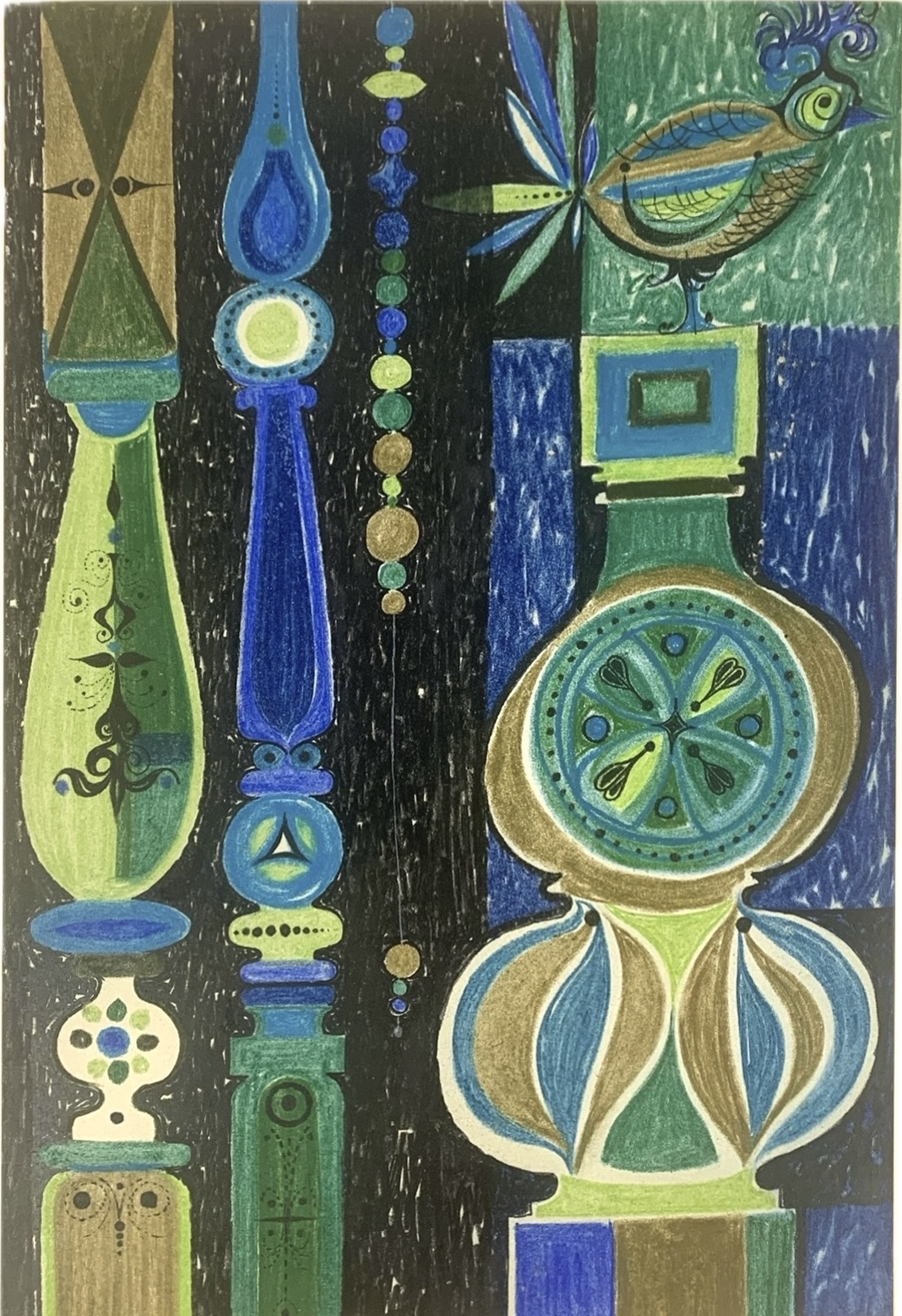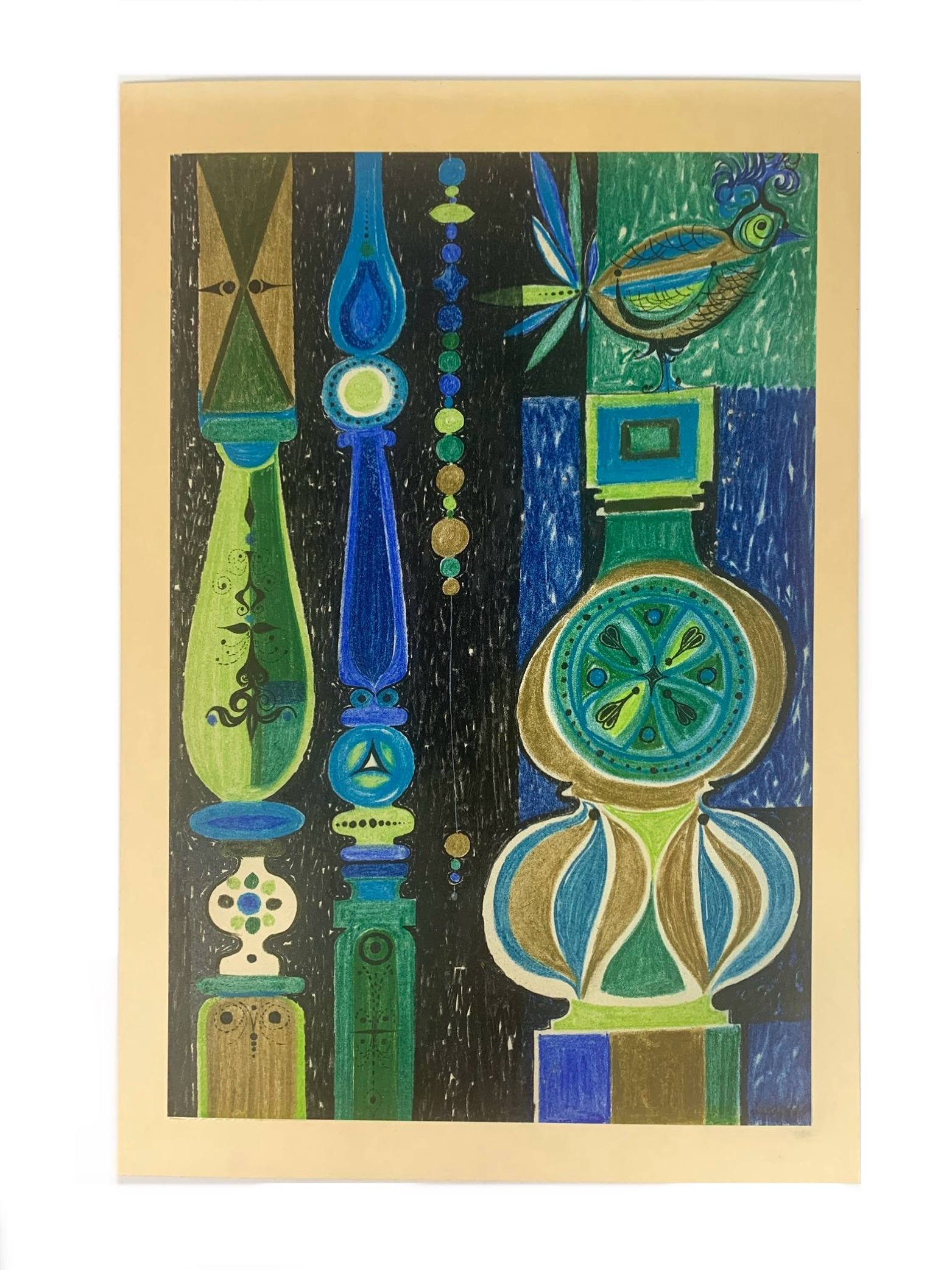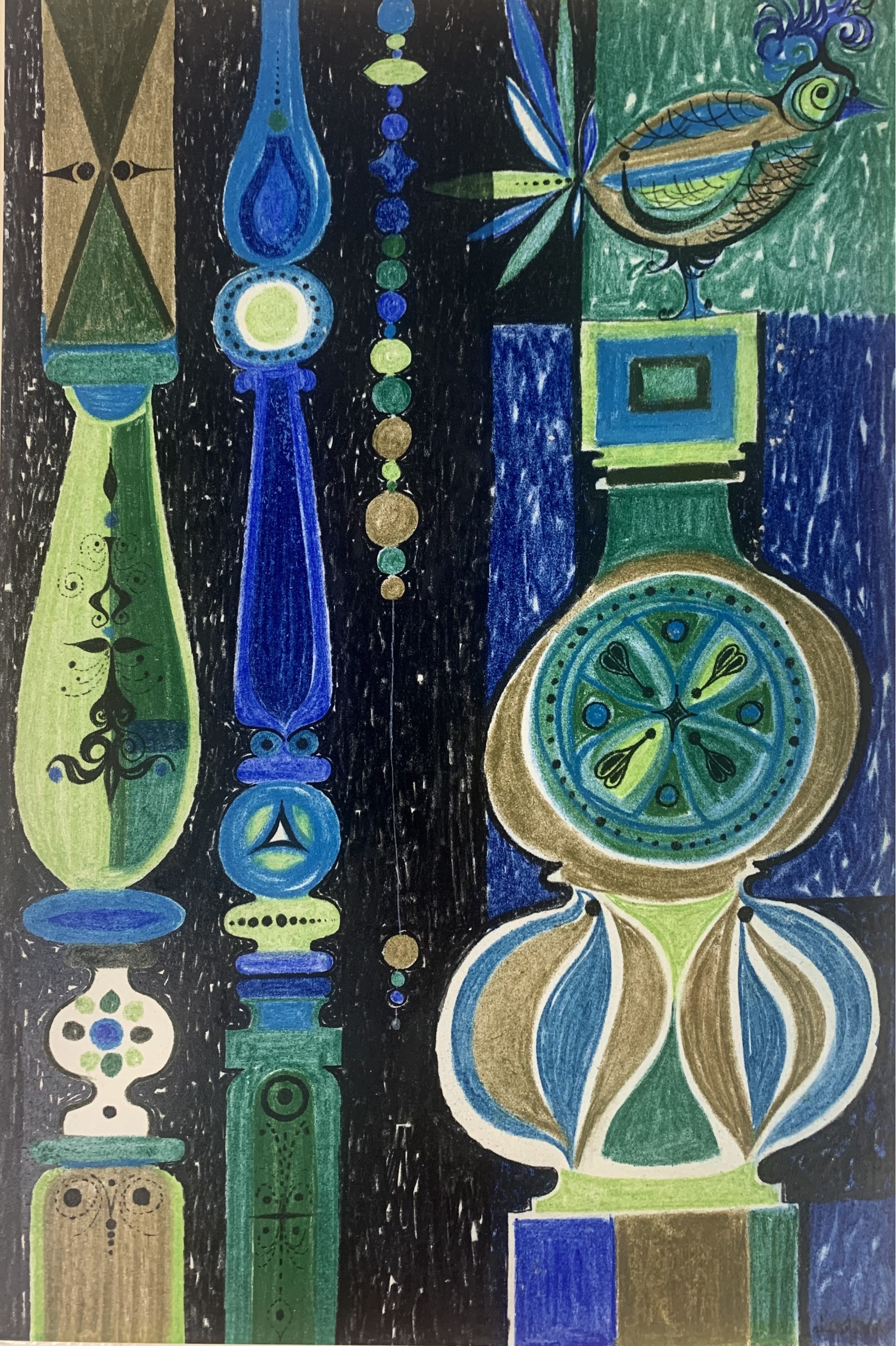 Mid century artwork, possibly a crayon, featuring stylized shapes and a bird motif in blue, green and black tones.