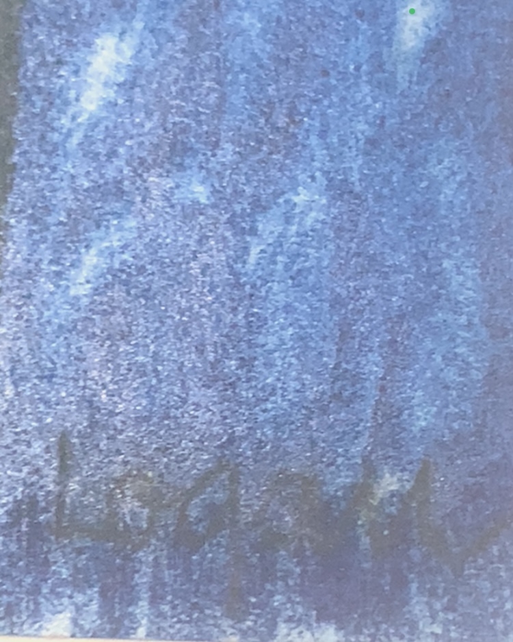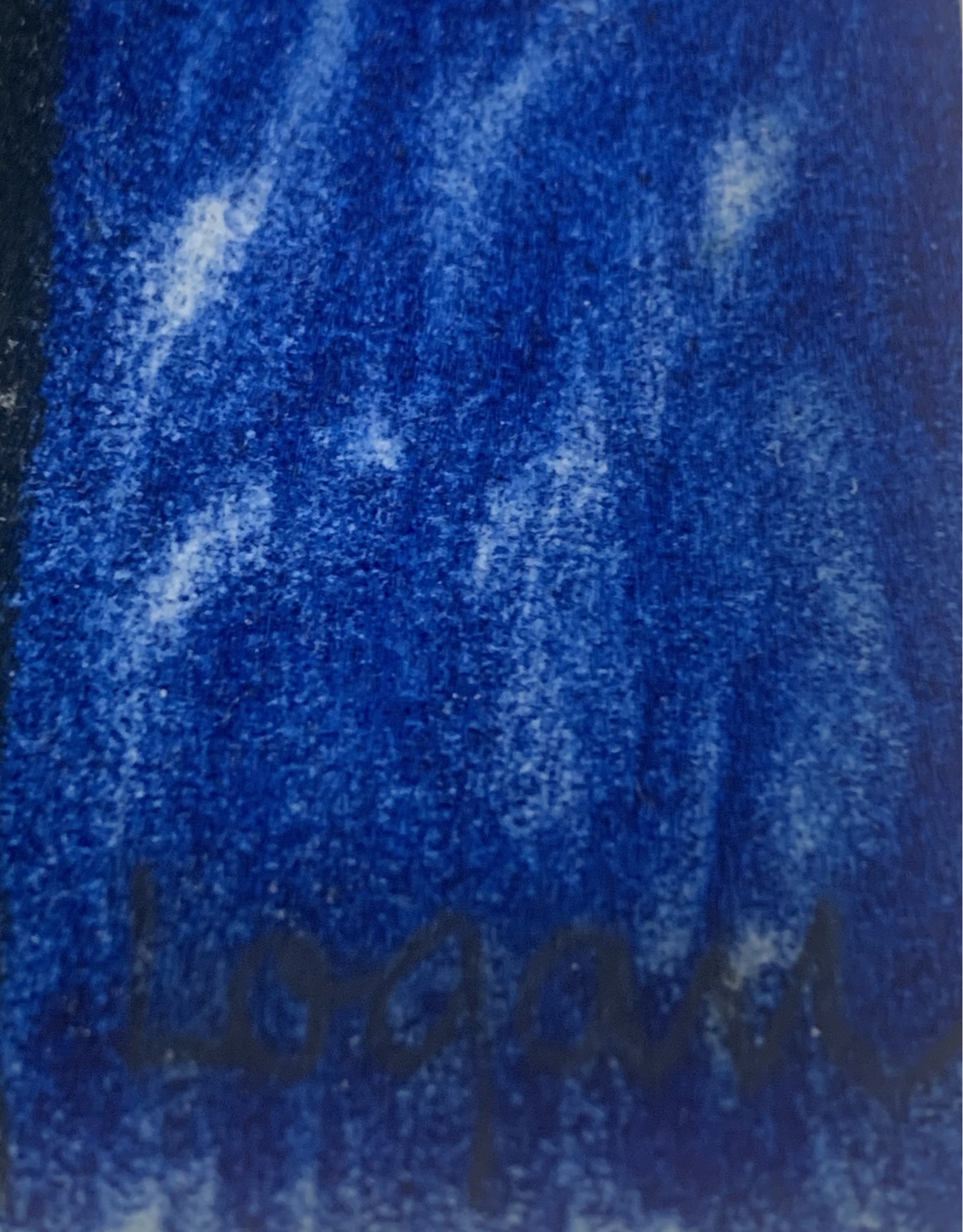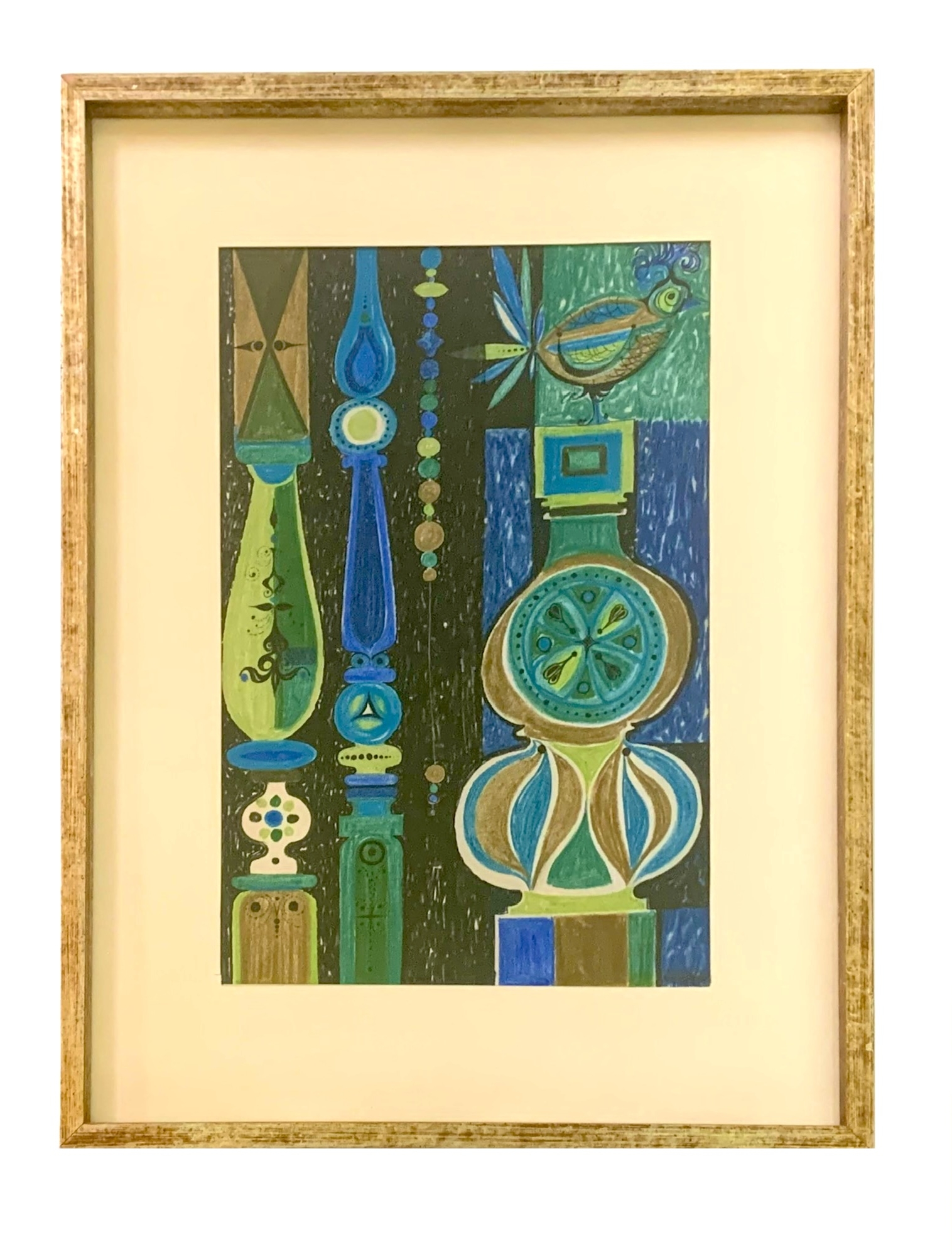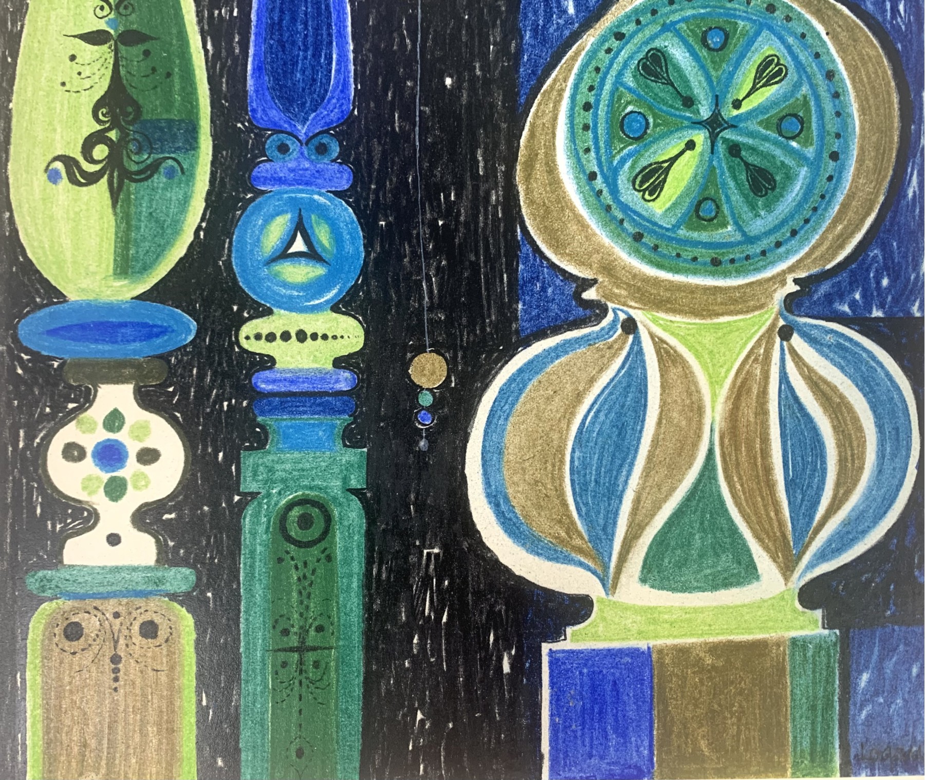 Mid century artwork, possibly a crayon, featuring stylized shapes and a bird motif in blue, green and black tones.