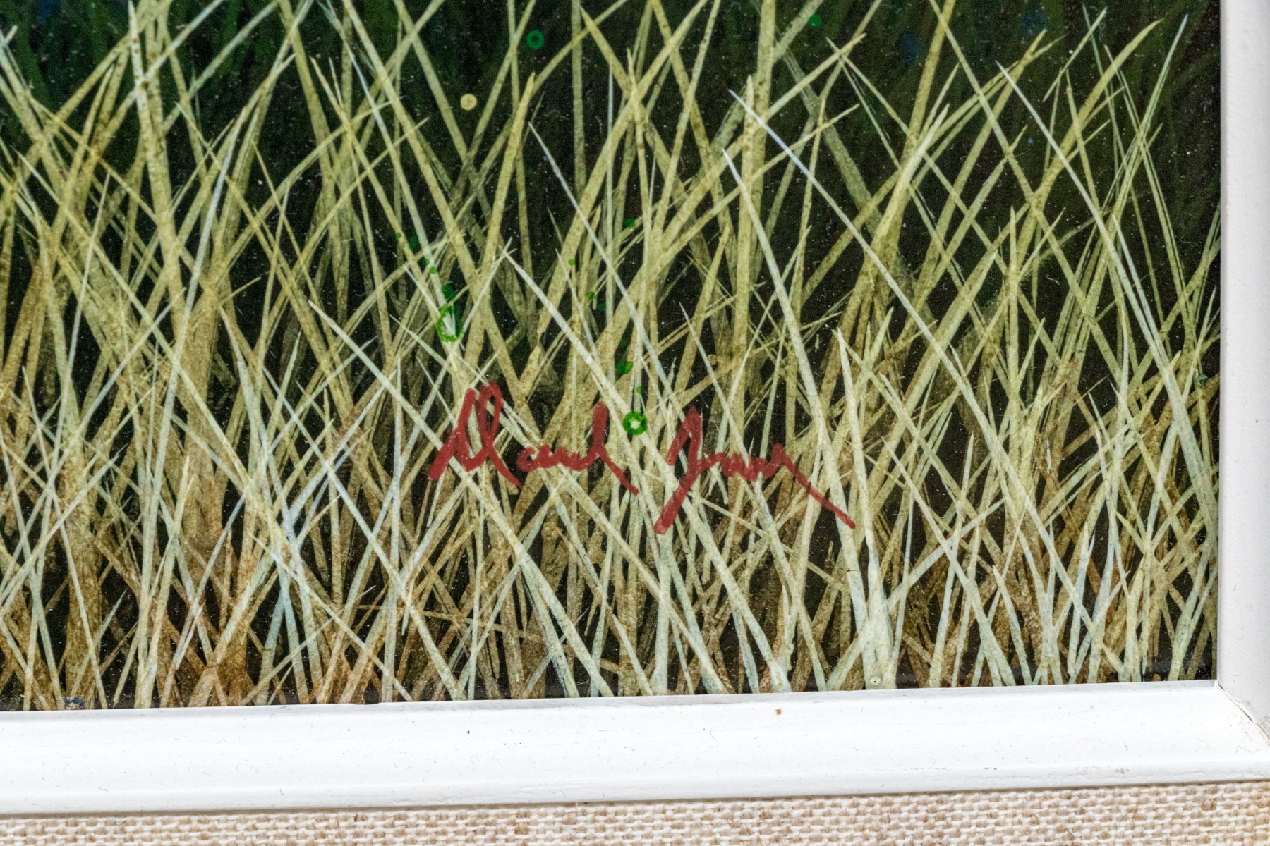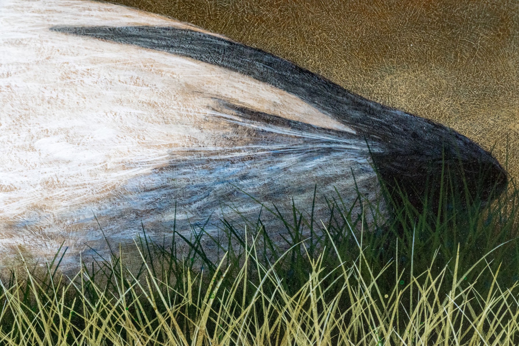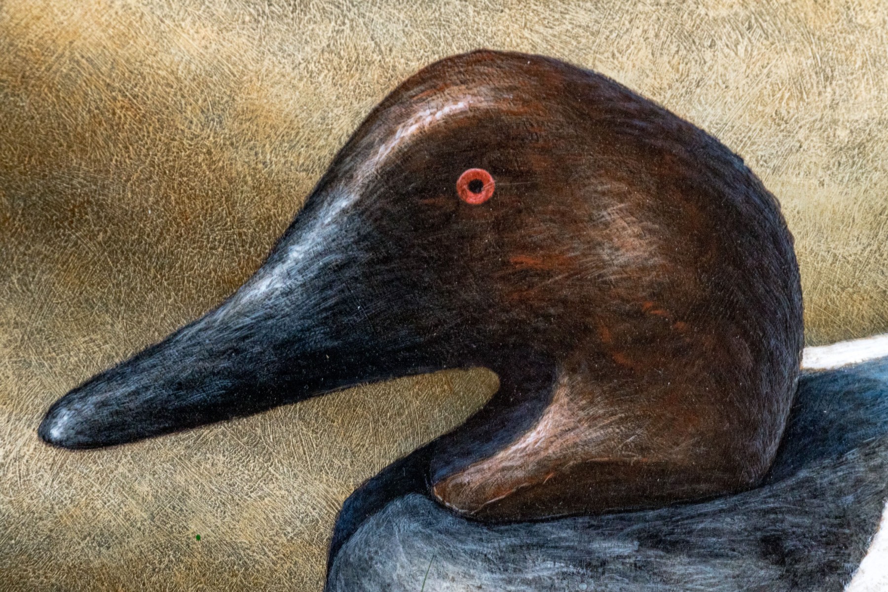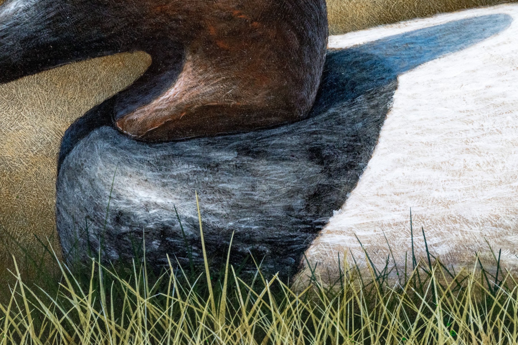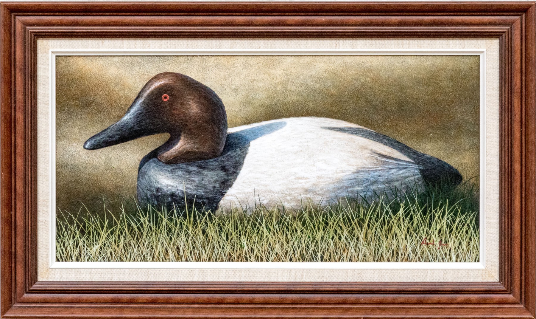 Signed indistinctly lower right, the wonderfully painted duck is depicted recumbent upon a bed of grass.