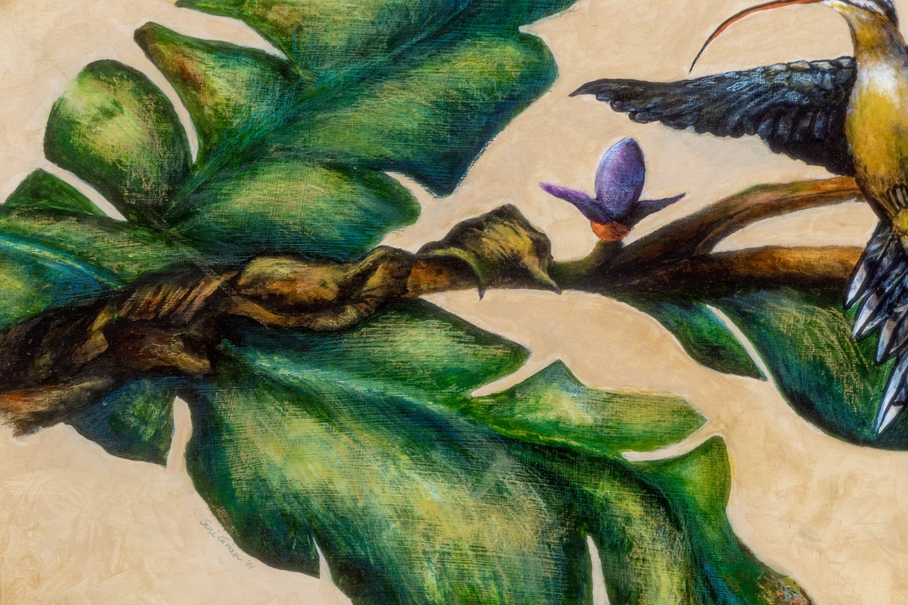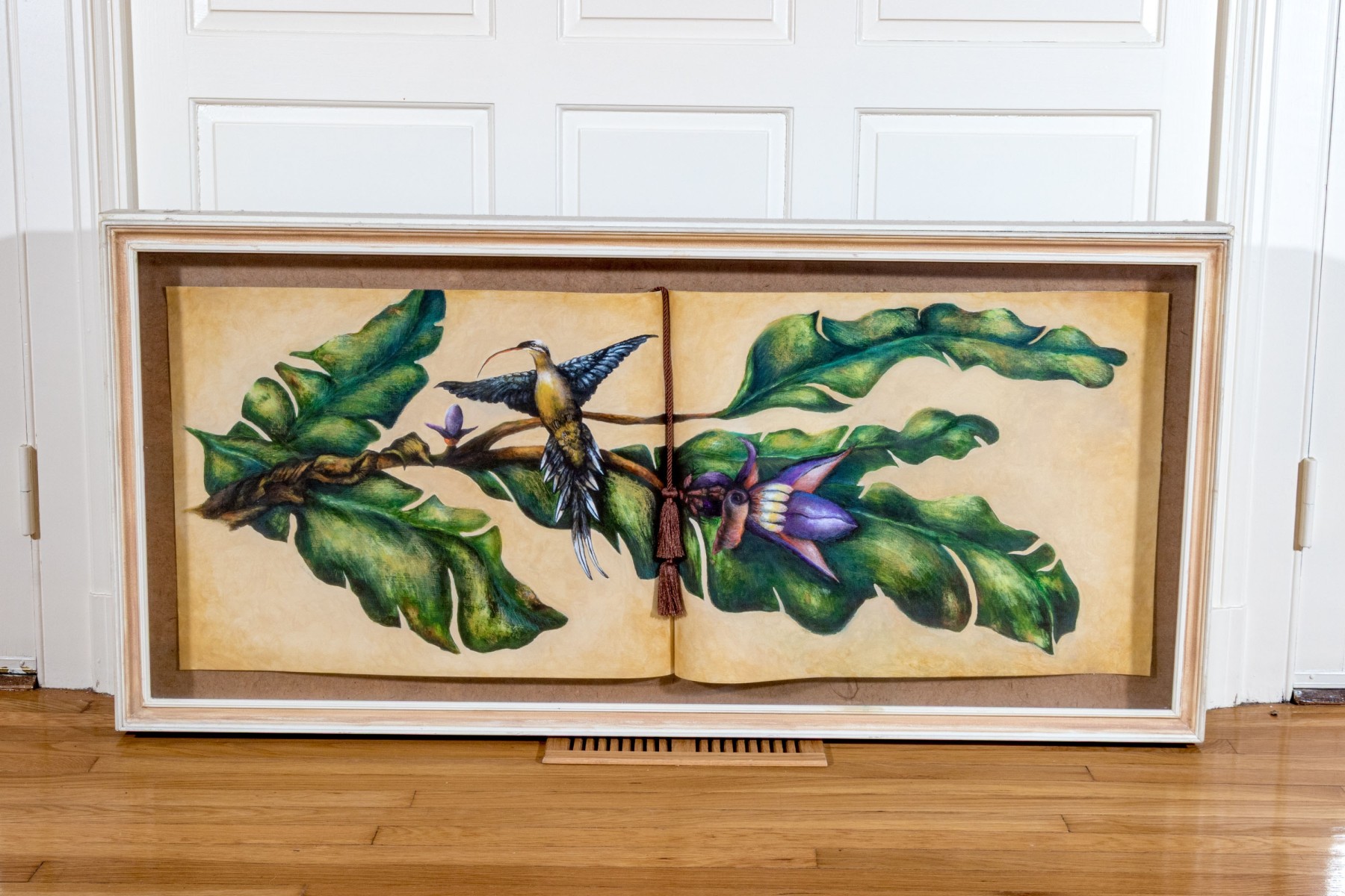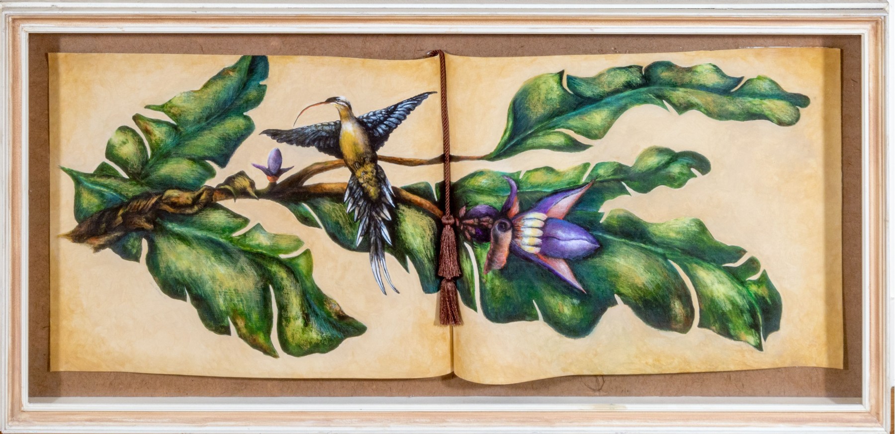 A masterfully rendered painting on paper diptych depicting a blue and yellow hummingbird perched on a branch with lush green and blue leaves with pretty purple flowers. The spread is designed as though an open book, finished with a tassel bookmark at the center. Signed potentially appearing Sari Cariker and dated '01.