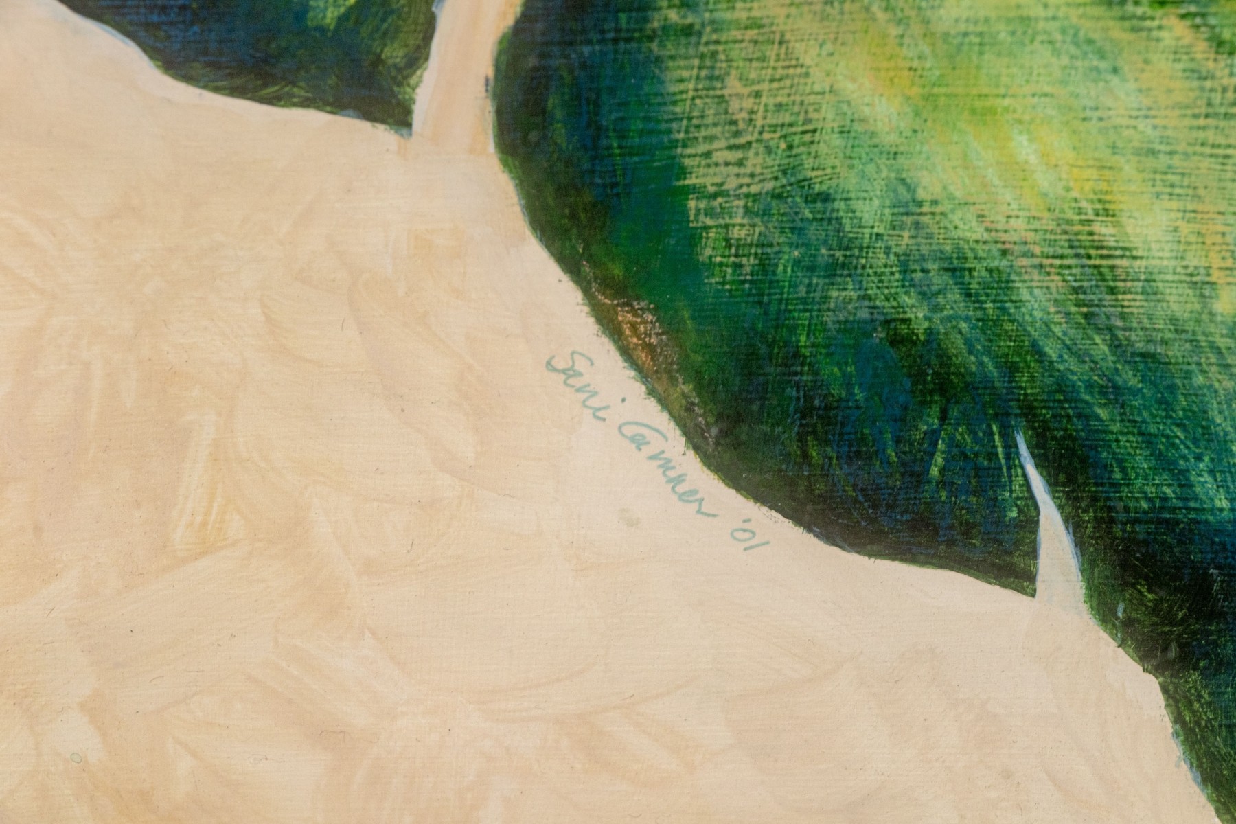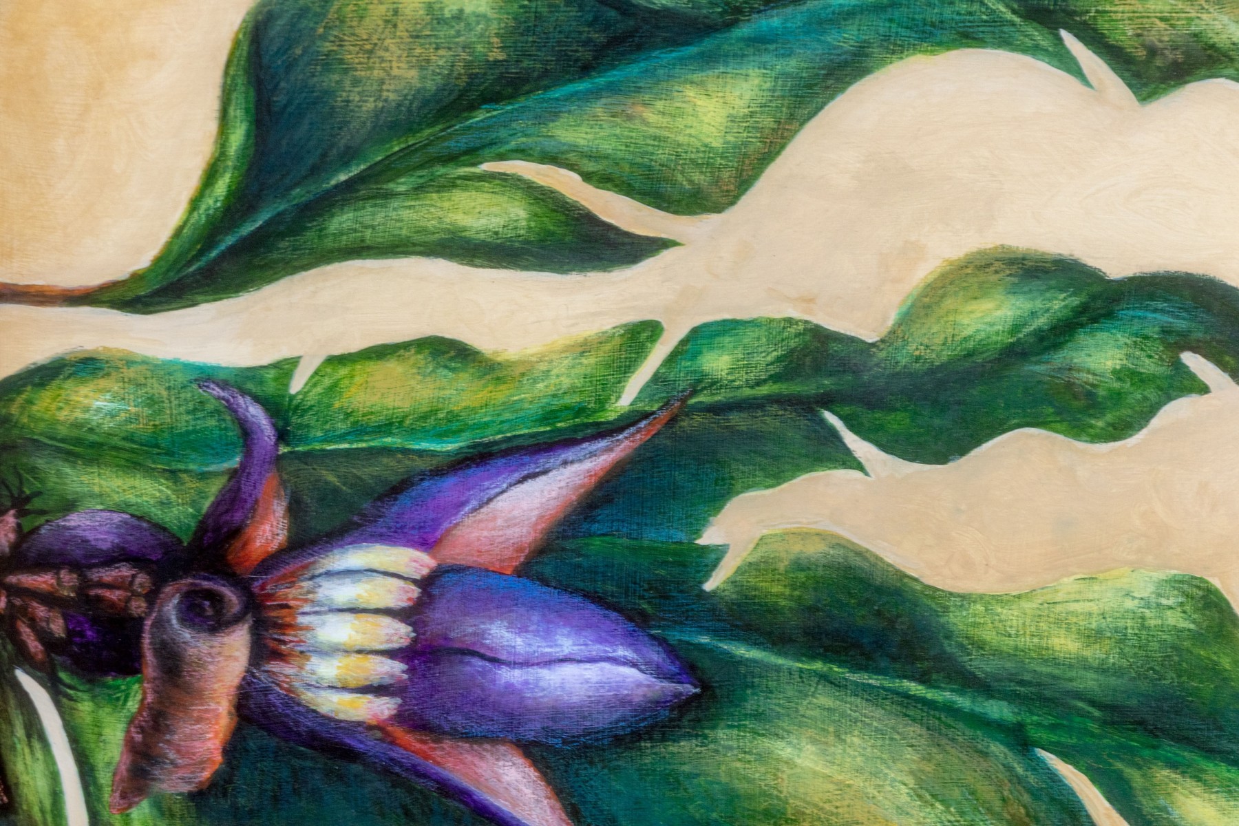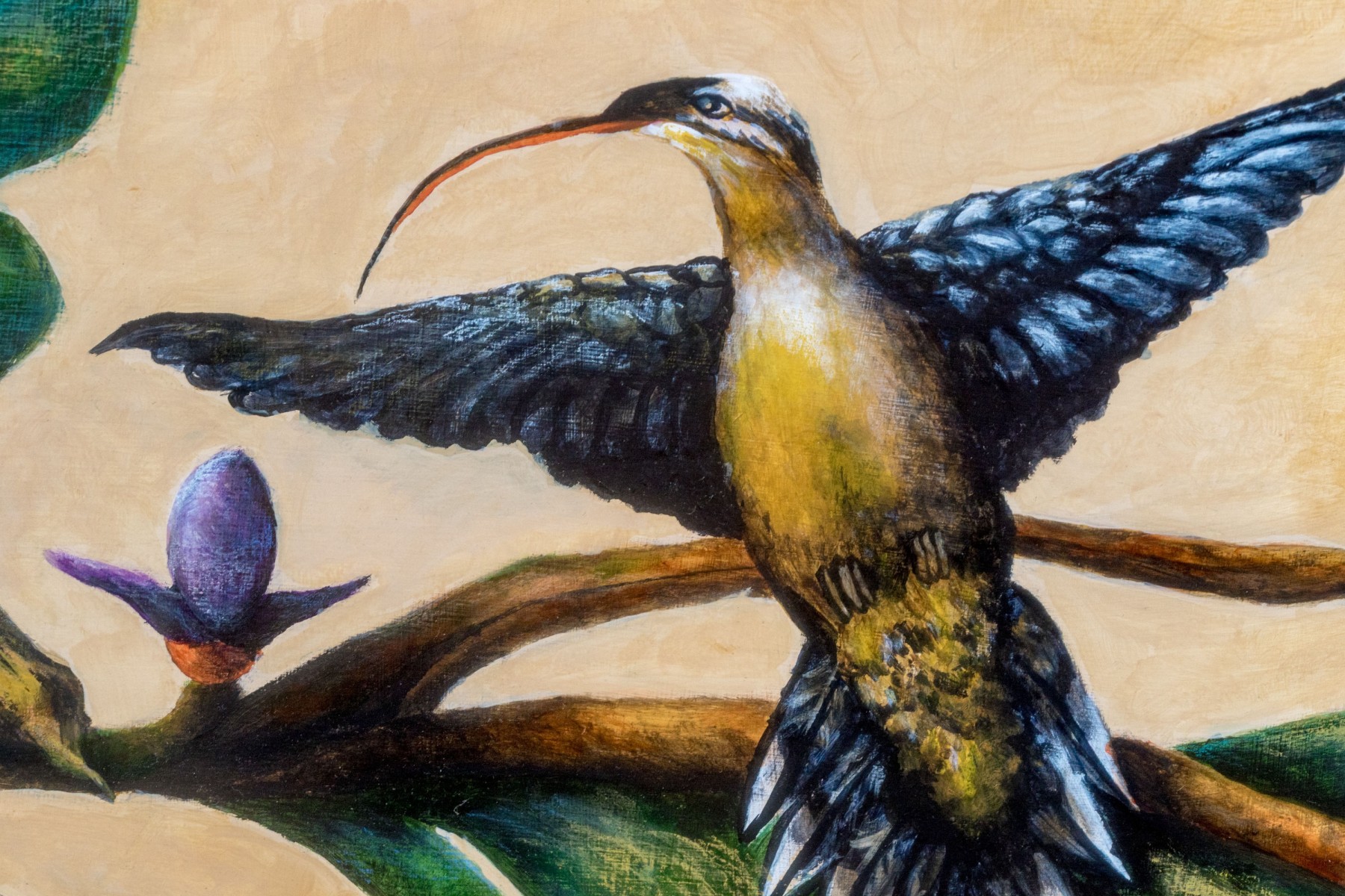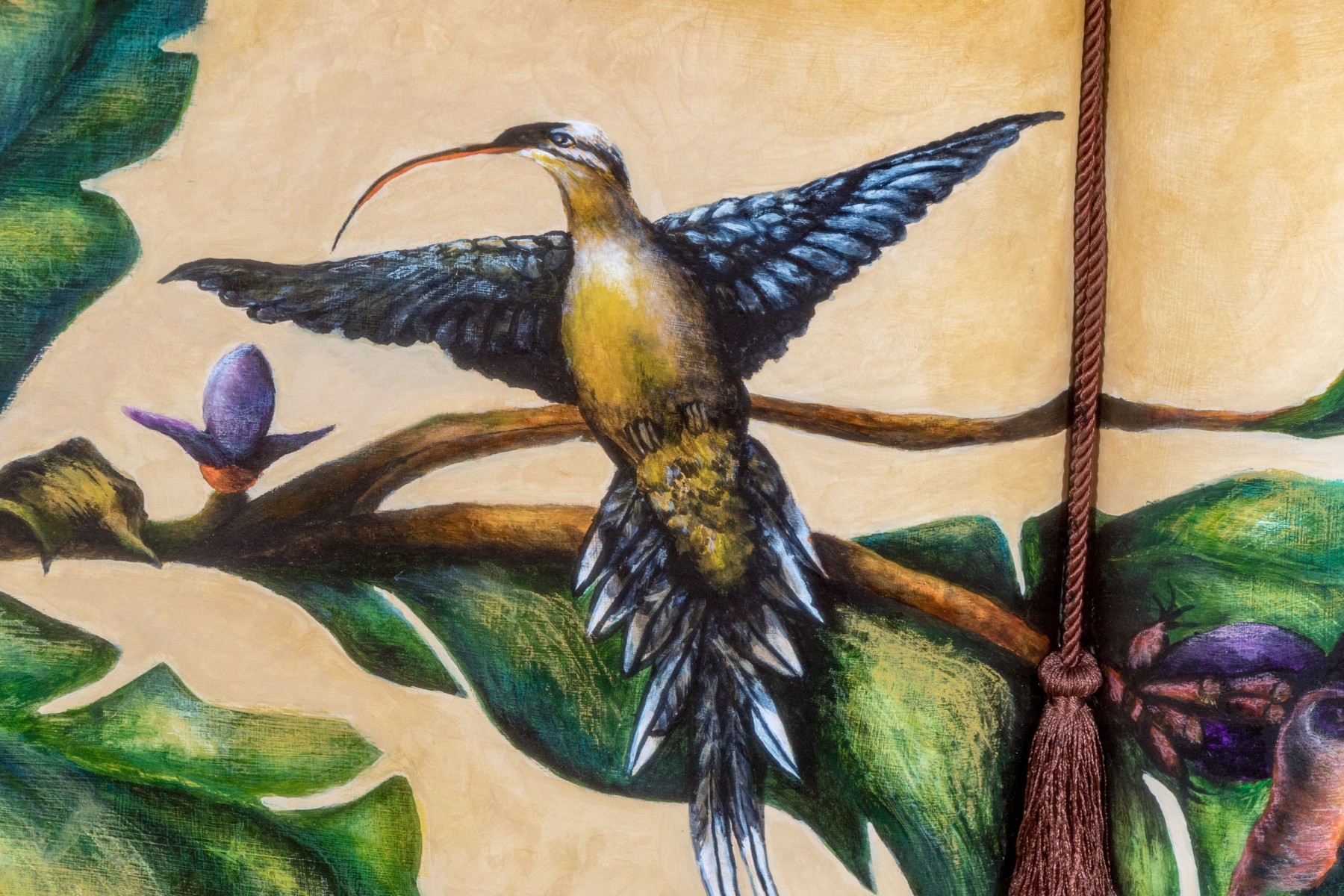 A masterfully rendered painting on paper diptych depicting a blue and yellow hummingbird perched on a branch with lush green and blue leaves with pretty purple flowers. The spread is designed as though an open book, finished with a tassel bookmark at the center. Signed potentially appearing Sari Cariker and dated '01.