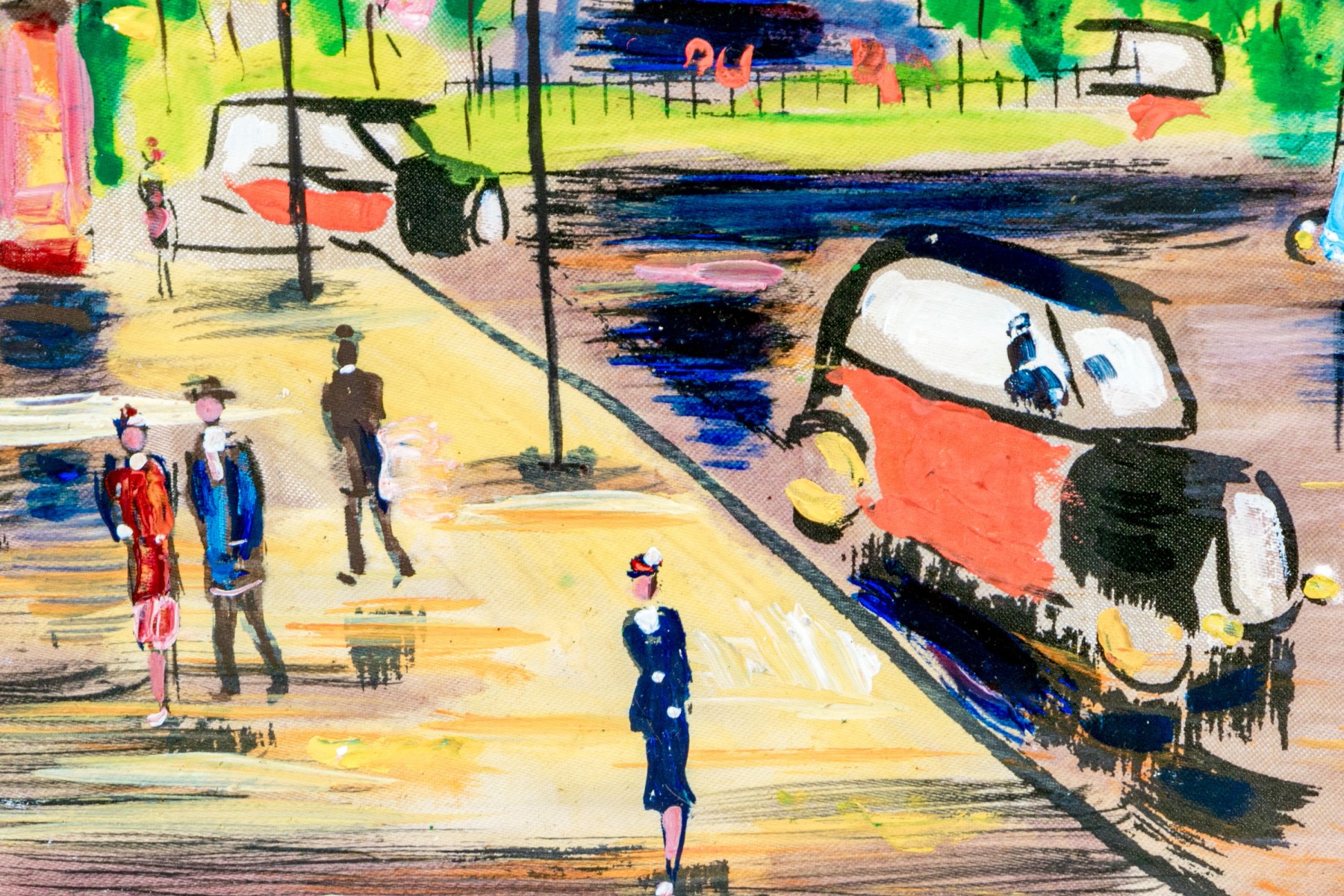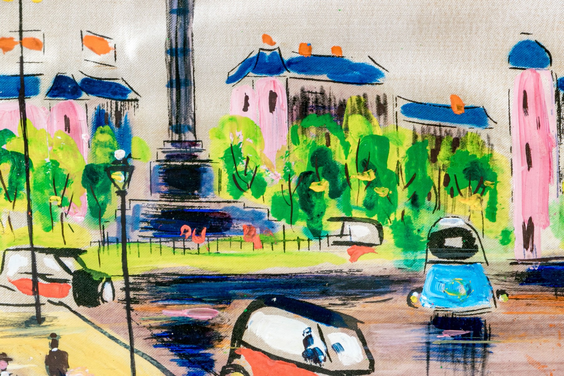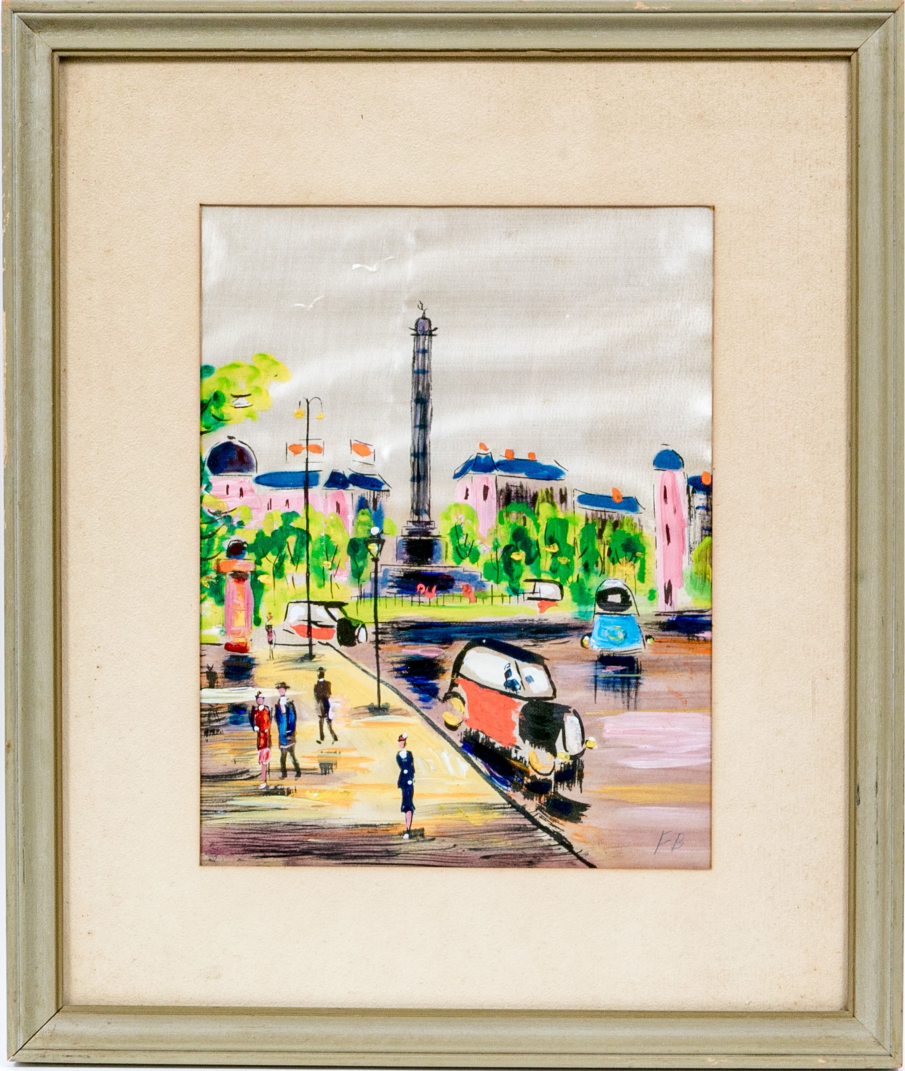 Monogrammed FB lower right. View of Place de la Concorde with figures and cars on the plaza. Presented in a painted wood frame with glass.