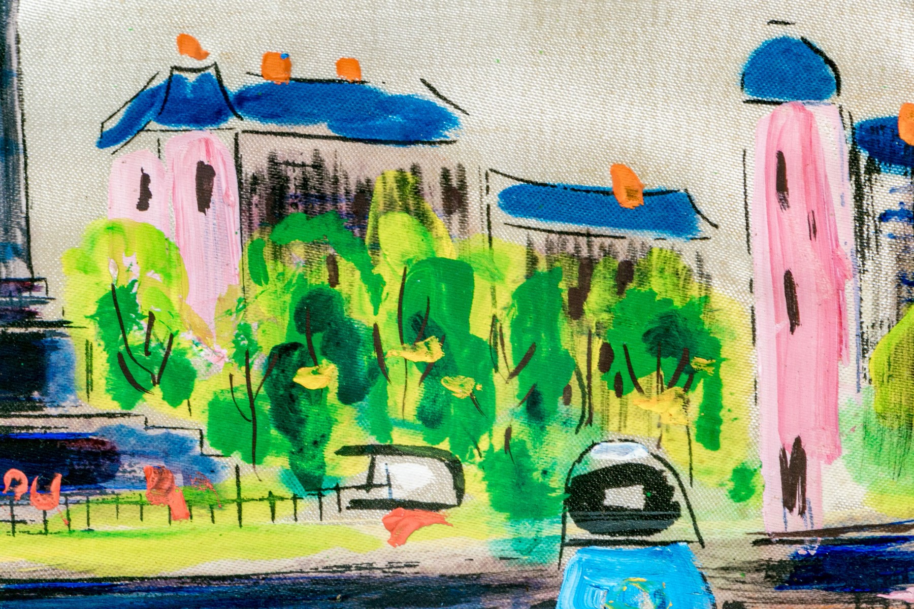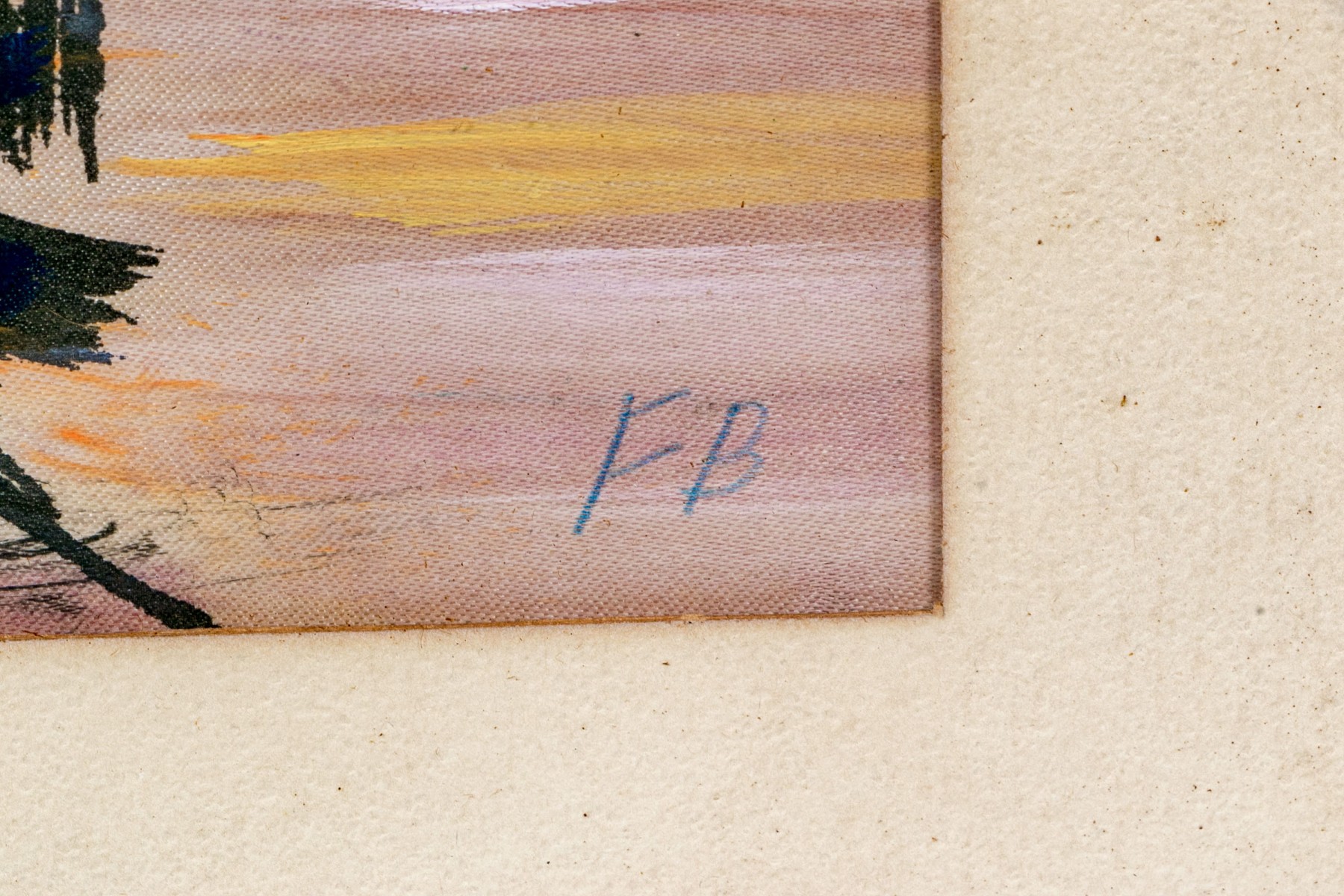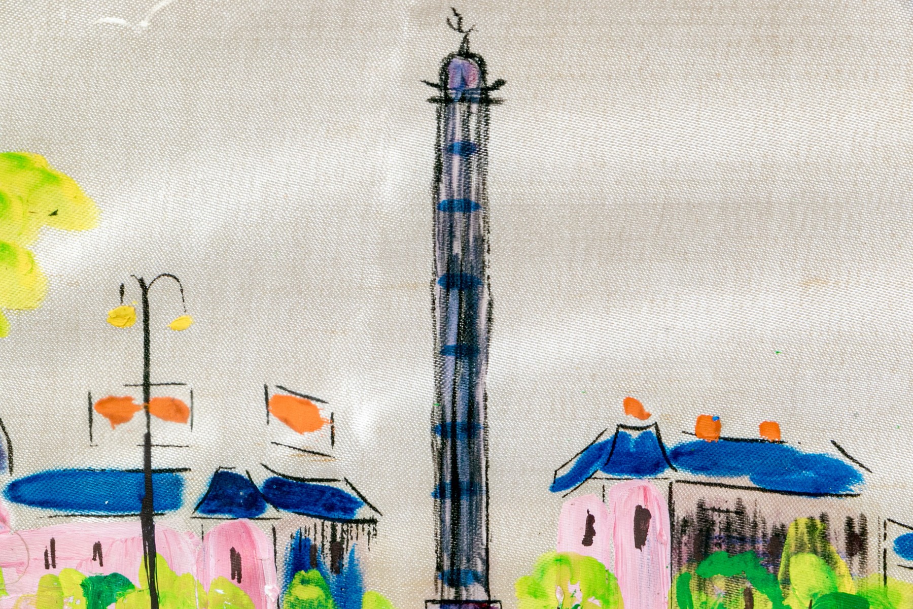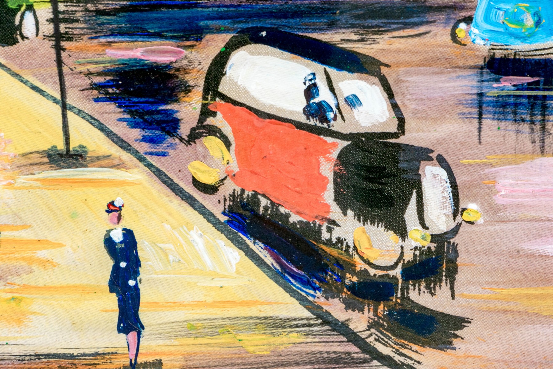 Monogrammed FB lower right. View of Place de la Concorde with figures and cars on the plaza. Presented in a painted wood frame with glass.