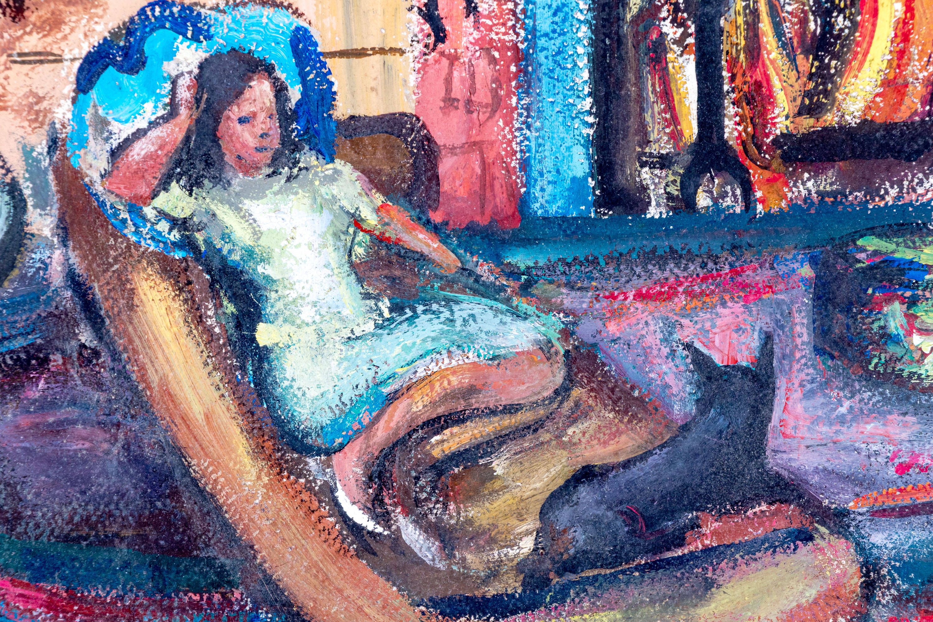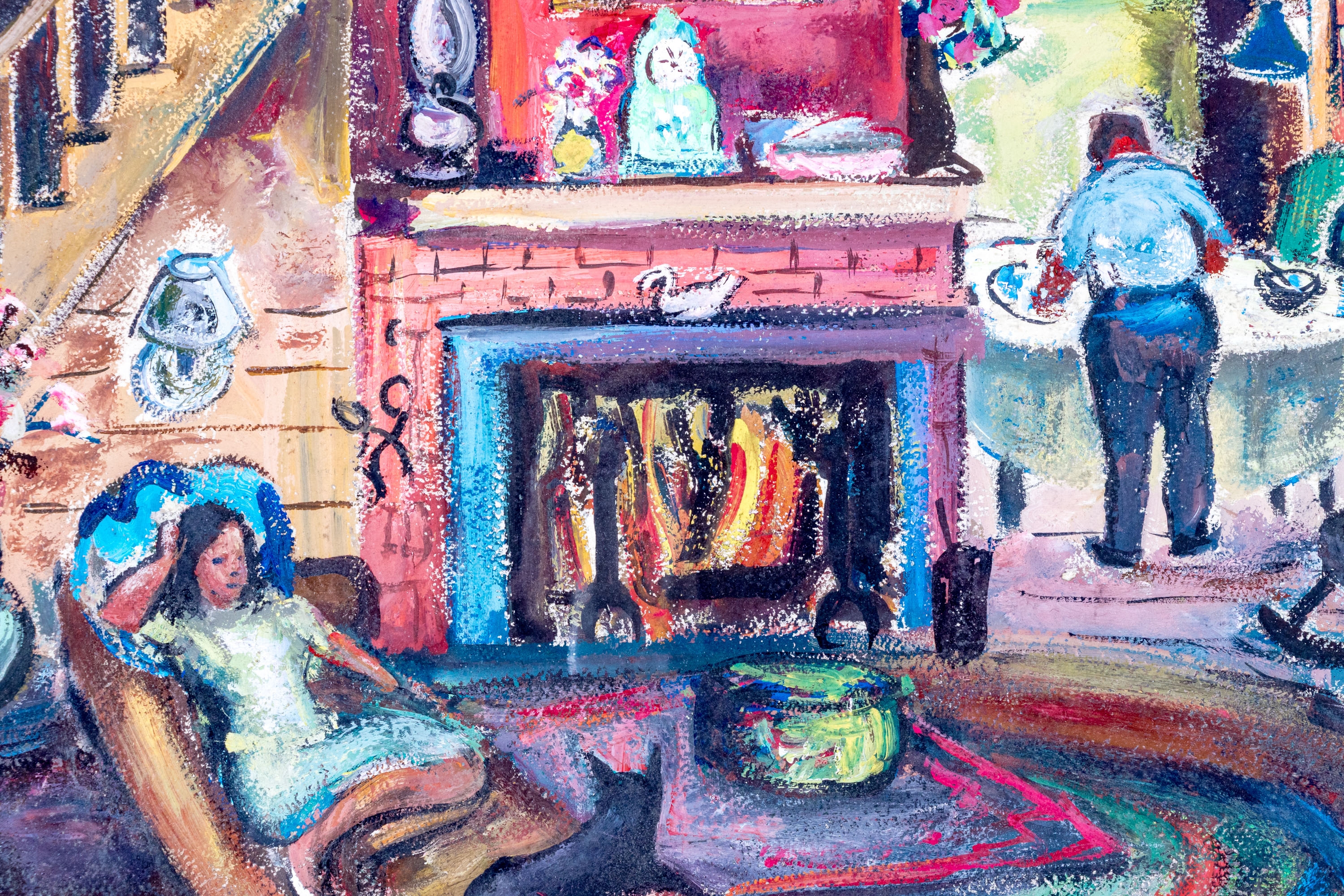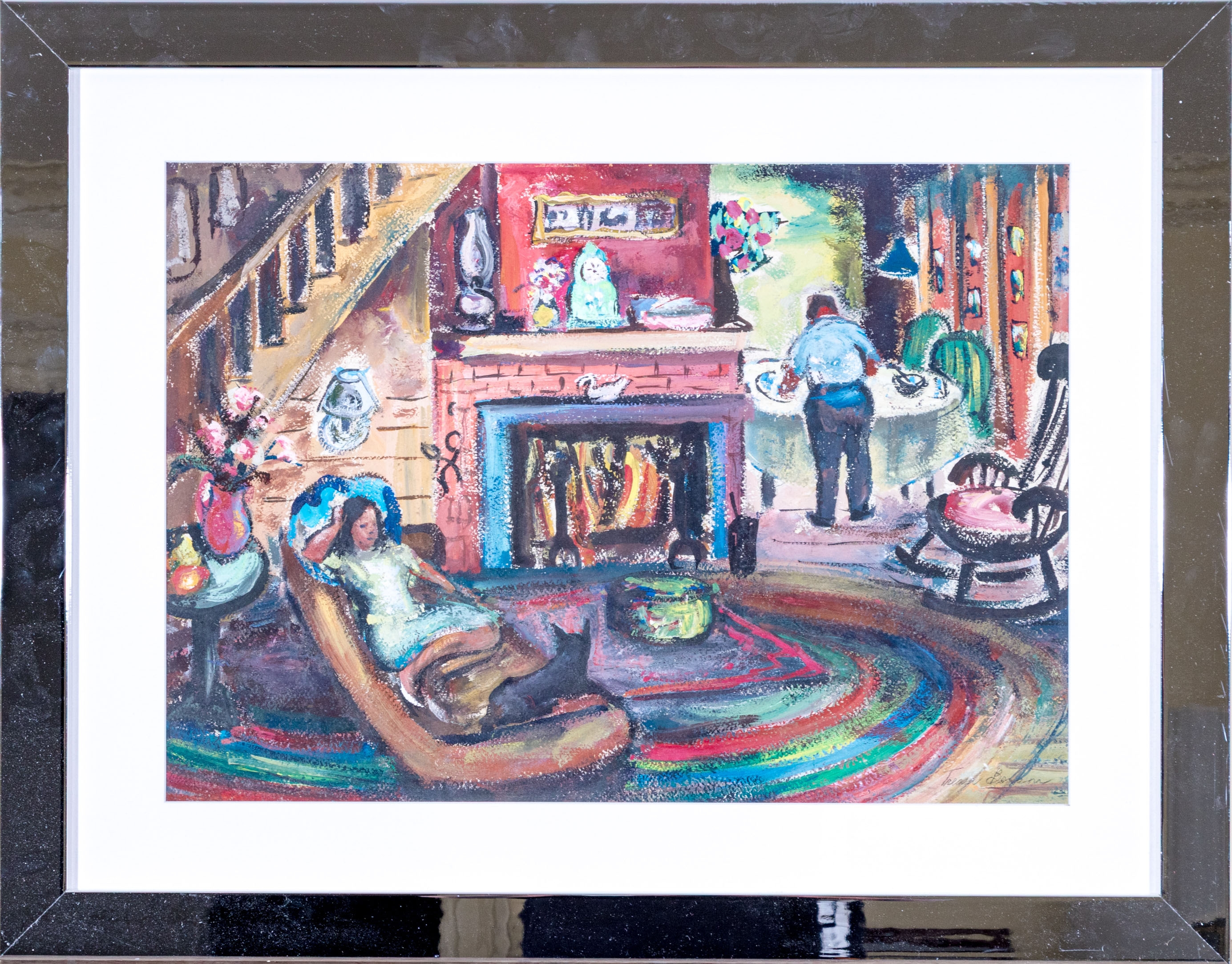 A wonderful pastel or crayon on paper illustration of an interior scene with a woman reclining on a brown couch with a black dog over a colorful striped round carpet in front of a fireplace, leading to a view of a man setting a white dining table with green chairs. Beautifully rendered with excellent character and expression. Pencil signed lower right.